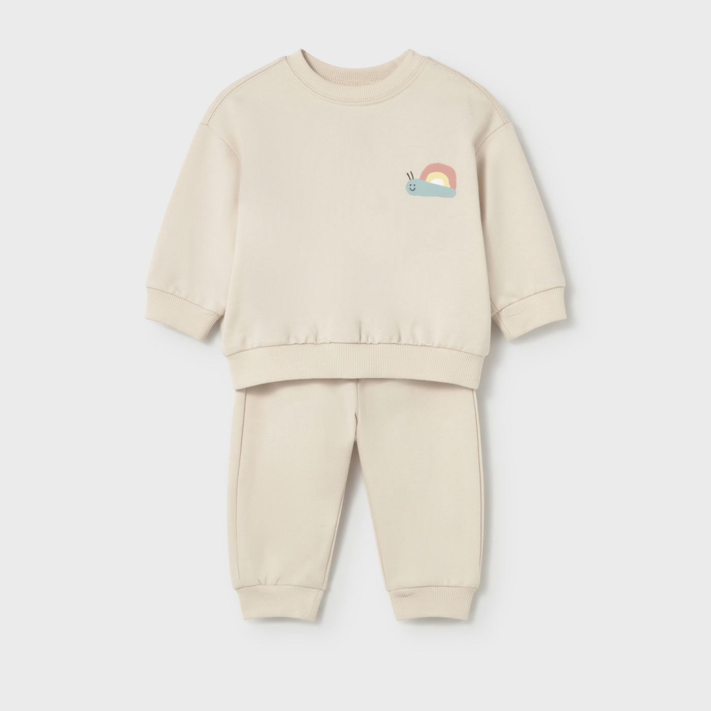 Η βρεφική φόρμα αχνούδιαστη Mayoral σε εκρού απόχρωση είναι η ιδανική επιλογή για άνετες εμφανίσεις του μωρού σας από τις πρώτες του ημέρες. Κατασκευασμένη από απαλό, ποιοτικό ύφασμα με εσωτερική αχνουδιά, προσφέρει θαλπωρή, ελευθερία κινήσεων και απόλυτη άνεση, τόσο στο σπίτι όσο και στις καθημερινές βόλτες.Το σετ περιλαμβάνει μπλούζα μακρυμάνικη και παντελόνι, σε minimal σχεδιασμό με γλυκό print σαλιγκαριού στο μπροστινό μέρος και παιχνιδιάρικο μήνυμα στην πλάτη, που χαρίζει τρυφερό και μοντέρνο χαρακτήρα. Η ουδέτερη εκρού απόχρωση το καθιστά εύκολο στο συνδυασμό και ιδανικό για κάθε περίσταση. Τα κουμπώματα στον ώμο διευκολύνουν το ντύσιμο, ενώ τα λάστιχα σε μέση και μανσέτες εξασφαλίζουν σταθερή εφαρμογή.
