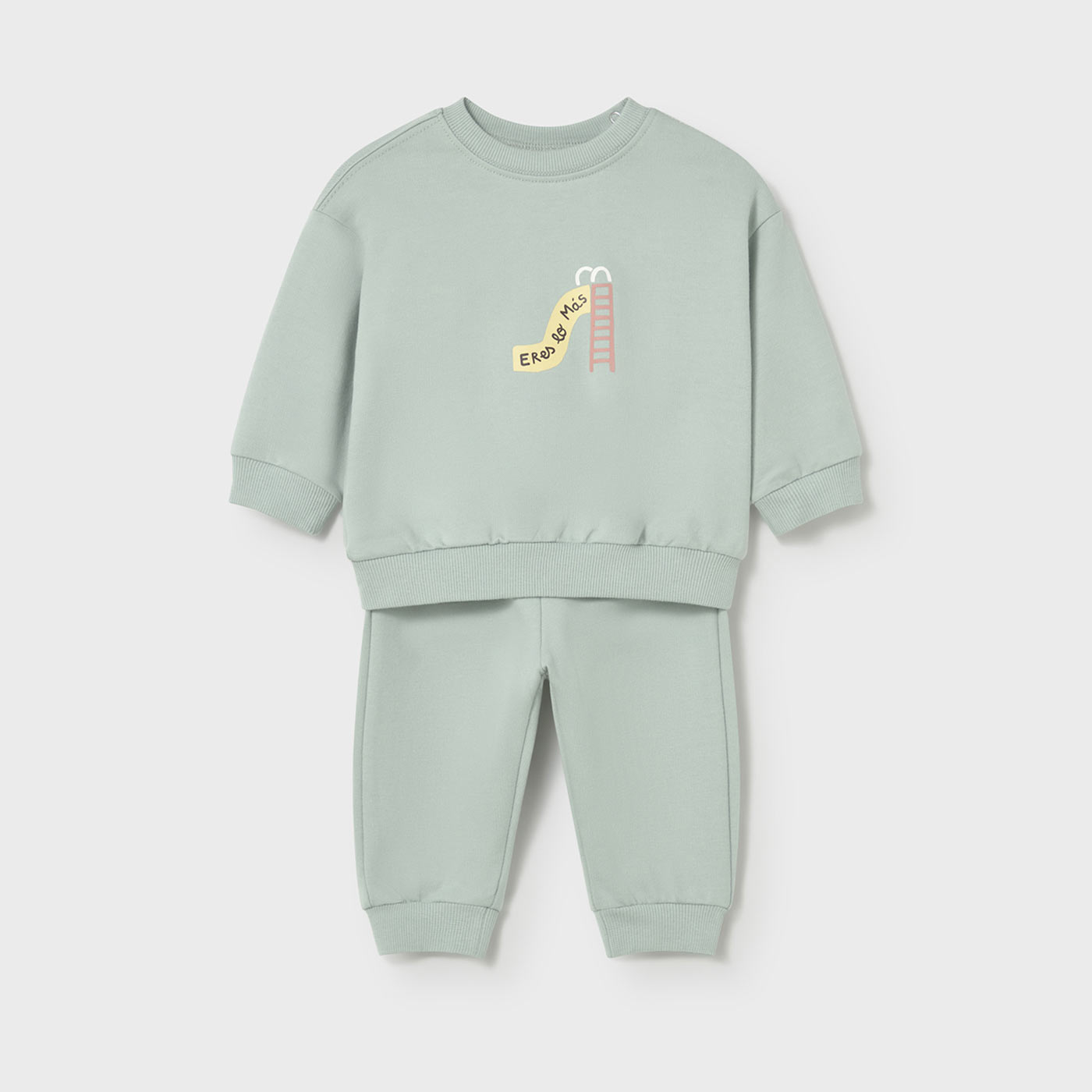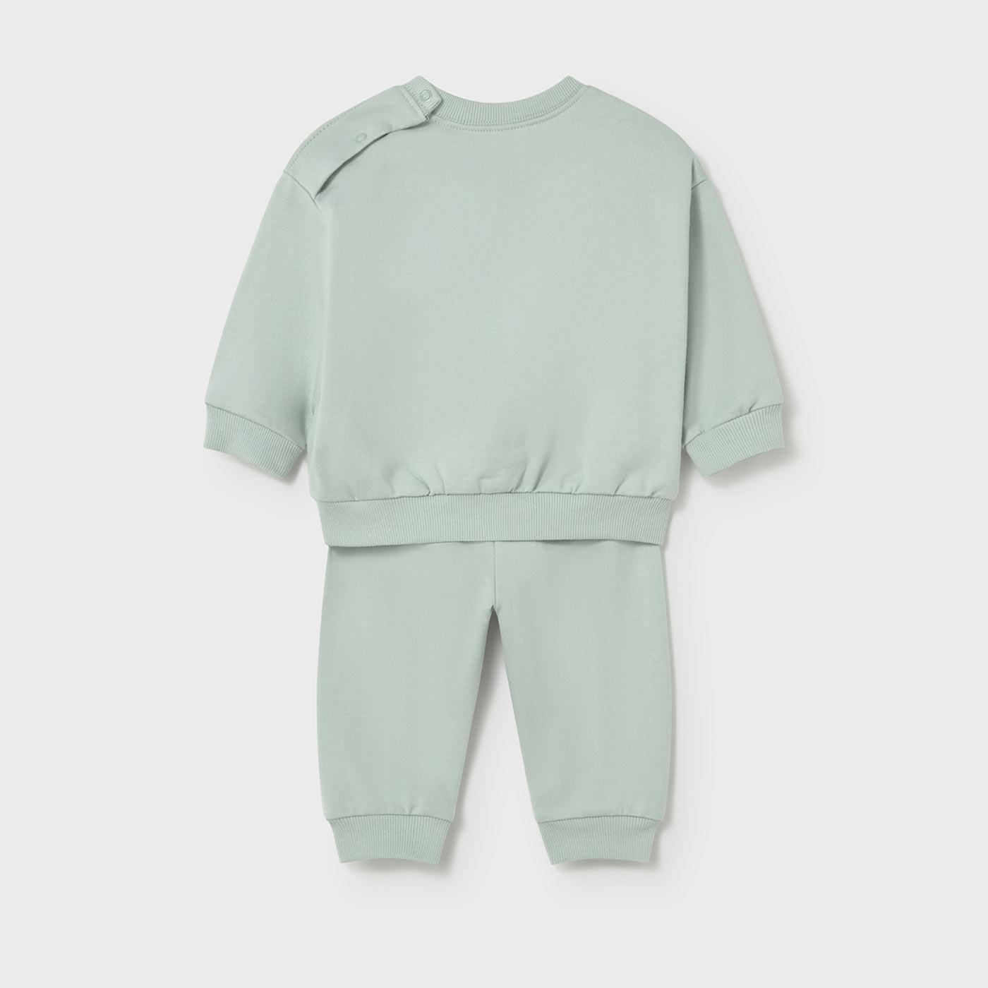Η βρεφική φόρμα Mayoral σε υπέροχη απόχρωση μέντας είναι η ιδανική επιλογή για άνετες εμφανίσεις από τις πρώτες κιόλας μέρες. Αποτελείται από μπλούζα και παντελόνι, κατασκευασμένα από απαλό, αχνούδιαστο ύφασμα που προσφέρει ζεστασιά χωρίς να βαραίνει, φροντίζοντας το ευαίσθητο βρεφικό δέρμα.Η μπλούζα διαθέτει στρογγυλή λαιμόκοψη με κουμπάκια στον ώμο για εύκολη εφαρμογή, καθώς και διακριτικό παιδικό τύπωμα στο μπροστινό μέρος που χαρίζει παιχνιδιάρικο χαρακτήρα. Το παντελόνι έχει άνετη γραμμή με ελαστική μέση και τελειώματα με λάστιχο, εξασφαλίζοντας σταθερή εφαρμογή και ελευθερία κινήσεων.Μια πρακτική και κομψή βρεφική φόρμα για αγόρια, ιδανική για καθημερινή χρήση, βόλτες και στιγμές ξεκούρασης στο σπίτι.