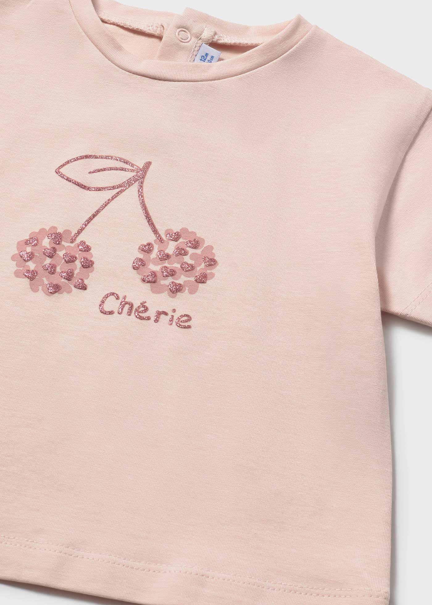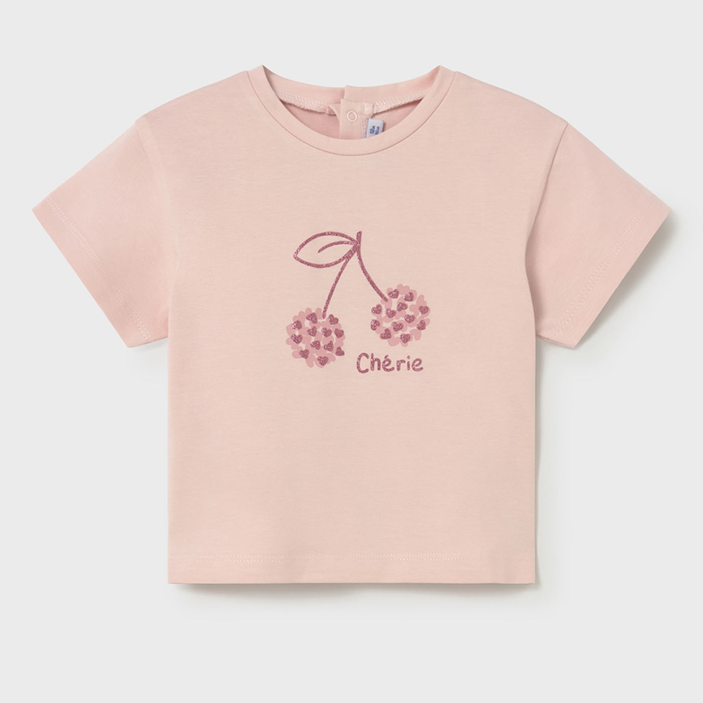 Η βρεφική μπλούζα για κορίτσια Mayoral σε απαλό ροζ χρώμα είναι η ιδανική επιλογή για καθημερινές εμφανίσεις με στυλ και άνεση. Κατασκευασμένη από μαλακό βαμβακερό ύφασμα υψηλής ποιότητας, προσφέρει ευχάριστη αίσθηση στο ευαίσθητο βρεφικό δέρμα και εξασφαλίζει άνεση όλη μέρα.Διακοσμείται με γλυκιά στάμπα κερασάκια και τη λέξη Cherie με διακριτικές γκλίτερ λεπτομέρειες, χαρίζοντας ρομαντικό και παιχνιδιάρικο χαρακτήρα. Το κοντομάνικο σχέδιο και η άνετη γραμμή την καθιστούν ιδανική για άνοιξη και καλοκαίρι, ενώ το κούμπωμα στο πίσω μέρος διευκολύνει το ντύσιμο και την αλλαγή.Συνδυάζεται εύκολα με κολάν, σορτσάκι ή φούστα και αποτελεί εξαιρετική επιλογή τόσο για καθημερινές βόλτες όσο και για δώρο.