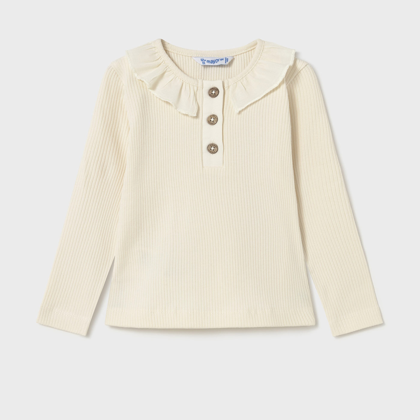 Η βρεφική μπλούζα μακρυμάνικη πόλο ριπ για κορίτσια Mayoral σε κρεμ απόχρωση συνδυάζει κομψότητα και άνεση, αποτελώντας ιδανική επιλογή για τις καθημερινές αλλά και πιο ιδιαίτερες εμφανίσεις. Κατασκευασμένη από απαλό βαμβακερό ύφασμα με ελαστική υφή rib, προσφέρει ζεστασιά και άνετη εφαρμογή, ιδανική για τις φθινοπωρινές και χειμερινές ημέρες.