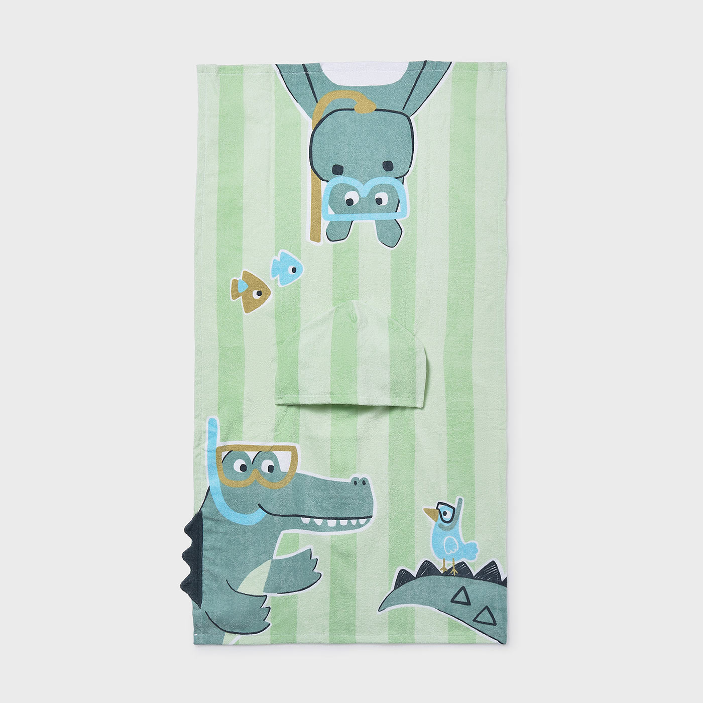 Το χαριτωμένο σχέδιο με ζωάκια και θαλάσσιο θέμα, σε συνδυασμό με τις διακριτικές ρίγες, μετατρέπει τη ρουτίνα του μπάνιου σε μια ευχάριστη εμπειρία για το μωρό και τους γονείς. Η πρακτική κουκούλα κρατά το κεφαλάκι ζεστό, ενώ η άνετη εφαρμογή επιτρέπει εύκολο τύλιγμα.