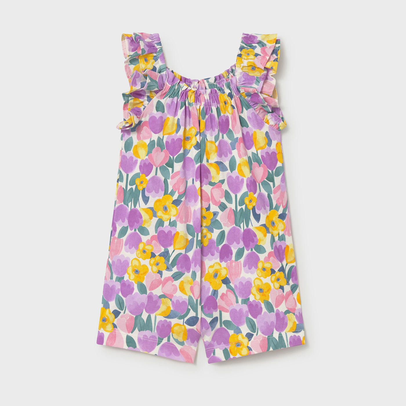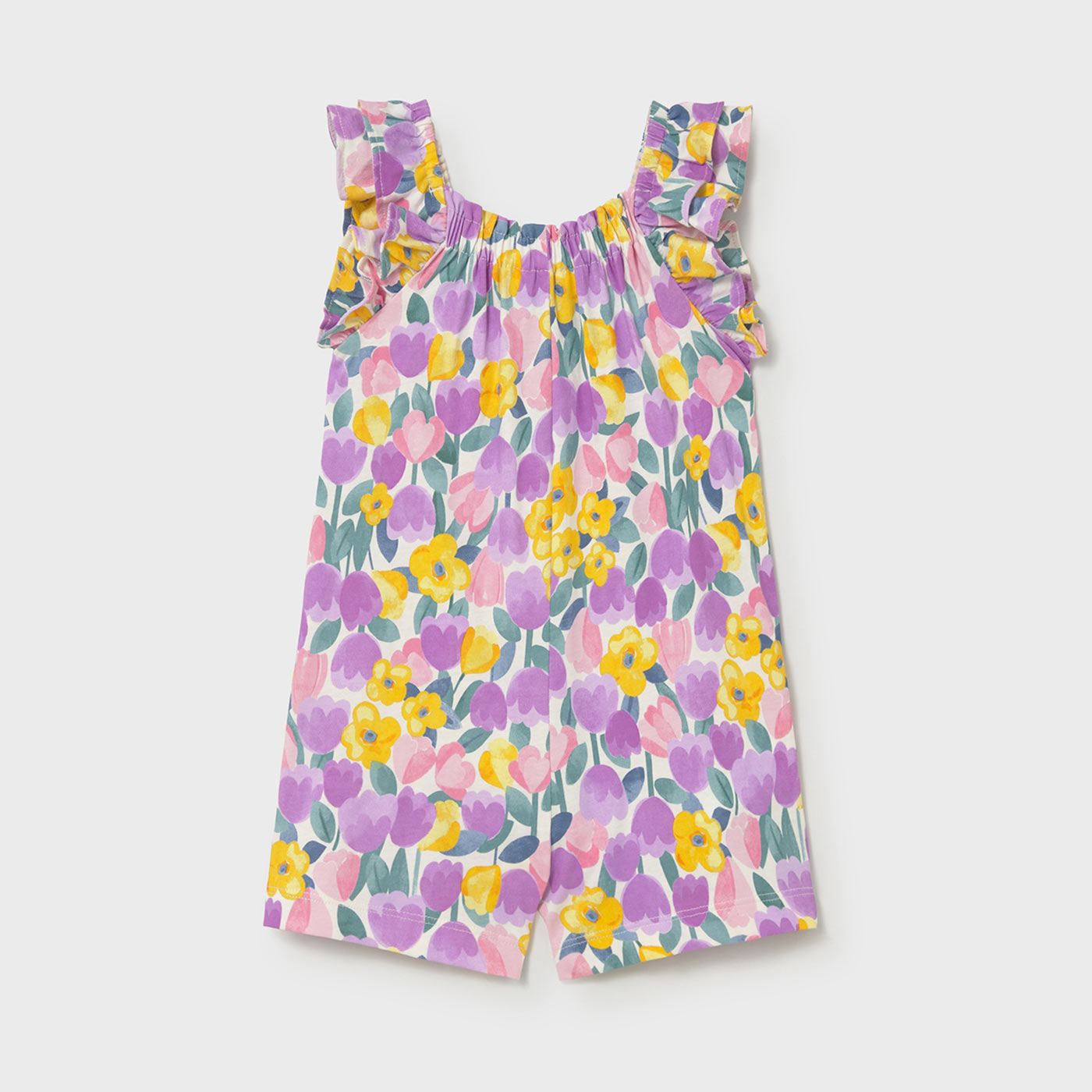 Απαλή, δροσερή και γεμάτη χρώμα, αυτή η βρεφική ολόσωμη φόρμα Mayoral είναι η ιδανική επιλογή για τις καλοκαιρινές εμφανίσεις της μικρής σας. Με ρομαντικό φλοράλ σχέδιο σε λιλά, ροζ, κίτρινες και πράσινες αποχρώσεις, χαρίζει μια χαρούμενη και κομψή αισθητική που ξεχωρίζει.Κατασκευασμένη από βαμβακερό μακό ύφασμα, προσφέρει άνεση και σωστή διαπνοή, ιδανική για το ευαίσθητο βρεφικό δέρμα. Οι βολάν τιράντες και η ελαστική λαιμόκοψη προσθέτουν girly χαρακτήρα και διευκολύνουν την εφαρμογή, ενώ το κούμπωμα με τρουκς στο κάτω μέρος εξασφαλίζει πρακτικότητα στο άλλαγμα πάνας.