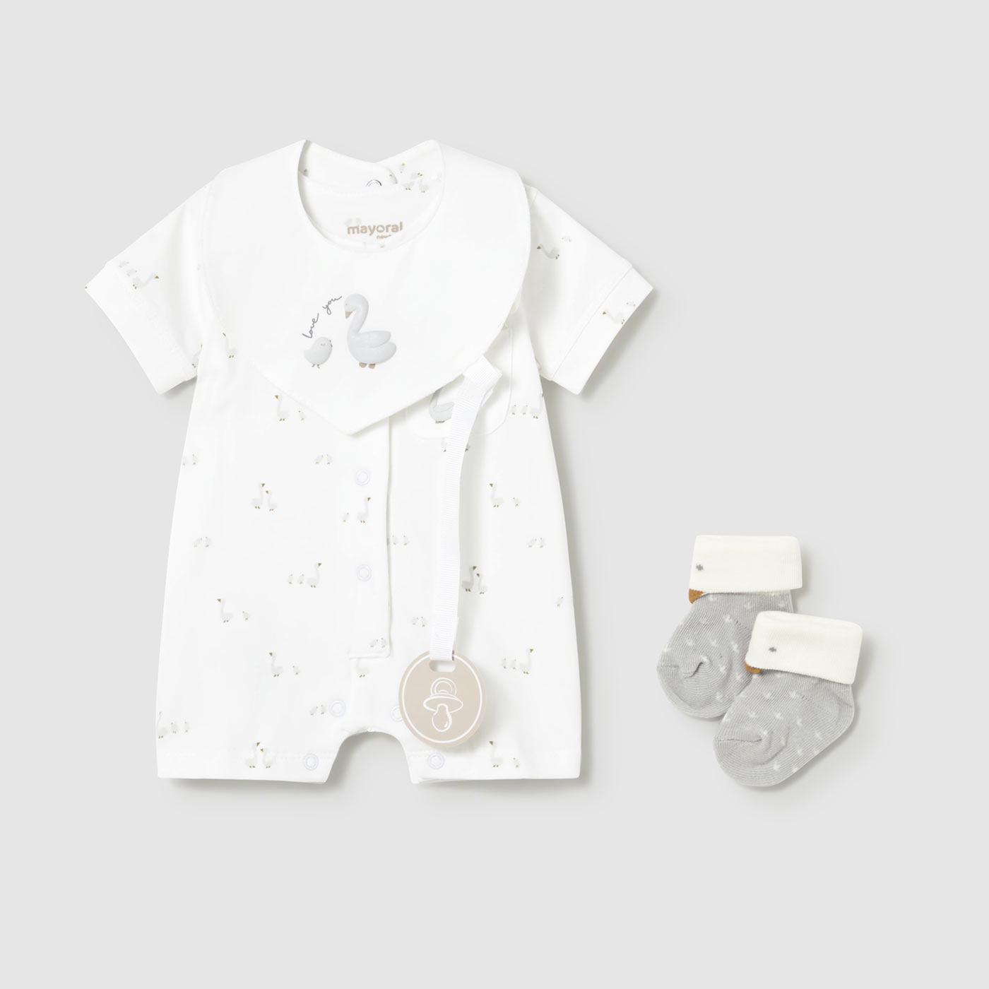 Το σετ αποτελείται από κοντομάνικο φορμάκι-πυτζάμα με μπροστινό κούμπωμα με τρουκς για εύκολη αλλαγή και αποσπώμενη σαλιάρα με χαριτωμένο σχέδιο κύκνου. Συνοδεύεται από απαλές βρεφικές καλτσούλες, ολοκληρώνοντας ένα πρακτικό και κομψό σύνολο, ιδανικό και ως δώρο.