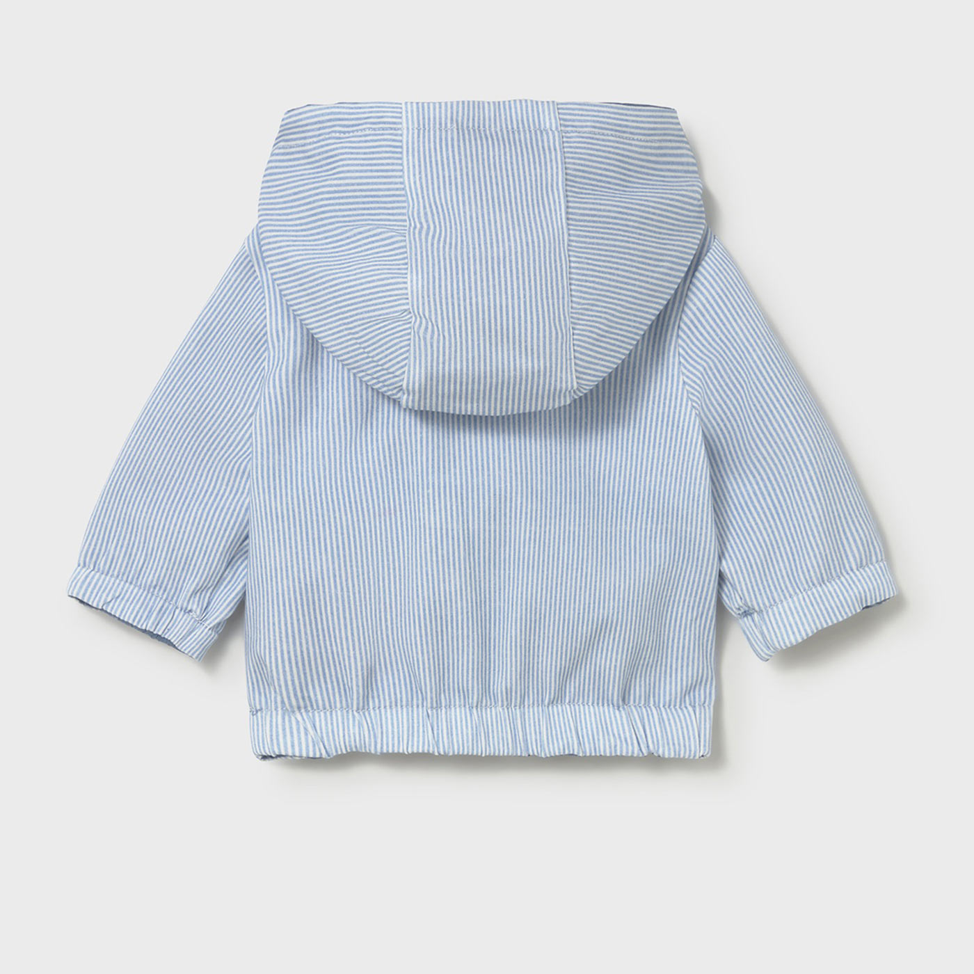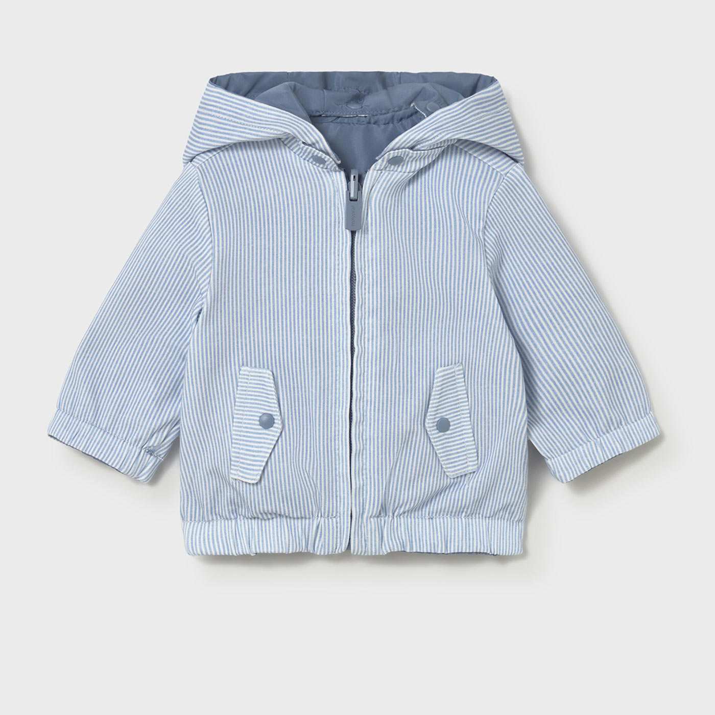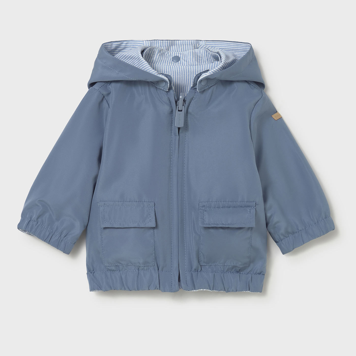 Η εξωτερική πλευρά είναι αντιανεμική και ελαφριά, ιδανική για βόλτες με αέρα ή δροσερό καιρό, ενώ το εσωτερικό διαθέτει απαλή βαμβακερή επένδυση με διακριτικό ριγέ μοτίβο, φιλική προς το ευαίσθητο βρεφικό δέρμα. Η κουκούλα, το φερμουάρ σε όλο το μήκος και τα ελαστικά τελειώματα στα μανίκια και στη μέση εξασφαλίζουν άνετη εφαρμογή και σωστή προστασία.