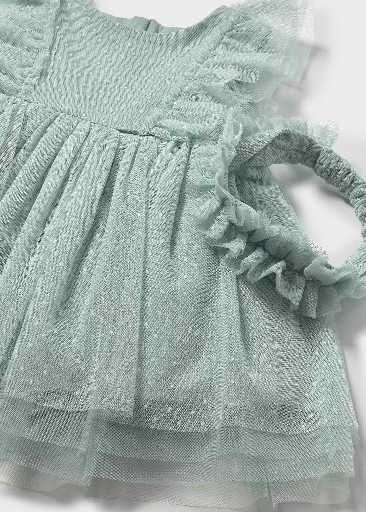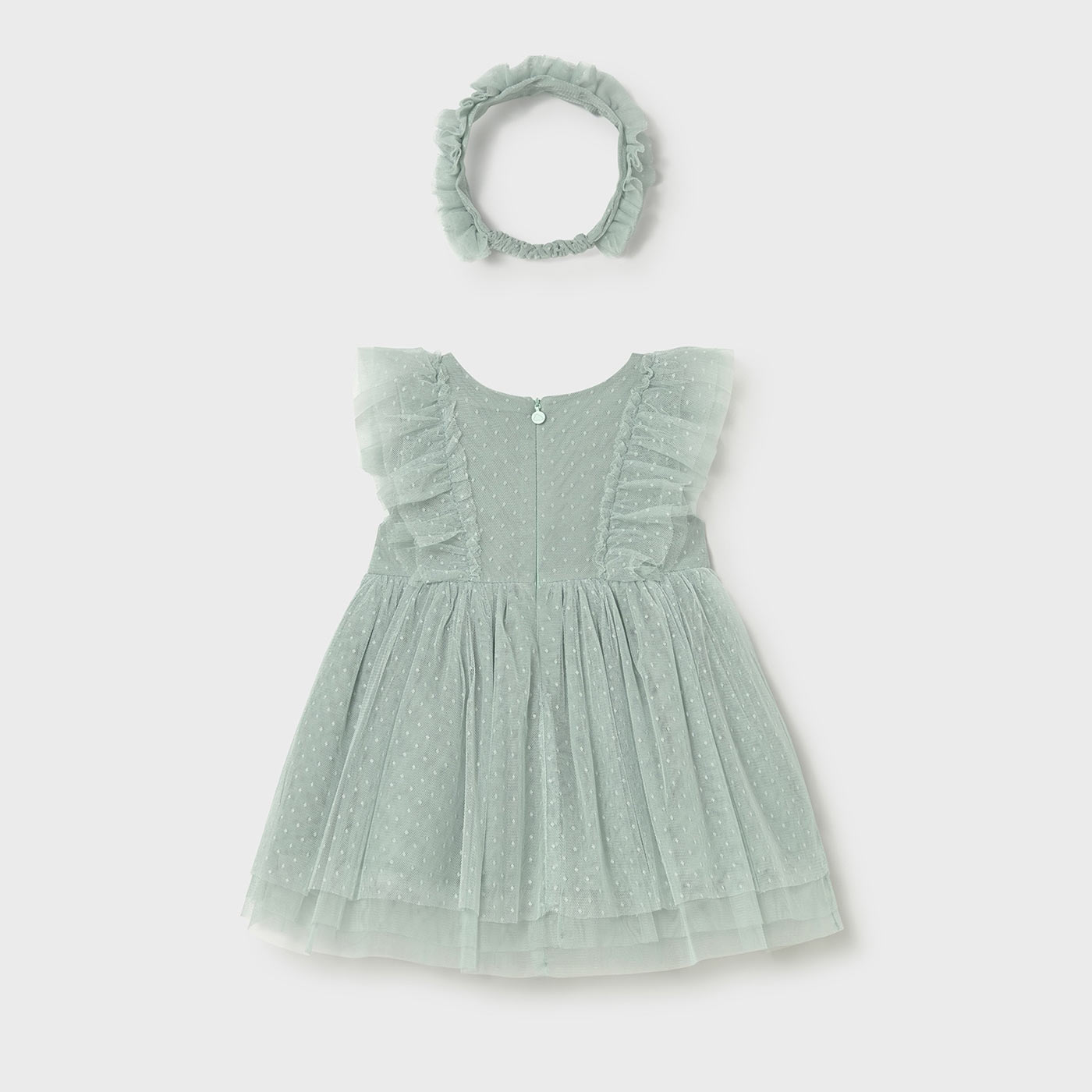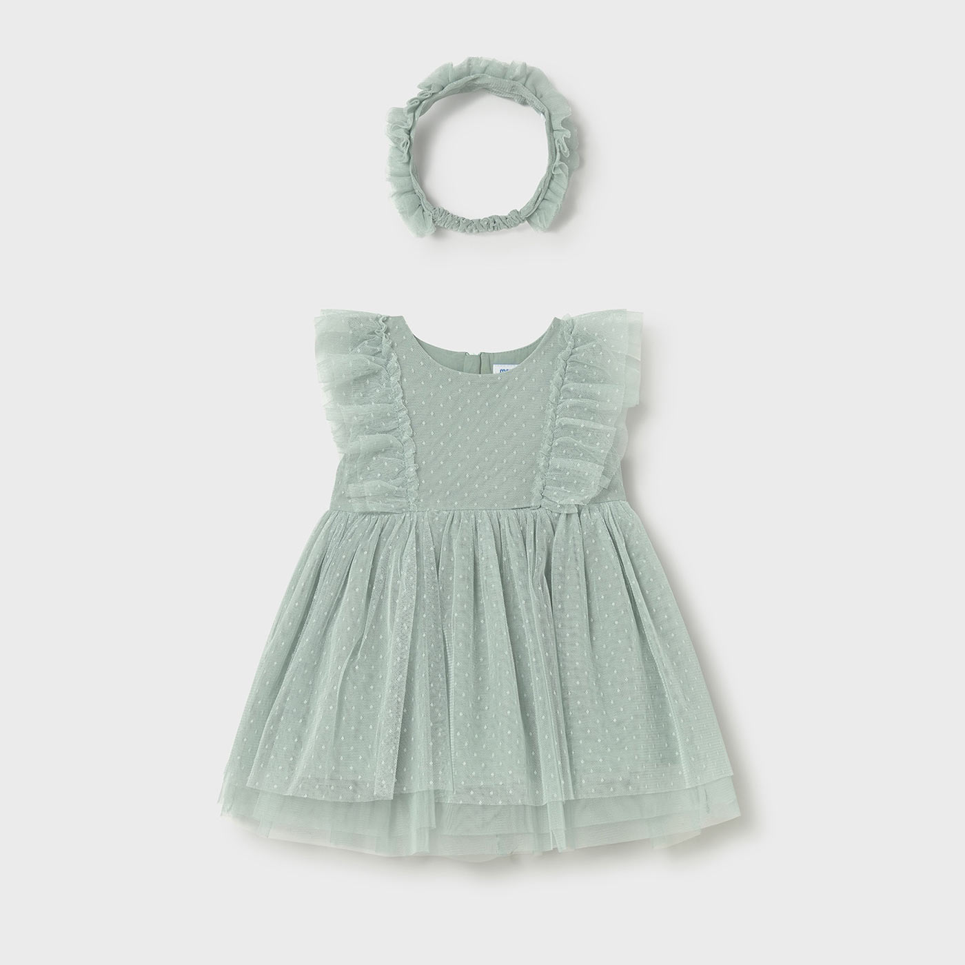 Το βρεφικό φόρεμα Mayoral σε κομψή φυστικί απόχρωση είναι μια υπέροχη επιλογή για ιδιαίτερες στιγμές που απαιτούν στυλ και τρυφερότητα. Με αέρινο σχεδιασμό και προσεγμένες λεπτομέρειες, χαρίζει ρομαντική εμφάνιση χωρίς να στερείται άνεσης.Το φόρεμα είναι κατασκευασμένο από απαλό τούλι με διακριτικό πουά, με εσωτερική βαμβακερή φόδρα για άνετη εφαρμογή και προστασία της ευαίσθητης βρεφικής επιδερμίδας. Τα βολάν στους ώμους προσθέτουν κομψότητα, ενώ η ασορτί κορδέλα μαλλιών συμπληρώνει τέλεια το σύνολο. Διαθέτει κλείσιμο στο πίσω μέρος για εύκολο ντύσιμο.