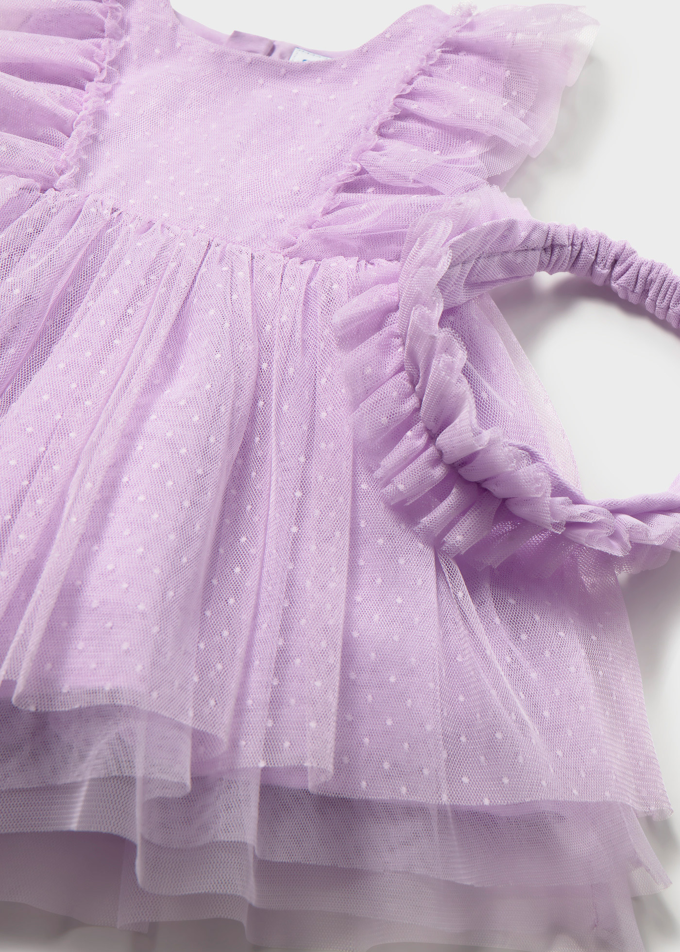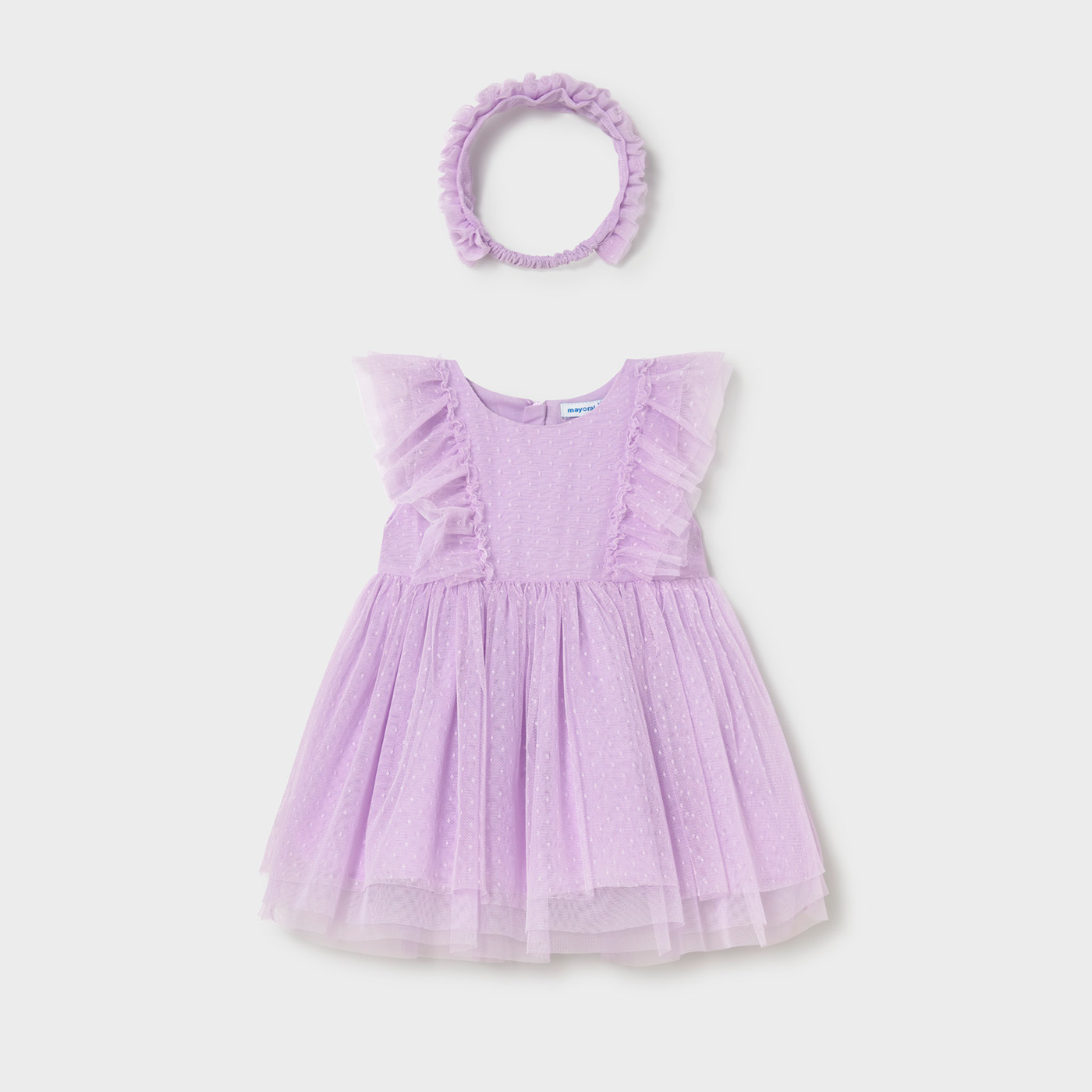 Το βρεφικό φόρεμα Mayoral σε κομψή λιλά απόχρωση είναι μια υπέροχη επιλογή για ιδιαίτερες στιγμές που απαιτούν στυλ και τρυφερότητα. Με αέρινο σχεδιασμό και προσεγμένες λεπτομέρειες, χαρίζει ρομαντική εμφάνιση χωρίς να στερείται άνεσης.Το φόρεμα είναι κατασκευασμένο από απαλό τούλι με διακριτικό πουά, με εσωτερική βαμβακερή φόδρα για άνετη εφαρμογή και προστασία της ευαίσθητης βρεφικής επιδερμίδας. Τα βολάν στους ώμους προσθέτουν κομψότητα, ενώ η ασορτί κορδέλα μαλλιών συμπληρώνει τέλεια το σύνολο. Διαθέτει κλείσιμο στο πίσω μέρος για εύκολο ντύσιμο.