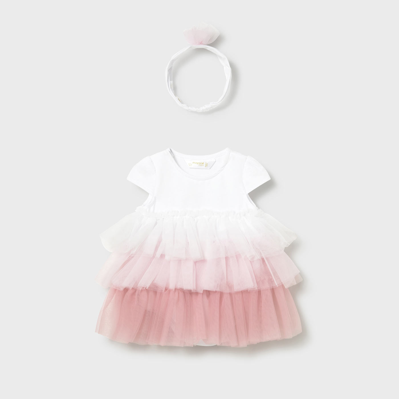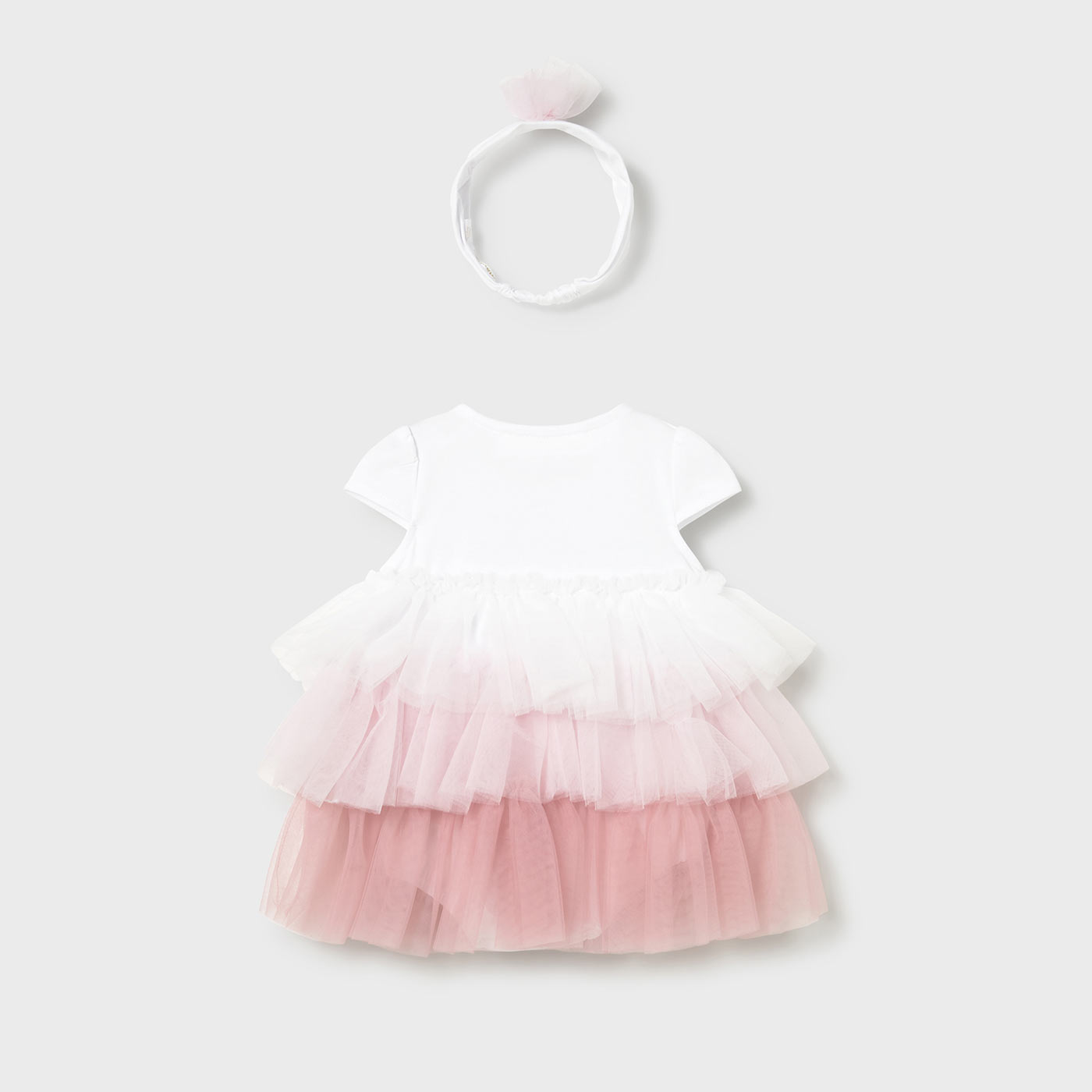 Η διαβάθμιση του τούλι σε λευκό και ροζ χαρίζει κομψότητα, ενώ η πρακτική κατασκευή τύπου κορμάκι με κουμπώματα στο κάτω μέρος διευκολύνει την αλλαγή πάνας. Συνοδεύεται από ταιριαστή κορδέλα μαλλιών, ολοκληρώνοντας το σύνολο με αρμονία και φινέτσα. Ένα ιδανικό ρούχο για γιορτές, βαπτίσεις, γενέθλια ή ως ξεχωριστό δώρο.