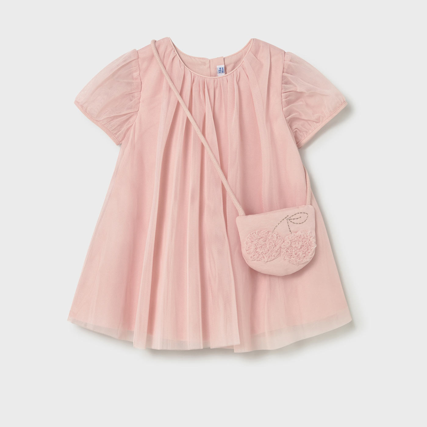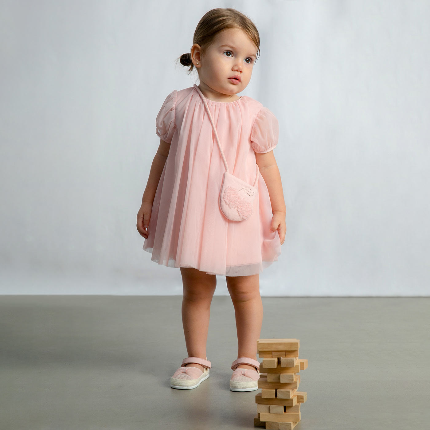 Κομψό και ρομαντικό βρεφικό φόρεμα Mayoral σε απαλό ροζ, ιδανικό για ξεχωριστές εμφανίσεις από τους πρώτους κιόλας μήνες. Το σετ αποτελείται από 2 τεμάχια: φόρεμα με τούλι και ταιριαστή μικρή τσάντα, προσφέροντας ένα ολοκληρωμένο και ιδιαίτερα φίνο σύνολο.Το φόρεμα είναι κατασκευασμένο από ανάλαφρο τούλι, με απαλή επένδυση για άνεση και ελευθερία κινήσεων. Διαθέτει κοντά μανίκια με ελαφρύ φούσκωμα, που χαρίζουν ρομαντική αισθητική, ενώ η άνετη γραμμή του το καθιστά ιδανικό για βρέφη. Το κλείσιμο στο πίσω μέρος διευκολύνει την αλλαγή και την εφαρμογή.Η συνοδευτική μίνι τσάντα ώμου σε ίδιο ροζ χρώμα, με διακριτικές υφασμάτινες λεπτομέρειες, προσθέτει παιχνιδιάρικο χαρακτήρα και κάνει το σετ ξεχωριστό για βαπτίσεις, γιορτές ή επίσημες περιστάσεις.