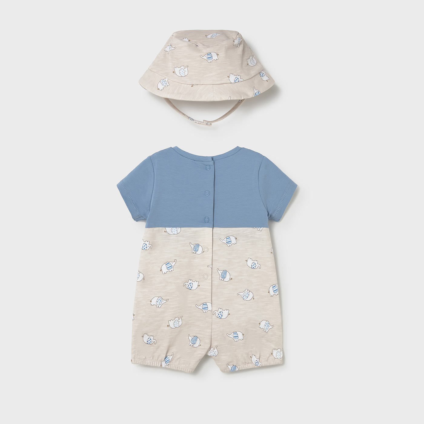 Κατασκευασμένο από απαλό βαμβακερό ύφασμα, φιλικό προς το ευαίσθητο βρεφικό δέρμα, εξασφαλίζει άνετη εφαρμογή και ελευθερία κινήσεων. Η σαλοπέτα διαθέτει κουμπώματα στο κάτω μέρος για εύκολη αλλαγή πάνας, ενώ το καπελάκι προστατεύει το κεφαλάκι του μωρού με στυλ. Το διακριτικό μπεζ χρώμα σε συνδυασμό με τις γλυκές παιδικές λεπτομέρειες το καθιστούν ιδανικό για καθημερινή χρήση αλλά και για δώρο γέννησης.