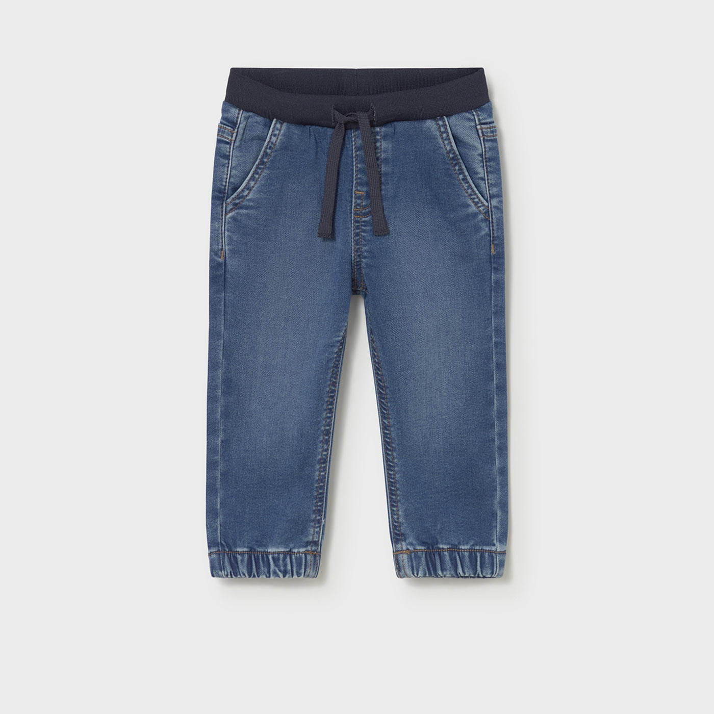 ʼνετο και μοντέρνο βρεφικό παντελόνι τζιν για αγόρια Mayoral σε κλασική μπλε απόχρωση, σχεδιασμένο σε jogger γραμμή για απόλυτη ελευθερία κινήσεων και καθημερινή άνεση. Ένα πρακτικό κομμάτι που συνδυάζει την εμφάνιση του τζιν με την αίσθηση φόρμας, ιδανικό για δραστήρια μωρά.