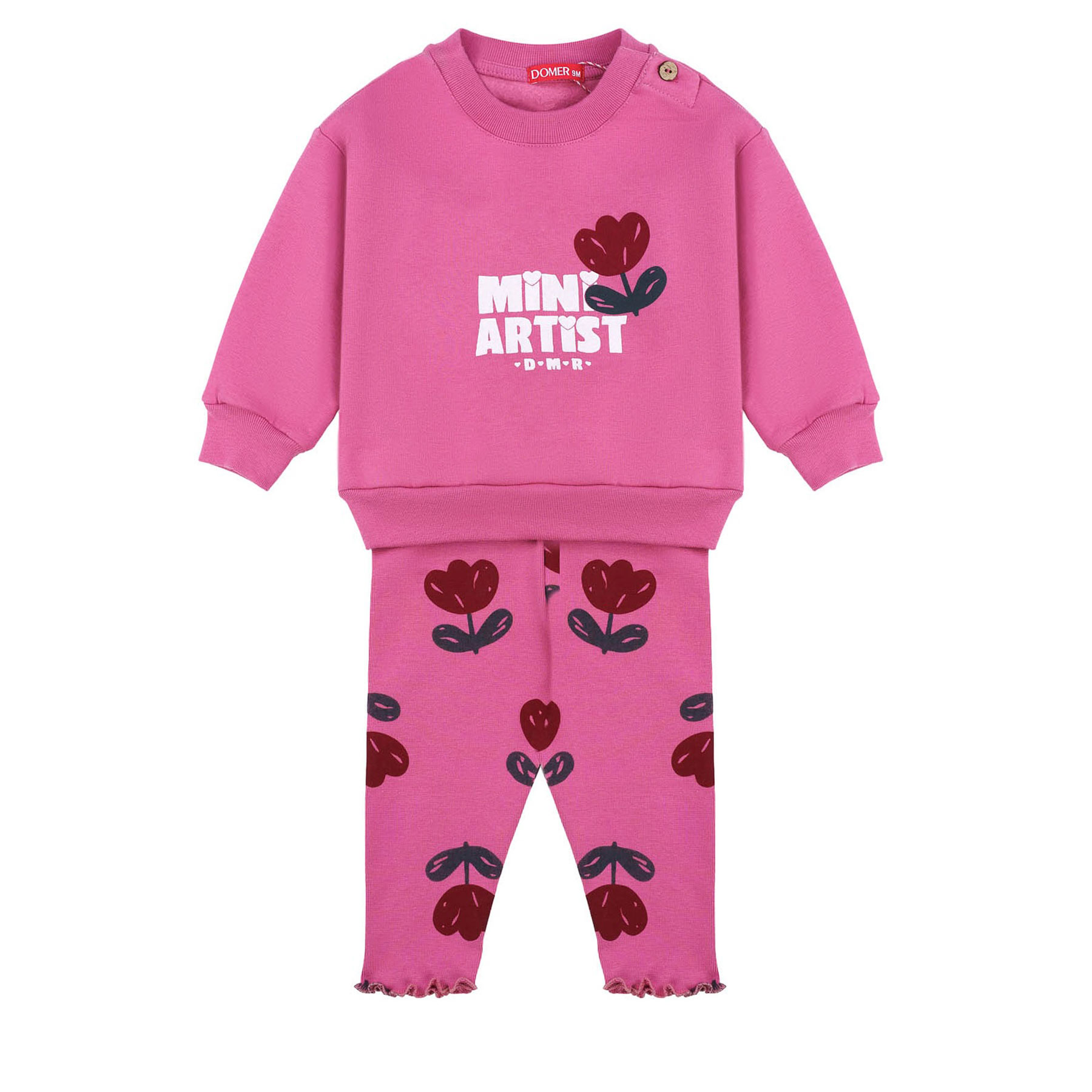 Αναδείξτε το στυλ της μικρής σας με αυτό το υπέροχο βρεφικό σετ φόρμα φούτερ για κορίτσι Domer σε γλυκό φούξ χρώμα. Το σετ περιλαμβάνει μπλούζα φούτερ με στάμπα MINI ARTIST και κολάν με χαριτωμένα λουλούδια, δημιουργώντας ένα παιχνιδιάρικο και μοντέρνο look που θα λατρέψετε!