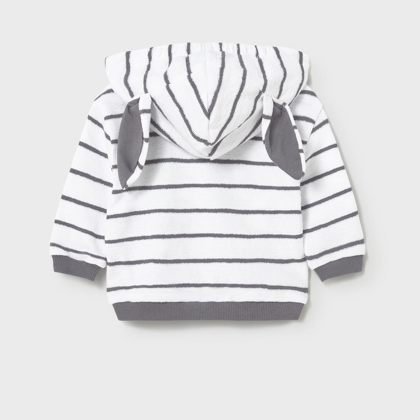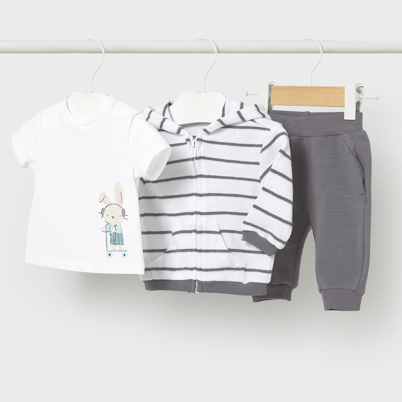 Το λευκό μπλουζάκι διαθέτει χαριτωμένο τύπωμα ζωάκι, χαρίζοντας παιχνιδιάρικη διάθεση, ενώ η ανθρακί-λευκή ριγέ ζακέτα με φερμουάρ προσφέρει άνεση και ζεστασιά. Το ανθρακί παντελόνι φόρμας με ελαστική μέση εξασφαλίζει τέλεια εφαρμογή και ελευθερία κινήσεων.