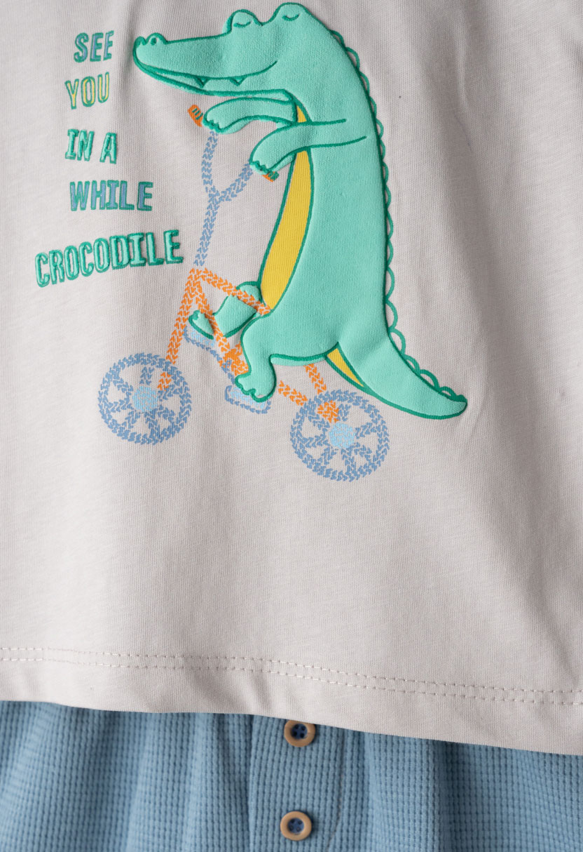 Ένα δροσερό και χαριτωμένο βρεφικό σετ 3 τεμαχίων για αγόρια από τη Hashtag, ιδανικό για άνετες και στιλάτες καλοκαιρινές εμφανίσεις. Το σετ περιλαμβάνει κοντομάνικη μπλούζα, σορτσάκι και ασορτί καπέλο, προσφέροντας ένα ολοκληρωμένο outfit για τις βόλτες του μικρού σας.Η γκρι μπλούζα ξεχωρίζει με το παιχνιδιάρικο τύπωμα κροκόδειλου πάνω σε ποδήλατο και χαρούμενο μήνυμα, προσθέτοντας fun χαρακτήρα. Διαθέτει κουμπάκια στον ώμο για εύκολο ντύσιμο. Το σιέλ σορτσάκι με ελαστική μέση και διακοσμητικά κουμπάκια προσφέρει άνετη εφαρμογή και ελευθερία κινήσεων. Το ασορτί καπέλο προστατεύει από τον ήλιο και ολοκληρώνει το σύνολο με στυλ.Κατασκευασμένο από μαλακά και φιλικά προς το βρεφικό δέρμα υφάσματα, είναι ιδανικό για τις ζεστές ημέρες της άνοιξης και του καλοκαιριού.