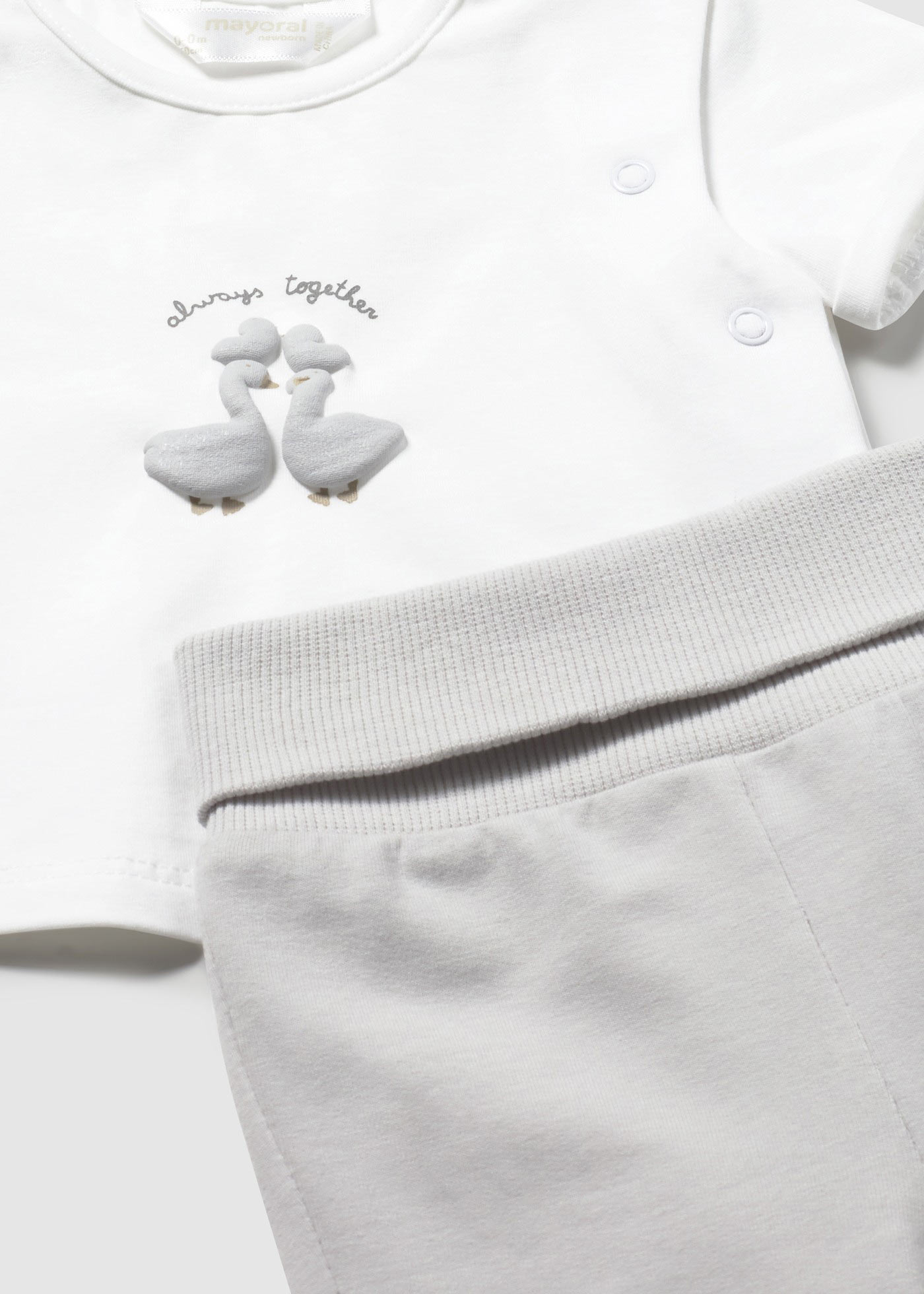 Κομψό, απαλό και απόλυτα πρακτικό, αυτό το βρεφικό σετ 3 τεμαχίων για αγόρια της Mayoral αποτελεί ιδανική επιλογή για τις πρώτες εμφανίσεις του μωρού σας. Σε φίνο συνδυασμό λευκού και ασημί, με τρυφερό μοτίβο κύκνων, προσφέρει minimal αισθητική και διαχρονικό στυλ.
