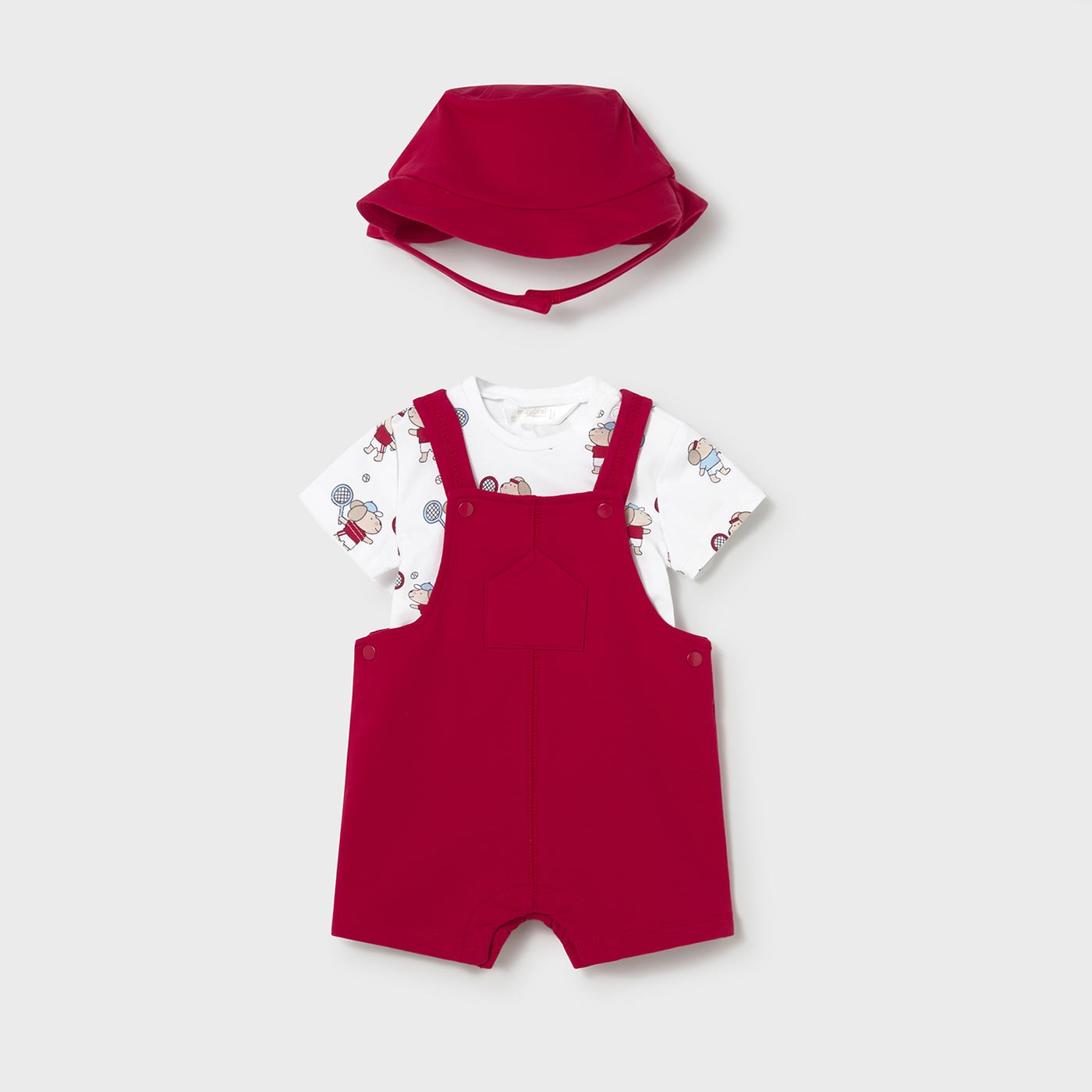 Κομψό και άνετο βρεφικό σετ Mayoral 3 τεμαχίων για αγόρια, ιδανικό για τις καθημερινές αλλά και τις πιο ιδιαίτερες εμφανίσεις του μωρού σας. Το σετ περιλαμβάνει κοντομάνικο μπλουζάκι με παιχνιδιάρικο print, κόκκινη σαλοπέτα και ασορτί καπέλο, δημιουργώντας ένα ολοκληρωμένο και πρακτικό outfit.