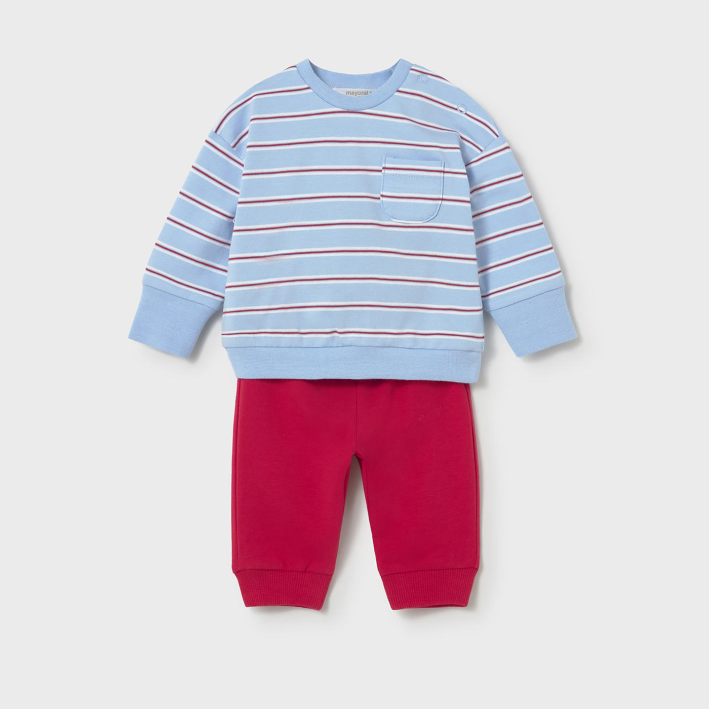 Το βρεφικό σετ για αγόρια Mayoral 4 τεμαχίων σε σιέλ, εκρού και κόκκινο είναι μια ολοκληρωμένη και πρακτική πρόταση για άνετες και κομψές καθημερινές εμφανίσεις. Το σετ περιλαμβάνει δύο μπλουζάκια μακρυμάνικα ένα μονόχρωμο σιέλ με διακριτικό κέντημα και ένα ριγέ σε σιέλ με κόκκινες λεπτομέρειες και τσεπάκι καθώς και δύο ασορτί παντελόνια, ένα σε εκρού και ένα σε έντονο κόκκινο, προσφέροντας πολλαπλούς συνδυασμούς. Κατασκευασμένα από απαλό βαμβακερό ύφασμα, τα κομμάτια εξασφαλίζουν άνεση και φιλική αίσθηση στο ευαίσθητο βρεφικό δέρμα. Τα κουμπάκια στον ώμο διευκολύνουν την εφαρμογή, ενώ οι ελαστικές μέσες και τα ριμπ τελειώματα προσφέρουν σταθερότητα και ελευθερία κινήσεων. Ιδανικό για καθημερινές βόλτες, δώρο γέννησης ή ολοκληρωμένο seasonal σύνολο, το βρεφικό σετ Mayoral 4τμχ συνδυάζει ποιότητα, πρακτικότητα και διαχρονικό παιδικό στυλ.
