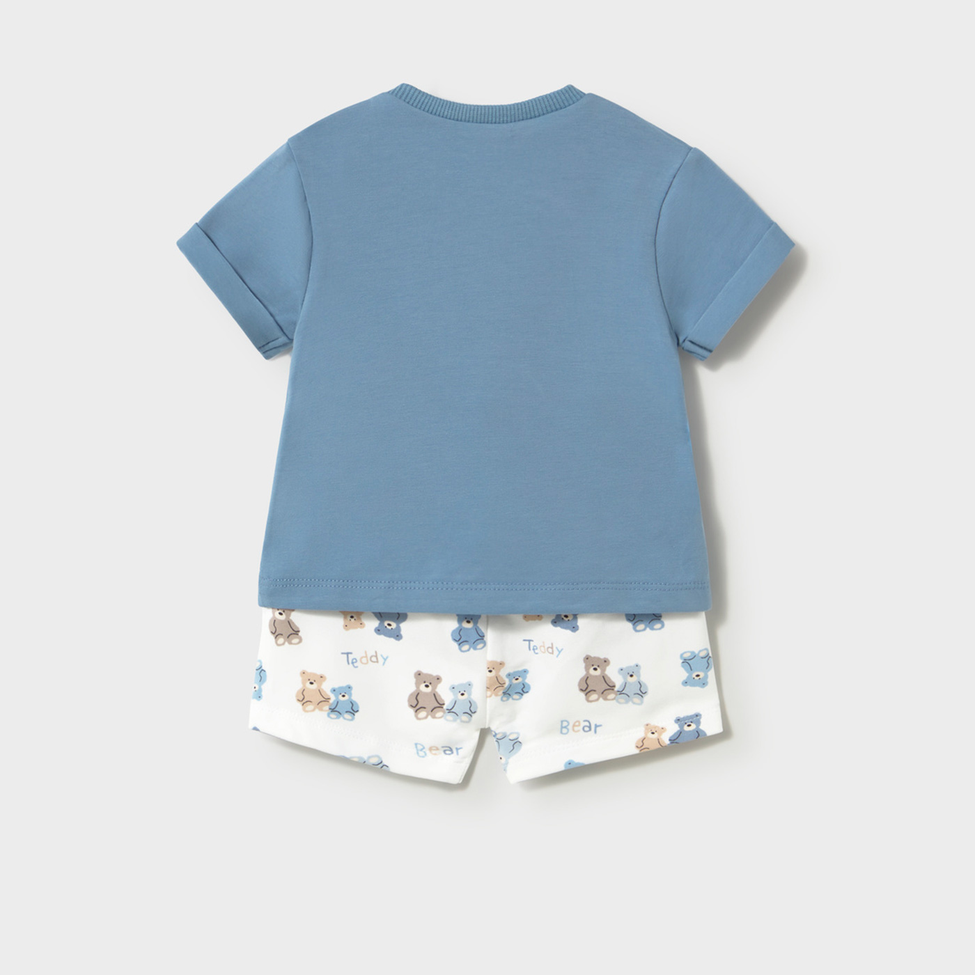 Το γαλάζιο μπλουζάκι ξεχωρίζει με το γλυκό τύπωμα αρκουδάκι και τη λέξη Teddy, χαρίζοντας ζωντάνια και παιδική αθωότητα. Διαθέτει κουμπάκι στον ώμο για εύκολη εφαρμογή. Το λευκό σορτσάκι με πολύχρωμο all-over print από αρκουδάκια και ελαστική μέση προσφέρει άνετη εφαρμογή και ελευθερία κινήσεων.