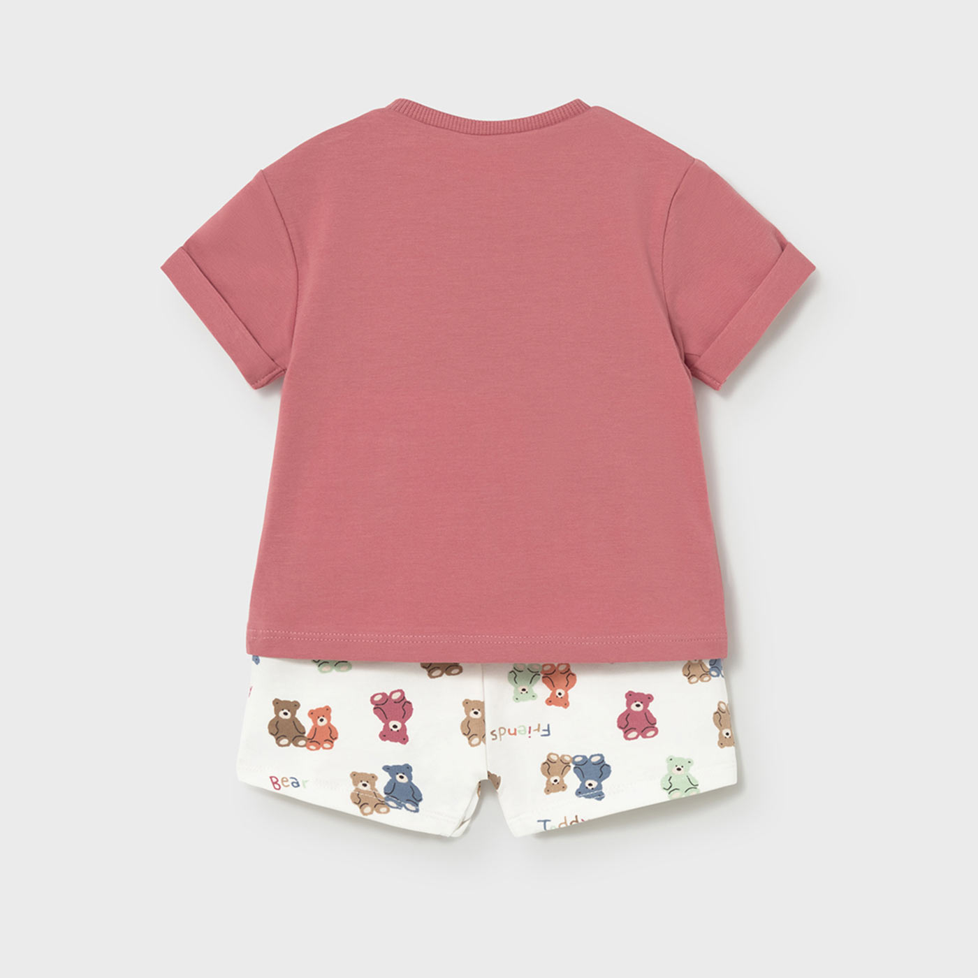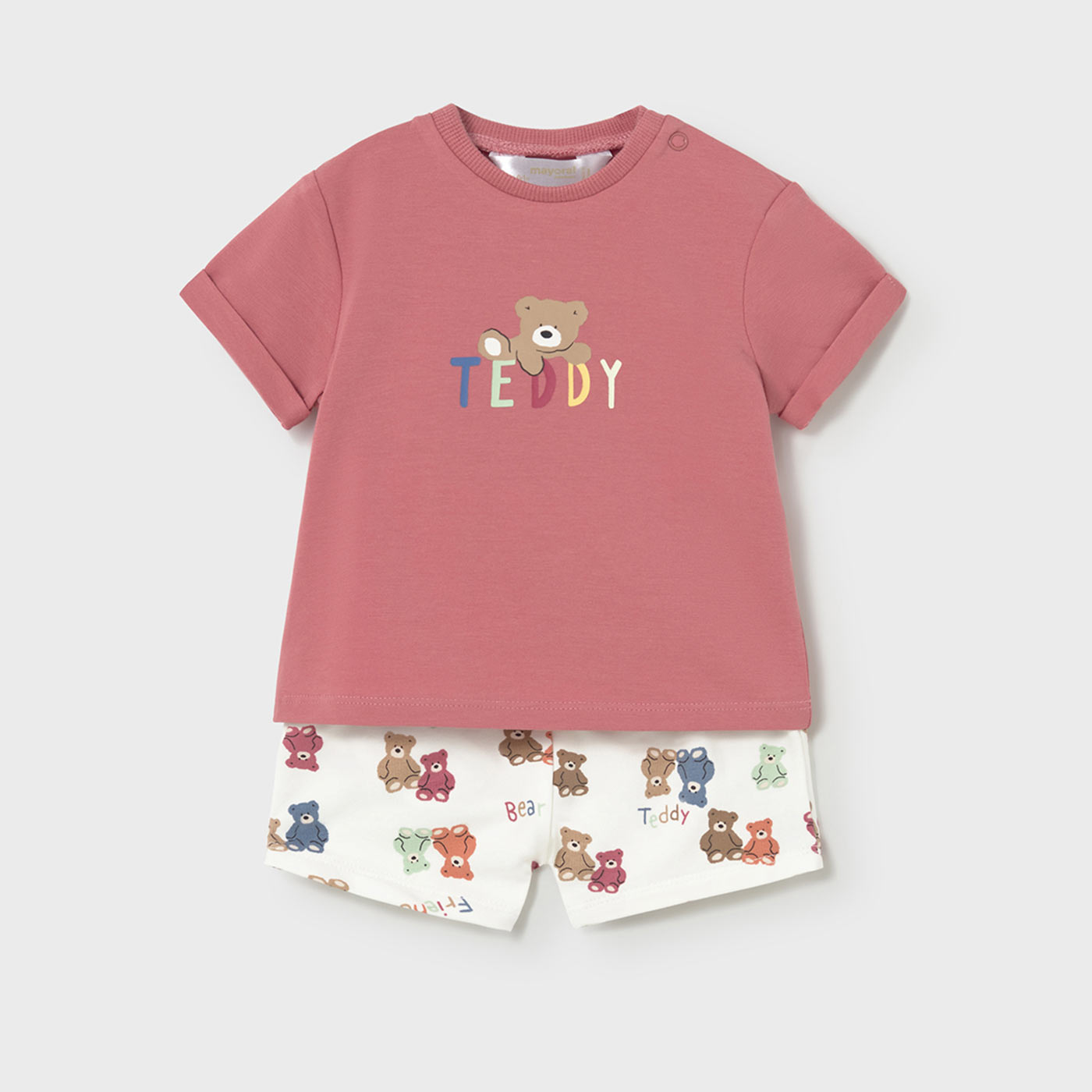 Το πορτοκαλί μπλουζάκι ξεχωρίζει με το γλυκό τύπωμα αρκουδάκι και τη λέξη Teddy, χαρίζοντας ζωντάνια και παιδική αθωότητα. Διαθέτει κουμπάκι στον ώμο για εύκολη εφαρμογή. Το λευκό σορτσάκι με πολύχρωμο all-over print από αρκουδάκια και ελαστική μέση προσφέρει άνετη εφαρμογή και ελευθερία κινήσεων.