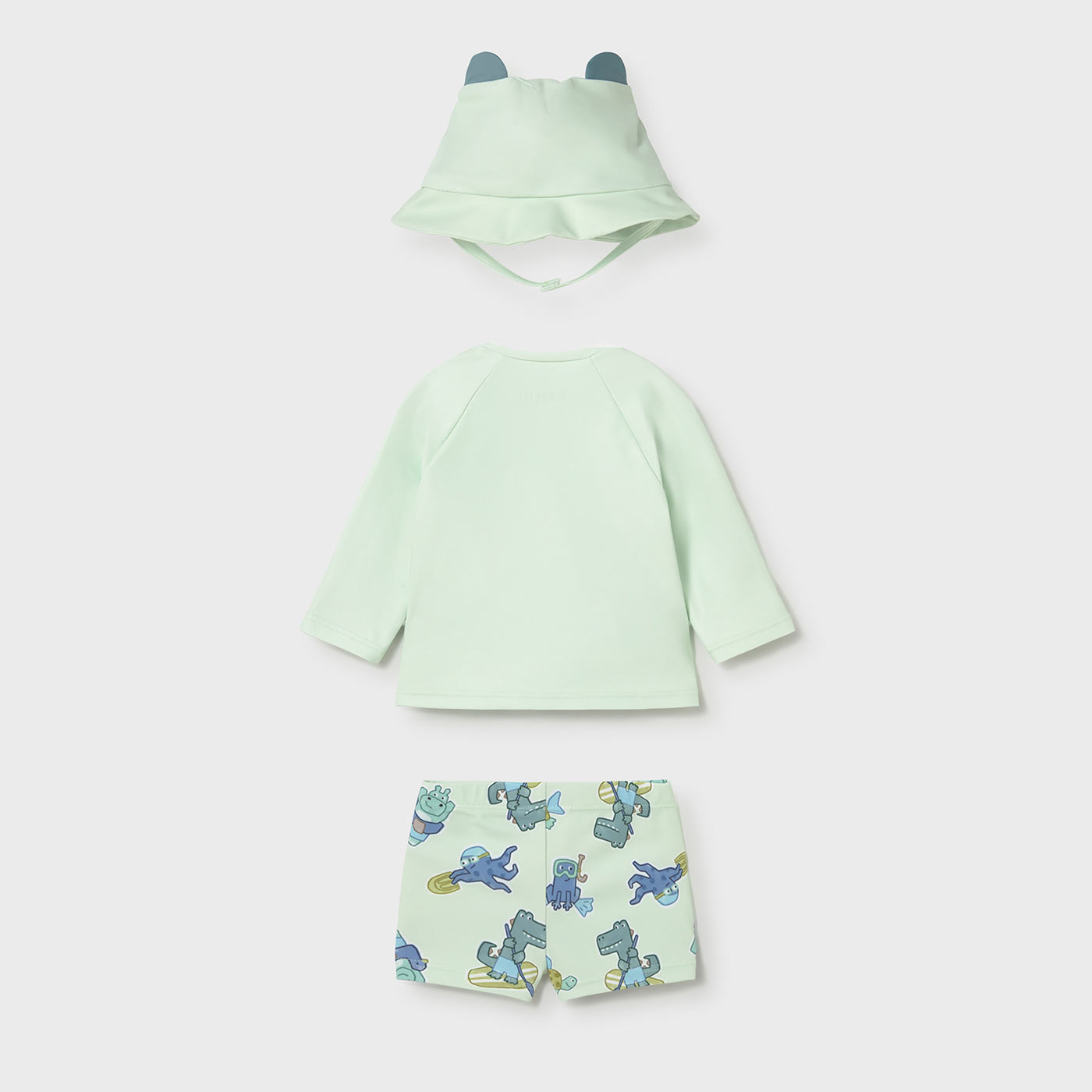 Το βρεφικό σετ μαγιό Mayoral 3 τεμαχίων σε ανοιχτό πράσινο χρώμα είναι η ιδανική επιλογή για τις πρώτες καλοκαιρινές εξορμήσεις του μικρού σας στη θάλασσα ή την πισίνα. Συνδυάζει προστασία, άνεση και παιχνιδιάρικο design, ειδικά σχεδιασμένο για βρέφη.