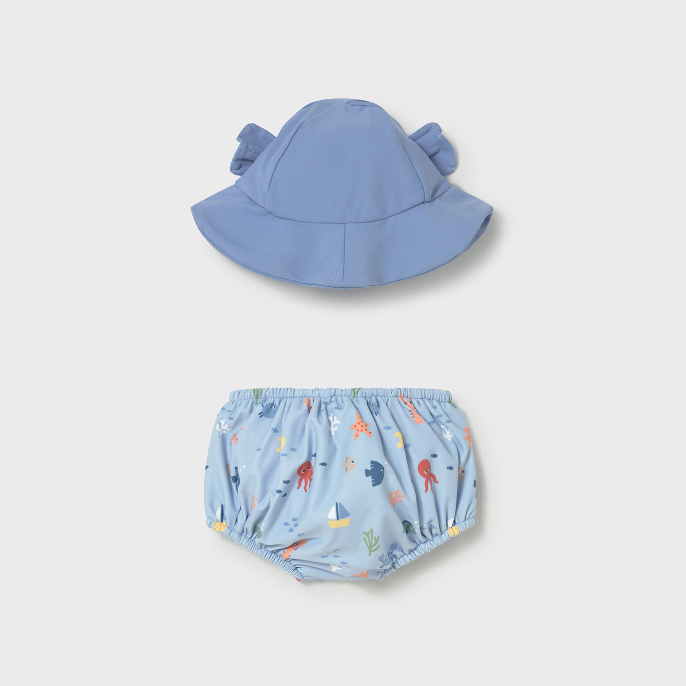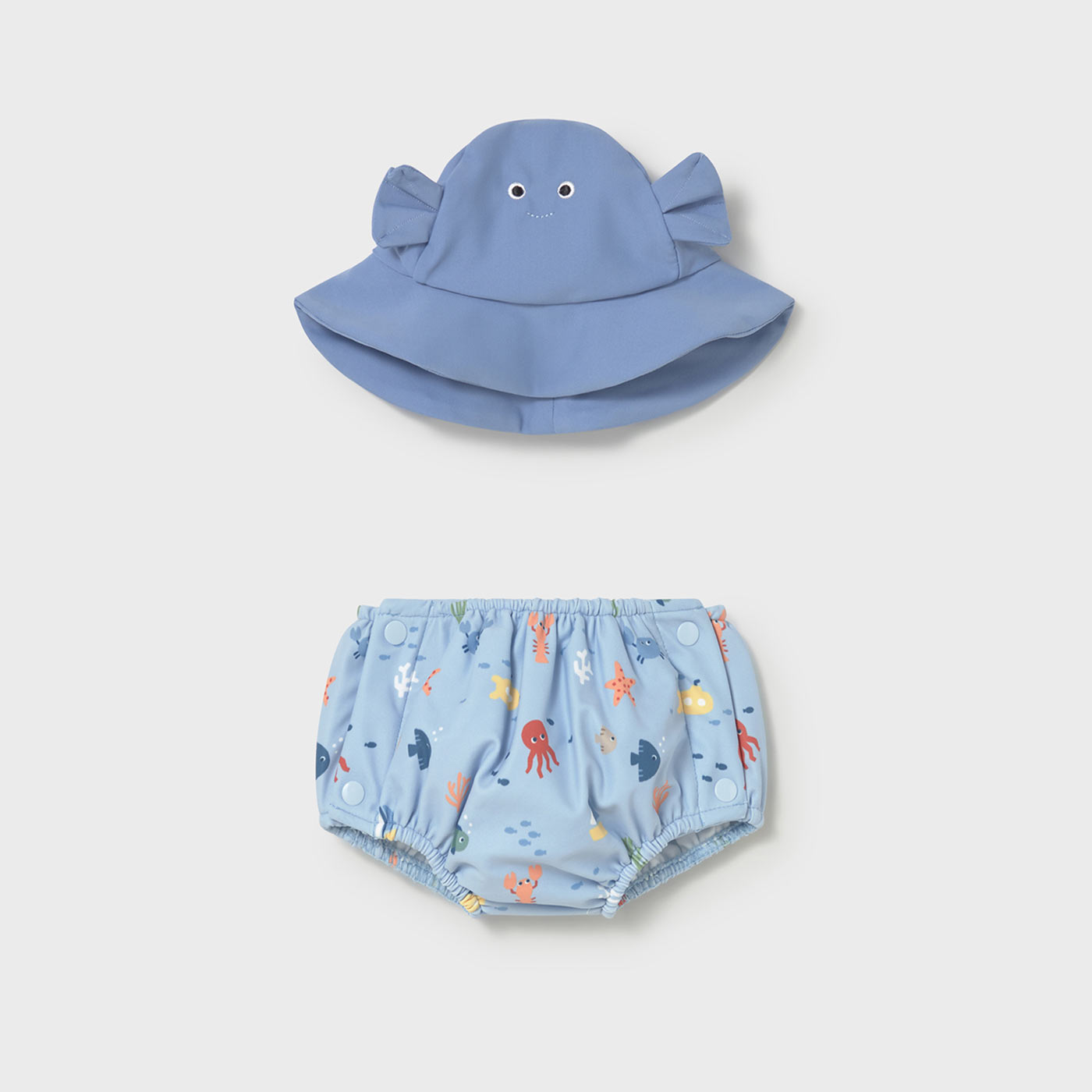 Το βρεφικό σετ μαγιό για αγόρια της Mayoral είναι η ιδανική επιλογή για τις πρώτες καλοκαιρινές εξορμήσεις του μωρού σας στη θάλασσα ή την πισίνα. Το σετ περιλαμβάνει μαγιό-πάνα και καπέλο, σε δροσερή μπλε απόχρωση με χαρούμενα θαλάσσια μοτίβα, προσφέροντας άνεση, προστασία και παιχνιδιάρικο στυλ.