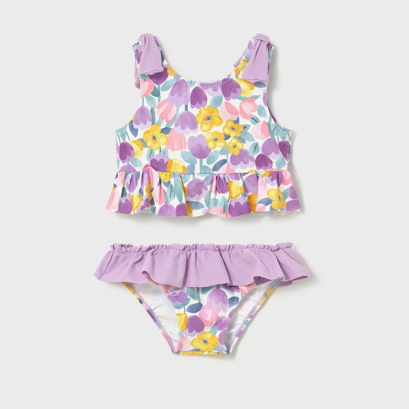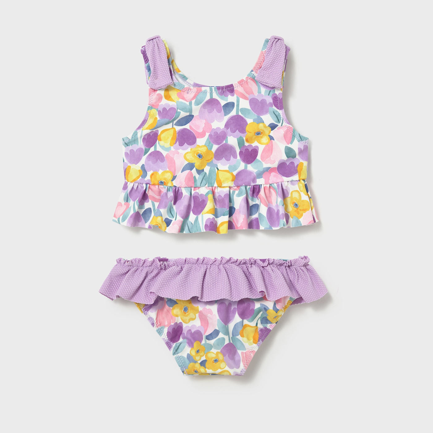Χαρούμενο, άνετο και απόλυτα καλοκαιρινό, αυτό το βρεφικό σετ μαγιό Mayoral 2 τεμαχίων είναι ιδανικό για τις πρώτες βουτιές της μικρής σας. Το σετ περιλαμβάνει μπλουζάκι μαγιό και σλιπ, διακοσμημένα με υπέροχο φλοράλ σχέδιο σε λιλά, ροζ, κίτρινες και παστέλ αποχρώσεις, που αποπνέουν φρεσκάδα και girly αισθητική.Το επάνω μέρος διαθέτει βολάν τιράντες και μικρό βολάν στο τελείωμα, προσφέροντας άνετη εφαρμογή και κομψή εμφάνιση. Το κάτω μέρος ξεχωρίζει με βολάν στη μέση και ελαστικό τελείωμα για σταθερό κράτημα. Το ύφασμα είναι ελαστικό, μαλακό και γρήγορου στεγνώματος, ιδανικό για ευαίσθητο βρεφικό δέρμα και ατελείωτο παιχνίδι στη θάλασσα ή την πισίνα.