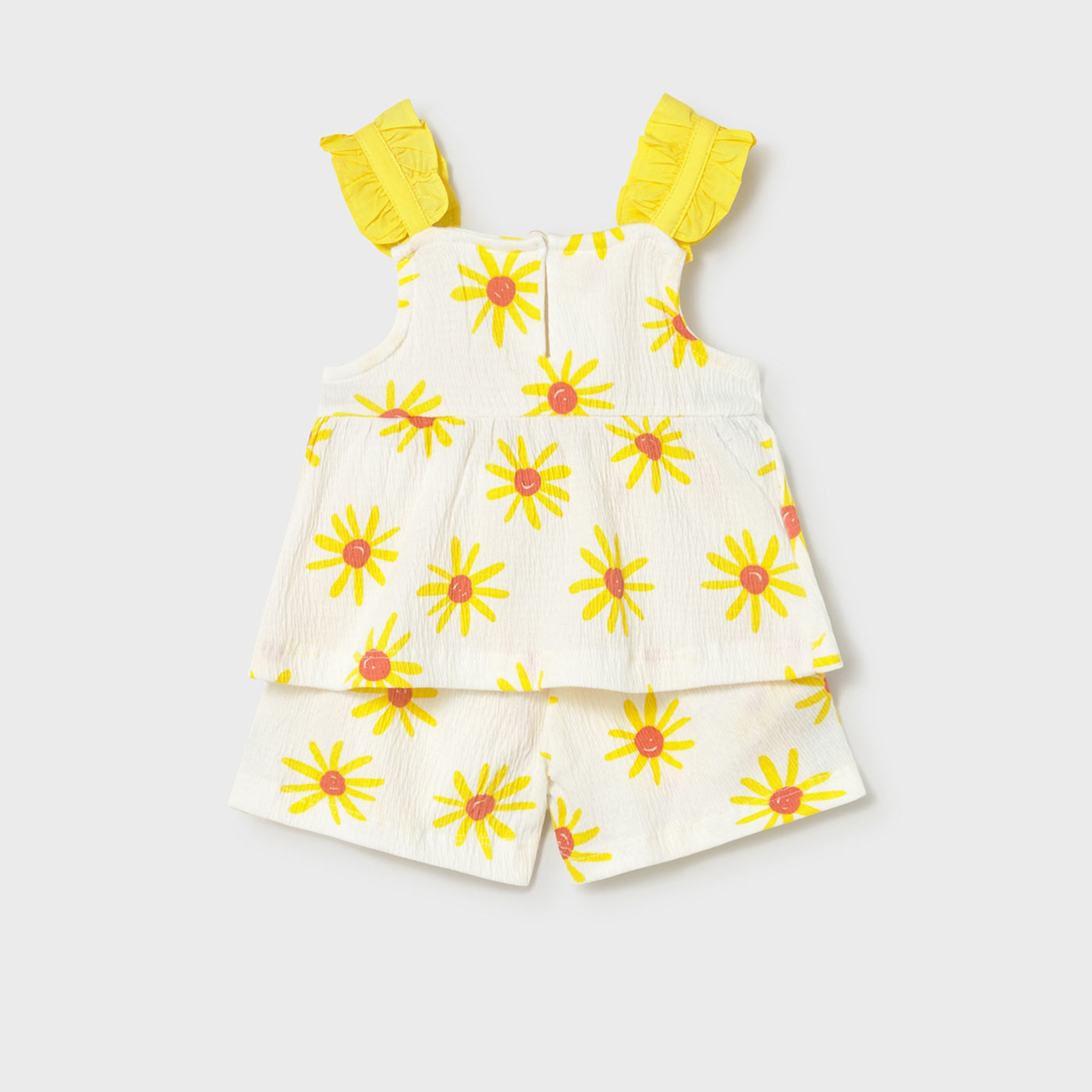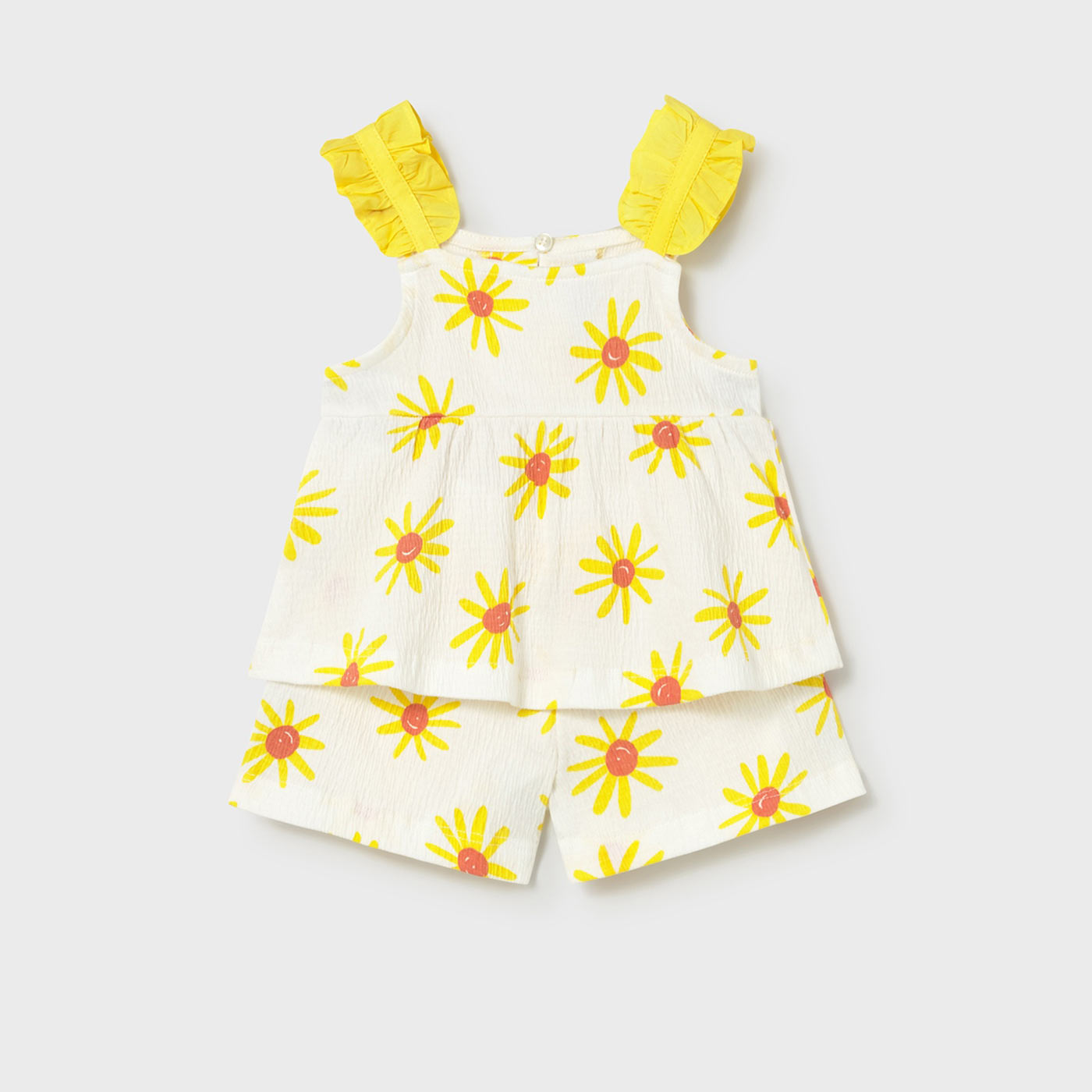 Χαρίστε στο μωρό σας άνεση και καλοκαιρινή φρεσκάδα με αυτό το υπέροχο βρεφικό σετ Mayoral. Το σετ αποτελείται από αμάνικη μπλούζα με χαριτωμένες βολάν τιράντες και σορτσάκι, σε λευκή βάση με κίτρινο φλοράλ μοτίβο μαργαρίτας, ιδανικό για τις ζεστές ημέρες.Η μακό γκοφρέ ύφανση προσφέρει εξαιρετική απαλότητα και διαπνοή, ενώ είναι φιλική προς το ευαίσθητο βρεφικό δέρμα. Η μπλούζα διαθέτει κουμπάκι στο πίσω μέρος για εύκολη εφαρμογή, ενώ το σορτσάκι έχει ελαστική μέση και διακοσμητικό φιόγκο για επιπλέον άνεση και στυλ.
