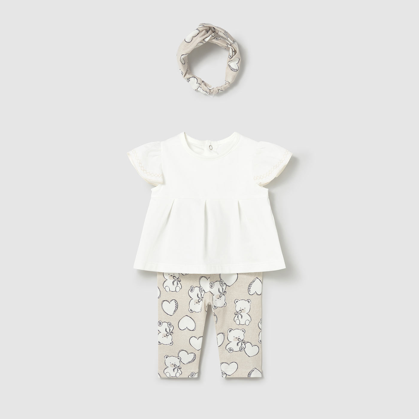 Ένα υπέροχο και πρακτικό βρεφικό σετ 3 τεμαχίων Mayoral, σχεδιασμένο για να προσφέρει άνεση, απαλότητα και διακριτική κομψότητα στις καθημερινές αλλά και πιο ιδιαίτερες εμφανίσεις του μωρού σας. Οι ουδέτερες αποχρώσεις λευκού και εκρού το καθιστούν ιδανική επιλογή τόσο για καθημερινή χρήση όσο και για δώρο.Μπλουζάκι σε λευκό χρώμα με κοντό μανίκι και χαριτωμένες λεπτομέρειες στα τελειώματα, που χαρίζουν κομψή και γλυκιά εμφάνιση.
