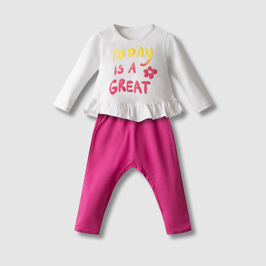Το βρεφικό σετ Nekidswear σε λευκό και φουξ είναι η ιδανική επιλογή για άνετα και στιλάτα outfits που ξεχωρίζουν. Το σετ περιλαμβάνει μακρυμάνικη μπλούζα σε λευκή απόχρωση με παιχνιδιάρικο μήνυμα και girly λεπτομέρειες, καθώς και μαλακό κολάν σε έντονο φουξ χρώμα που προσφέρει άνεση και ευελιξία.