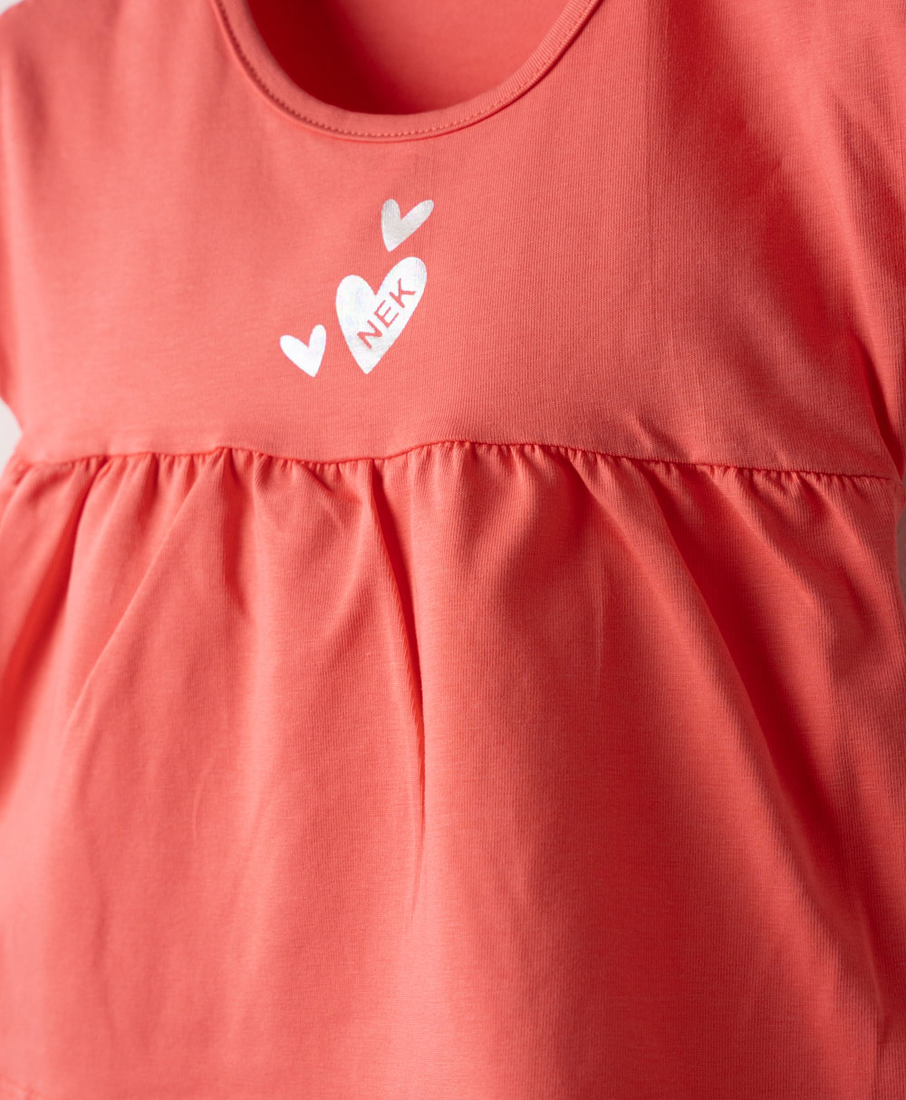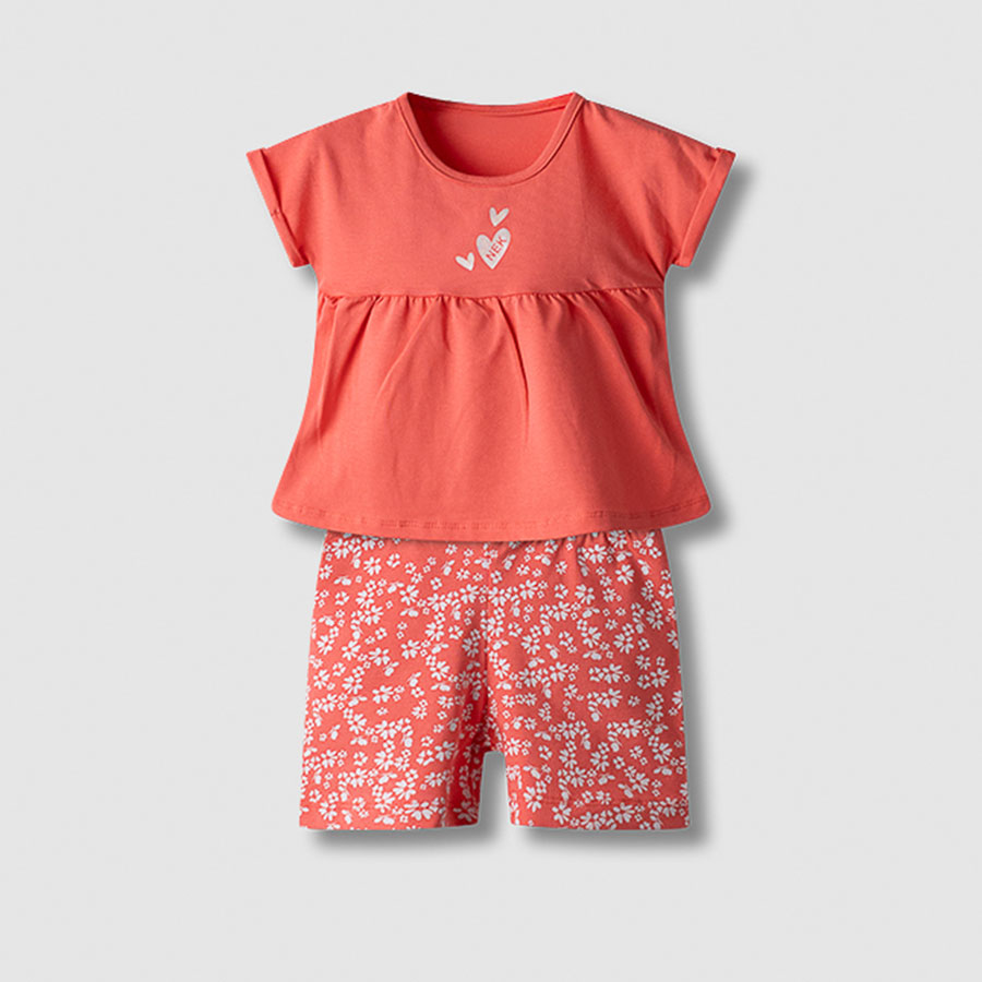 Το βρεφικό σετ Nekidswear σε κοραλί απόχρωση είναι η τέλεια επιλογή για καλοκαιρινά looks που συνδυάζουν άνεση και στυλ. Το σετ περιλαμβάνει κοντομάνικο μπλουζάκι με απαλή γραμμή και διακριτικό σχέδιο με καρδούλες, καθώς και ποδηλατικό κολάν με floral μοτίβο που δίνει μία παιχνιδιάρικη και χαρούμενη νότα.