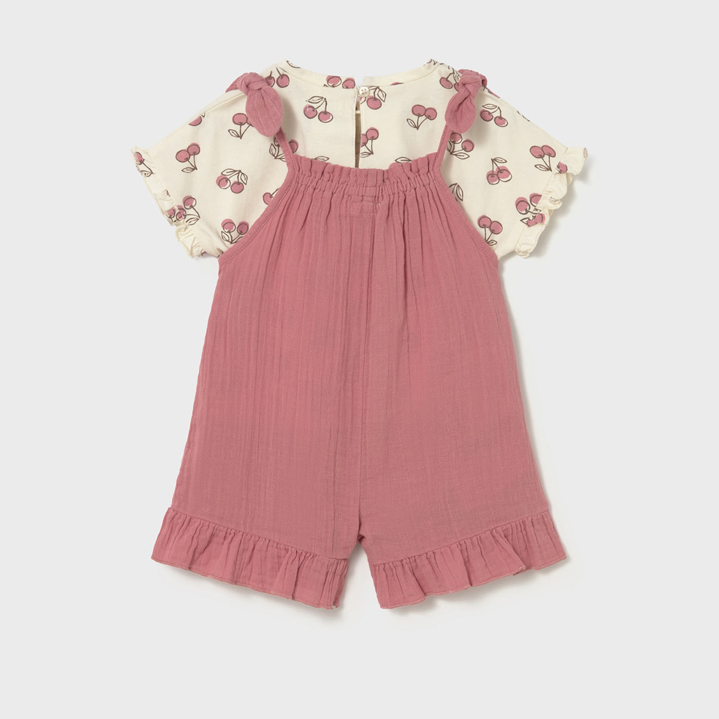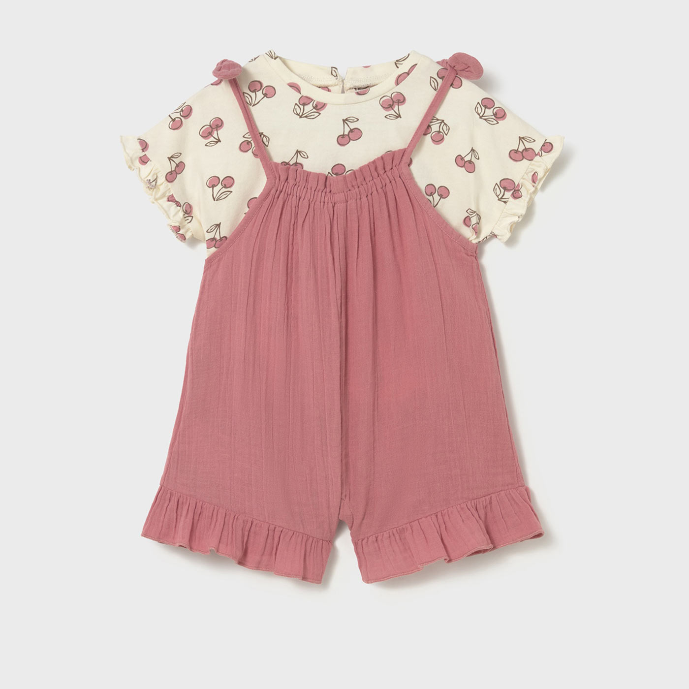 Το βρεφικό σετ Mayoral με σαλοπέτα σε αποχρώσεις ροζ και μπεζ αποτελεί μια υπέροχη επιλογή για κομψές και άνετες εμφανίσεις από τους πρώτους μήνες. Το σετ αποτελείται από μπλούζα με κοντό μανίκι και σαλοπέτα, συνδυάζοντας πρακτικότητα και γλυκό παιδικό στυλ.Η μπλούζα είναι σε απαλό μπεζ χρώμα με χαριτωμένο μοτίβο κερασάκια, ενώ διαθέτει διακριτικά βολάν στα μανίκια για ρομαντική πινελιά. Η σαλοπέτα σε dusty ροζ απόχρωση ξεχωρίζει για το ανάλαφρο ύφασμά της, τα δετά φιογκάκια στους ώμους και τα βολάν στο τελείωμα, προσφέροντας ελευθερία κινήσεων και άνετη εφαρμογή.Το σετ είναι κατασκευασμένο από μαλακά και φιλικά προς το βρεφικό δέρμα υλικά, ιδανικά για καθημερινή χρήση την άνοιξη και το καλοκαίρι. Το κούμπωμα στο πίσω μέρος της μπλούζας διευκολύνει το ντύσιμο και την αλλαγή.Ιδανικό για βόλτες, οικογενειακές εξόδους ή και ως δώρο, αυτό το σετ συνδυάζει ποιότητα, στυλ και άνεση με την υπογραφή της Mayoral.