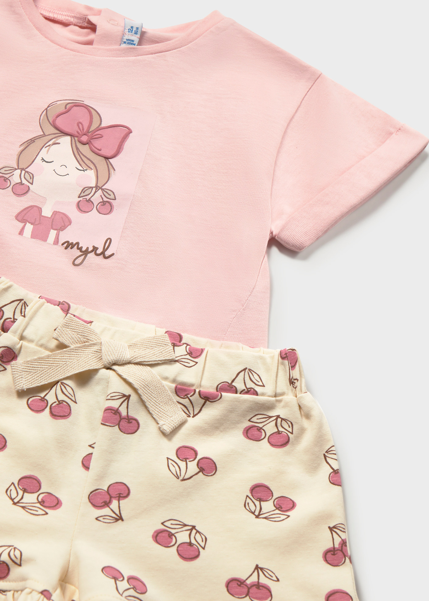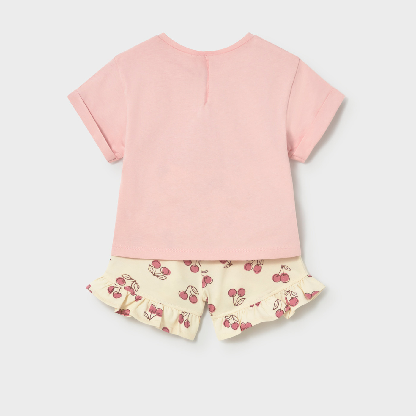 Γλυκό, καλοκαιρινό και άνετο, το βρεφικό σετ Mayoral σε ροζ-μπεζ αποχρώσεις είναι ιδανικό για τις μικρές κυρίες που θέλουν στυλ από τους πρώτους μήνες! Το σετ αποτελείται από κοντομάνικο μπλουζάκι με χαριτωμένο τύπωμα και σορτσάκι με κερασάκια και βολάν, δημιουργώντας ένα παιχνιδιάρικο αλλά κομψό σύνολο.