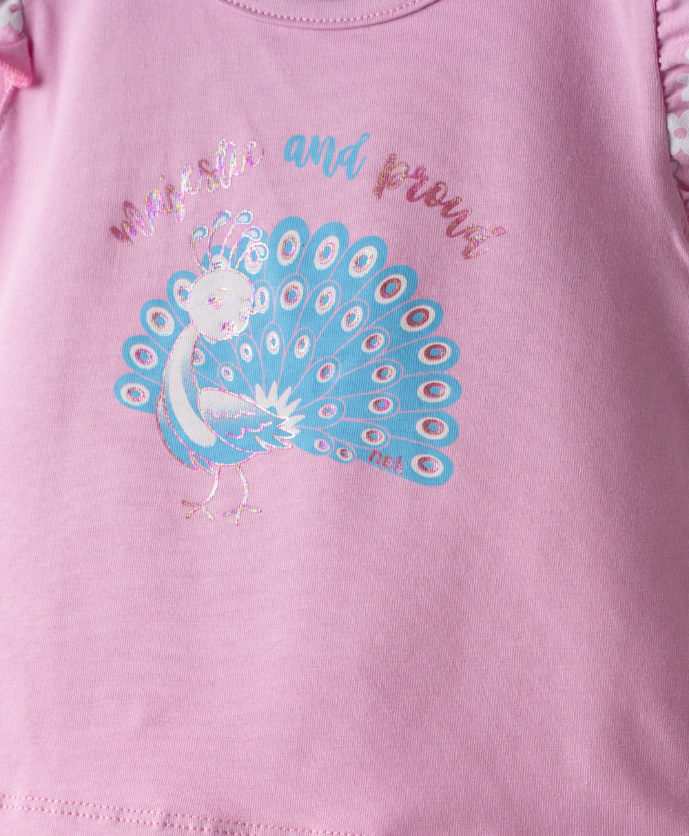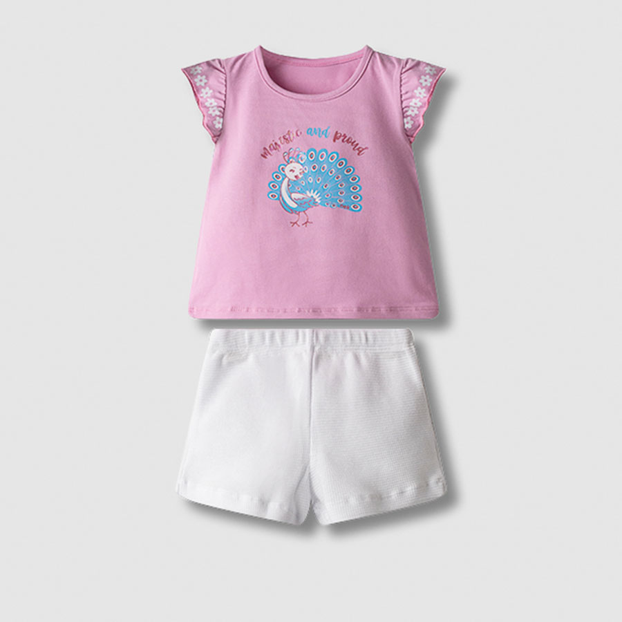 Το βρεφικό σετ Nekidswear σε ροζ και λευκό συνδυάζει γλυκό design και άνεση, ιδανικό για τις πρώτες καλοκαιρινές εμφανίσεις του μωρού σας. Το σετ αποτελείται από ροζ μπλουζάκι με χαριτωμένο print παγώνι και διακριτικές λεπτομέρειες στα μανίκια, καθώς και λευκό σορτσάκι που ολοκληρώνει ένα κομψό και δροσερό outfit.