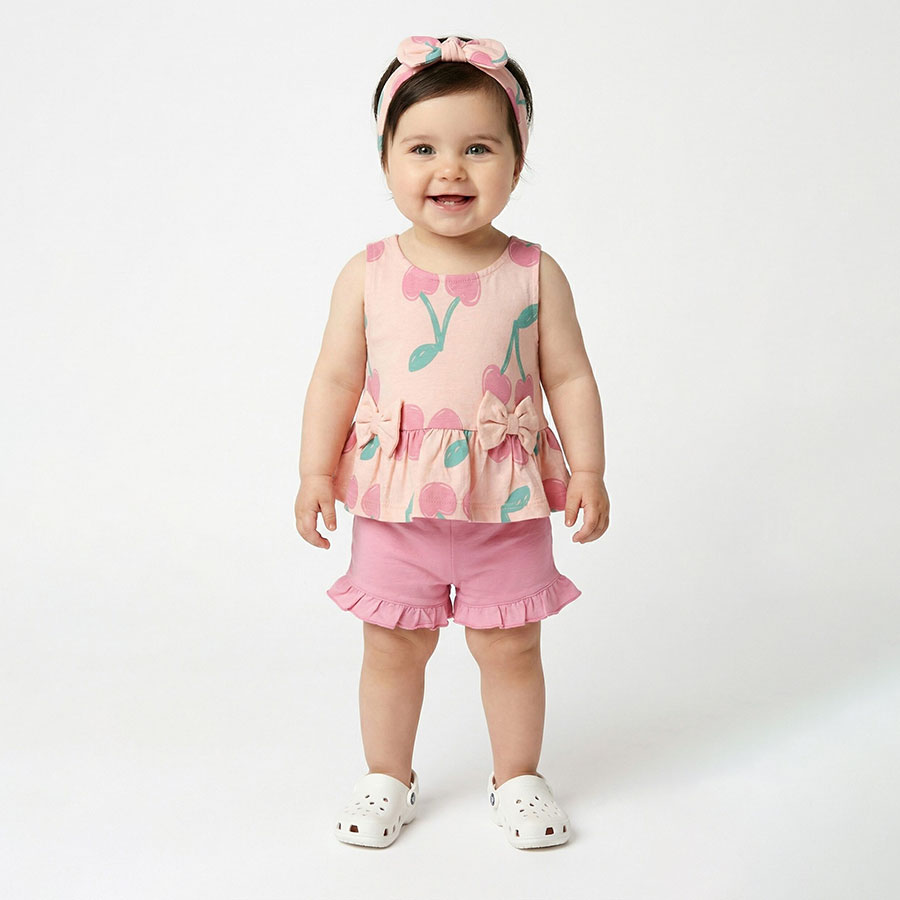 Το βρεφικό σετ Trax για κορίτσια σε αποχρώσεις ροζφουξ είναι η ιδανική επιλογή για χαριτωμένες και άνετες καλοκαιρινές εμφανίσεις. Το σετ περιλαμβάνει αμάνικο μπλουζάκι με παιχνιδιάρικο print και διακοσμητικούς φιόγκους, συνδυασμένο με σορτσάκι σε έντονη ροζ απόχρωση με βολάν, δημιουργώντας ένα ολοκληρωμένο girly outfit.