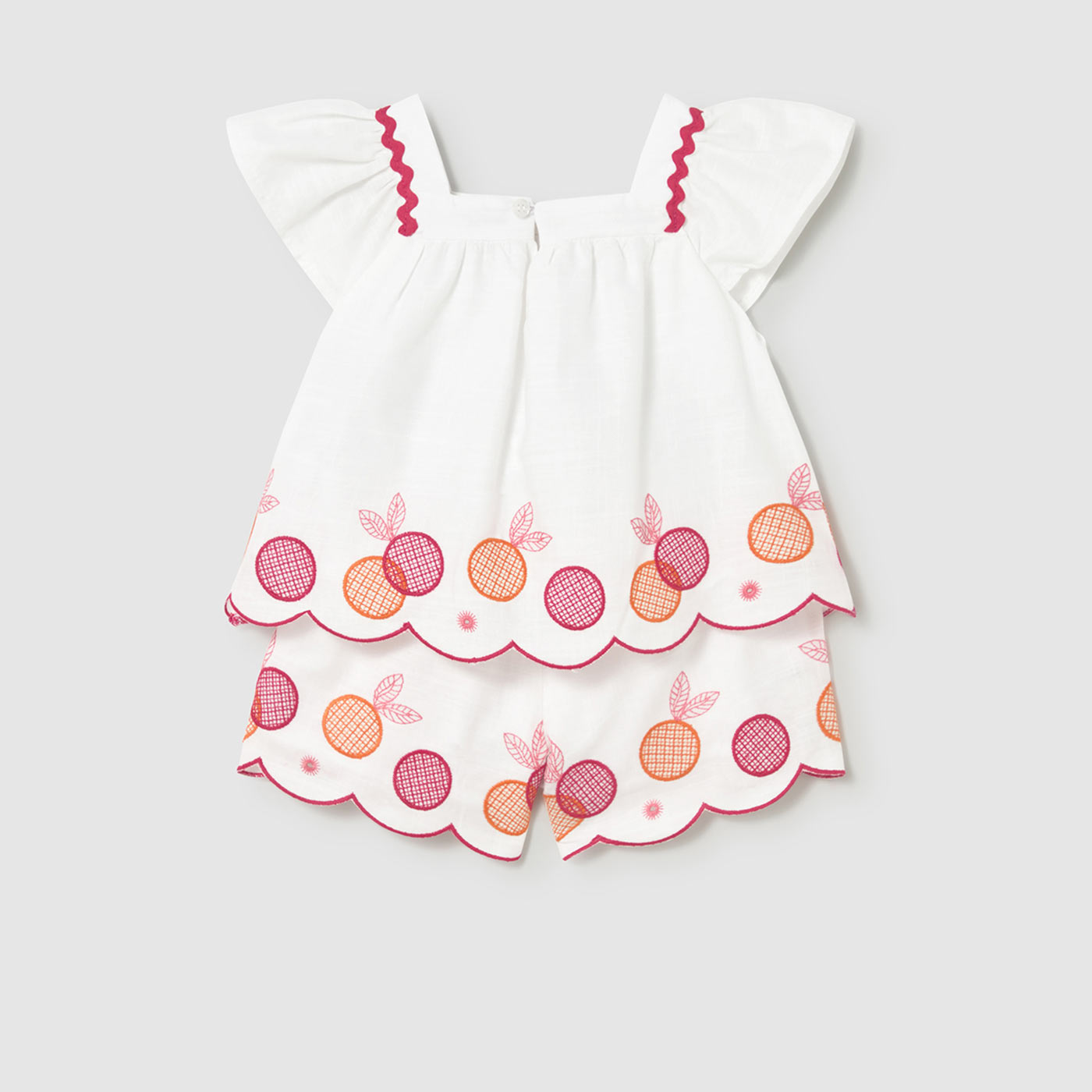 Το βρεφικό σετ Mayoral για κορίτσια σε λευκή απόχρωση ξεχωρίζει για τον κομψό, καλοκαιρινό του χαρακτήρα και τις προσεγμένες λεπτομέρειες. Ένα σύνολο που συνδυάζει άνεση, ποιότητα και ρομαντικό στυλ, ιδανικό για τις ζεστές ημέρες αλλά και για πιο ιδιαίτερες εμφανίσεις.Το σετ αποτελείται από αέρινη μπλούζα με κοντό μανίκι τύπου πεταλούδα και διακοσμητικό κυματιστό ρέλι σε ροζ απόχρωση στη λαιμόκοψη, καθώς και από σορτς με ελαστική μέση για άνετη εφαρμογή. Το σορτς είναι διακοσμημένο με κεντητό μοτίβο φρούτων σε αποχρώσεις ροζ και πορτοκαλί, που χαρίζει παιχνιδιάρικη και χαρούμενη διάθεση.Κατασκευασμένο από ελαφρύ και δροσερό ύφασμα, είναι φιλικό προς την ευαίσθητη βρεφική επιδερμίδα και ιδανικό για καθημερινή χρήση.