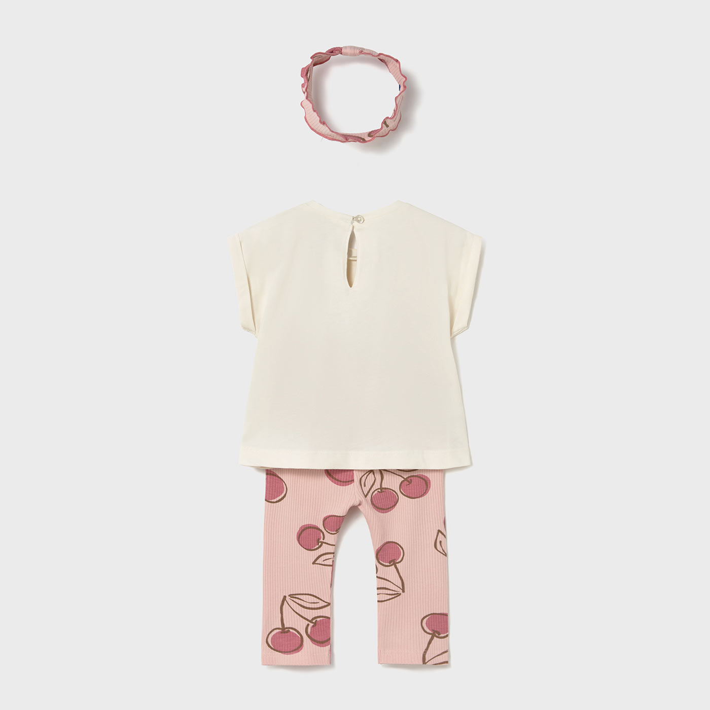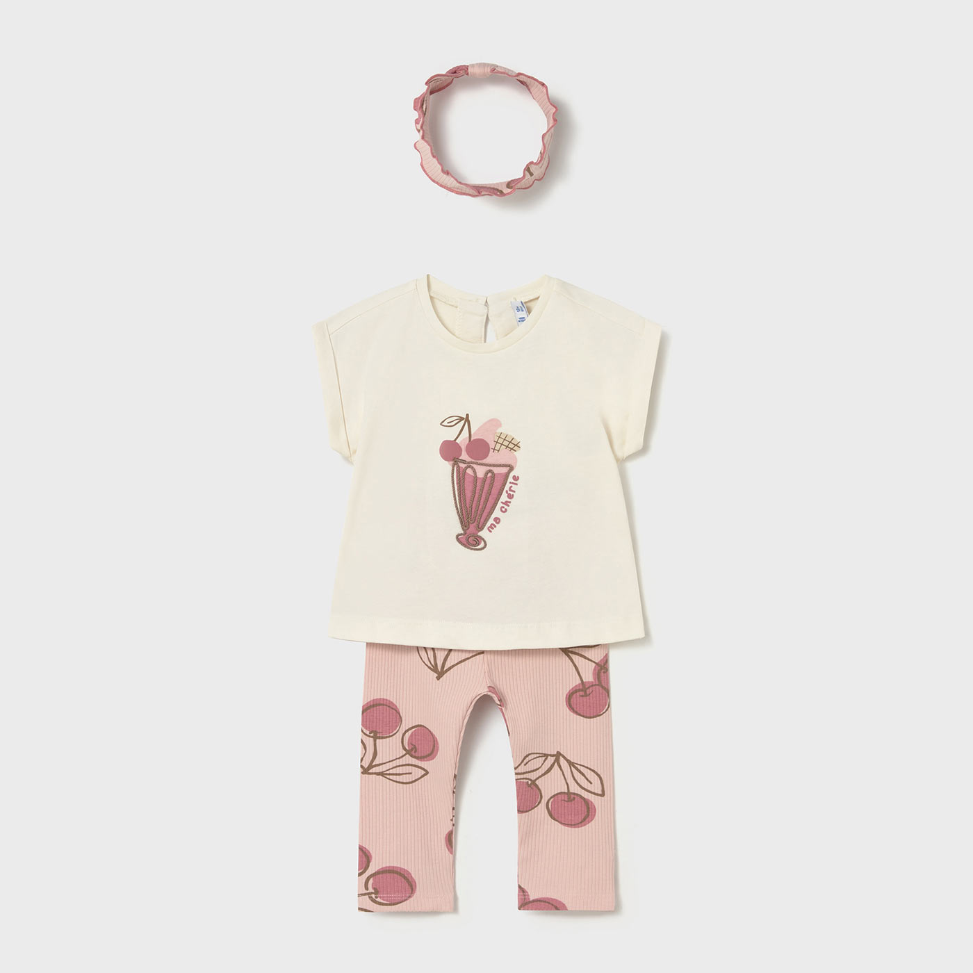 Το βρεφικό σετ Mayoral 3 τεμαχίων σε μπεζ και ροζ αποχρώσεις είναι μια ολοκληρωμένη, κομψή και άνετη πρόταση για τις πρώτες εμφανίσεις της μικρής σας. Το σετ περιλαμβάνει μπλούζα, κολάν και ασορτί κορδέλα μαλλιών, δημιουργώντας ένα γλυκό και πρακτικό σύνολο για κάθε περίσταση.Η μπλούζα σε μπεζ τόνο διαθέτει χαριτωμένο τύπωμα με κεράσια και διακριτικές λεπτομέρειες, ενώ το απαλό βαμβακερό ύφασμα σέβεται το ευαίσθητο βρεφικό δέρμα. Το άνοιγμα στο πίσω μέρος με κουμπί διευκολύνει την εφαρμογή.Το ροζ rib κολάν με all-over σχέδιο κερασιών προσφέρει ελαστικότητα και άνεση, ιδανικό για παιχνίδι και καθημερινή χρήση. Η ελαστική μέση εξασφαλίζει σταθερή αλλά άνετη εφαρμογή.Η υφασμάτινη κορδέλα μαλλιών ολοκληρώνει το σετ, προσθέτοντας μια τρυφερή και μοντέρνα πινελιά στο σύνολοΙδανικό για βόλτες, επισκέψεις ή ως δώρο, αυτό το σετ συνδυάζει ποιότητα, πρακτικότητα και στυλ Mayoral.