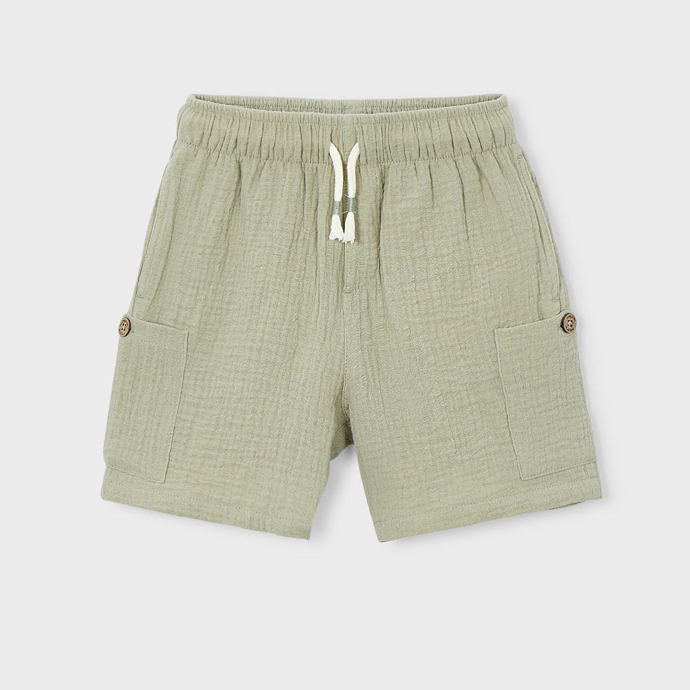 Η παιδική βερμούδα Mayoral από γκοφρέ ύφασμα σε κομψή χακί απόχρωση αποτελεί ιδανική επιλογή για άνετες και στιλάτες καλοκαιρινές εμφανίσεις. Το ελαφρύ και διαπνέον βαμβακερό γκοφρέ ύφασμα χαρίζει δροσερή αίσθηση, ενώ η φυσική υφή του προσθέτει μοντέρνο χαρακτήρα χωρίς να τσαλακώνει εύκολα.Διαθέτει ελαστική μέση με κορδόνι, που προσαρμόζεται τέλεια στο σώμα του παιδιού, προσφέροντας άνεση και σταθερότητα όλη μέρα. Οι πρακτικές πλαϊνές τσέπες με διακοσμητικό κουμπί ολοκληρώνουν ένα σχέδιο που συνδυάζει λειτουργικότητα και διαχρονικό στυλ.