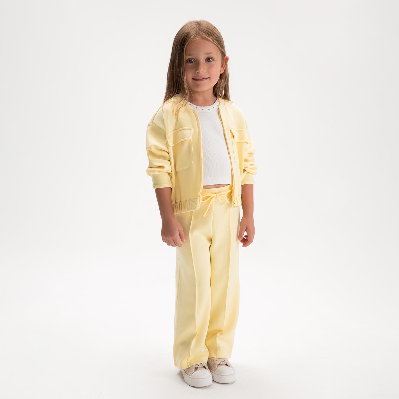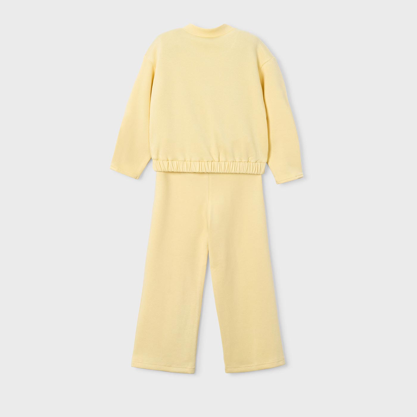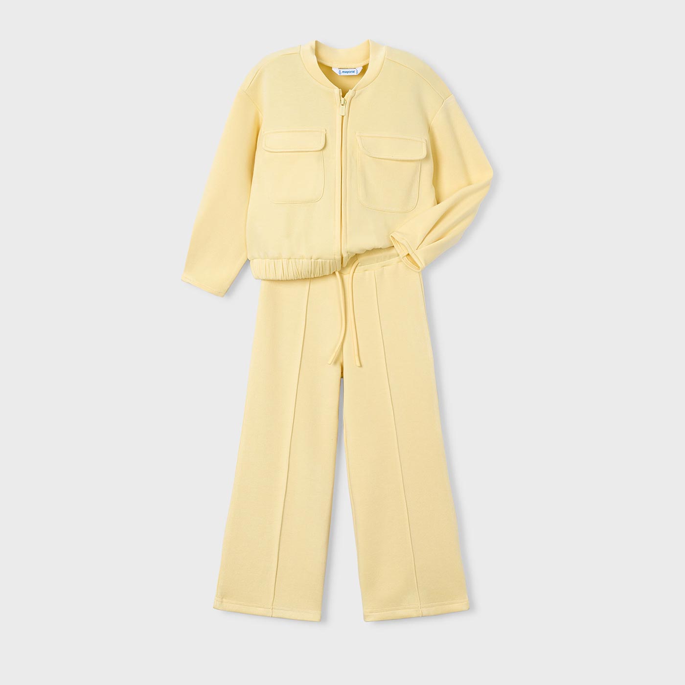 Μια κομψή και άνετη παιδική φόρμα Mayoral σε απαλή κίτρινη απόχρωση, ιδανική για καθημερινές εμφανίσεις με στυλ. Το σετ αποτελείται από ζακέτα με φερμουάρ και παντελόνι φόρμας, προσφέροντας πρακτικότητα και μοντέρνα αισθητική για κάθε στιγμή της ημέρας.Η ζακέτα είναι κατασκευασμένη από πικέ ύφασμα, διαθέτει στρογγυλή λαιμόκοψη, μπροστινό φερμουάρ και διακοσμητικές τσέπες, ενώ η ελαστική μέση στο τελείωμα εξασφαλίζει άνετη εφαρμογή. Το παντελόνι έχει ελαστική μέση με κορδόνι, ίσια γραμμή και απαλή υφή, ιδανική για ελευθερία κινήσεων.