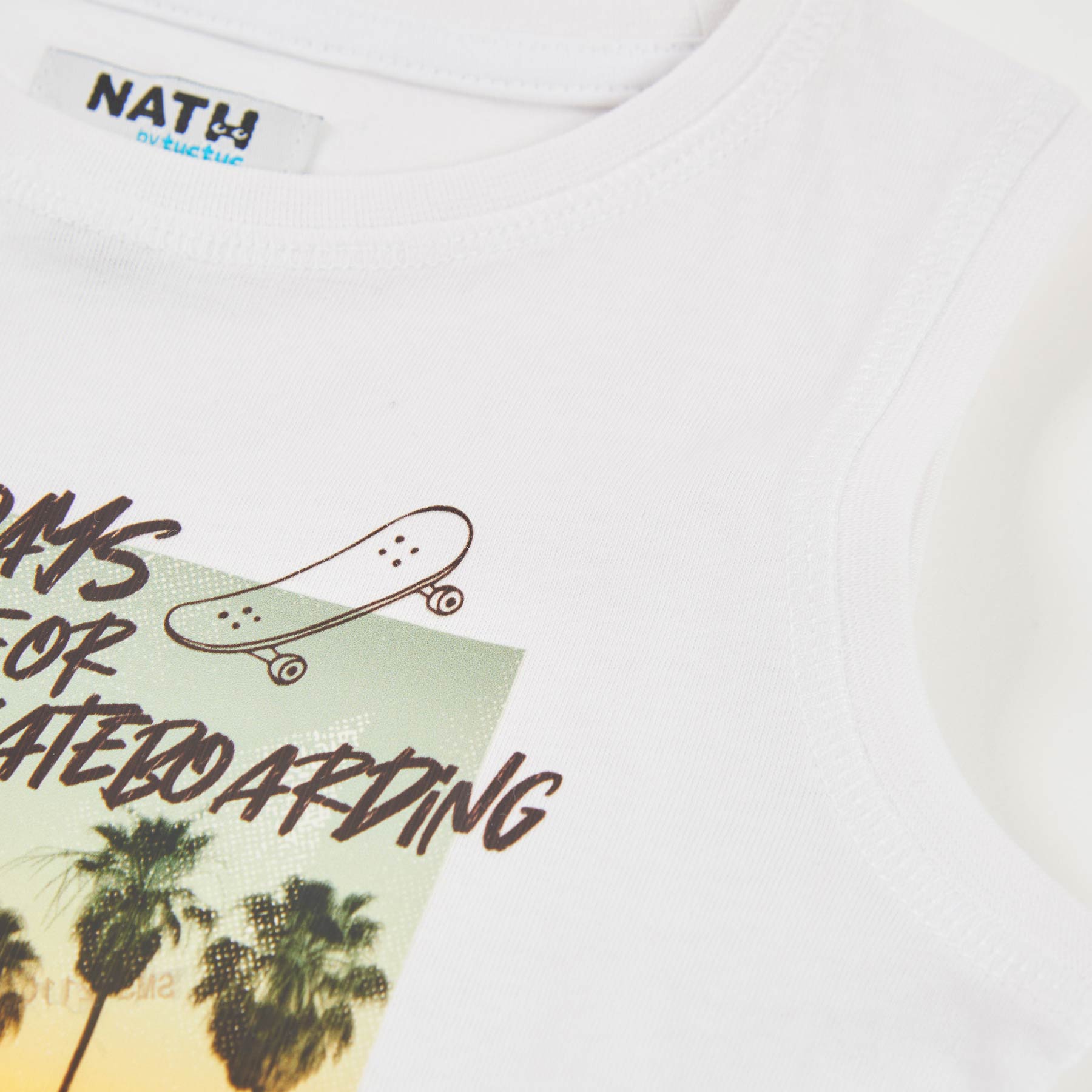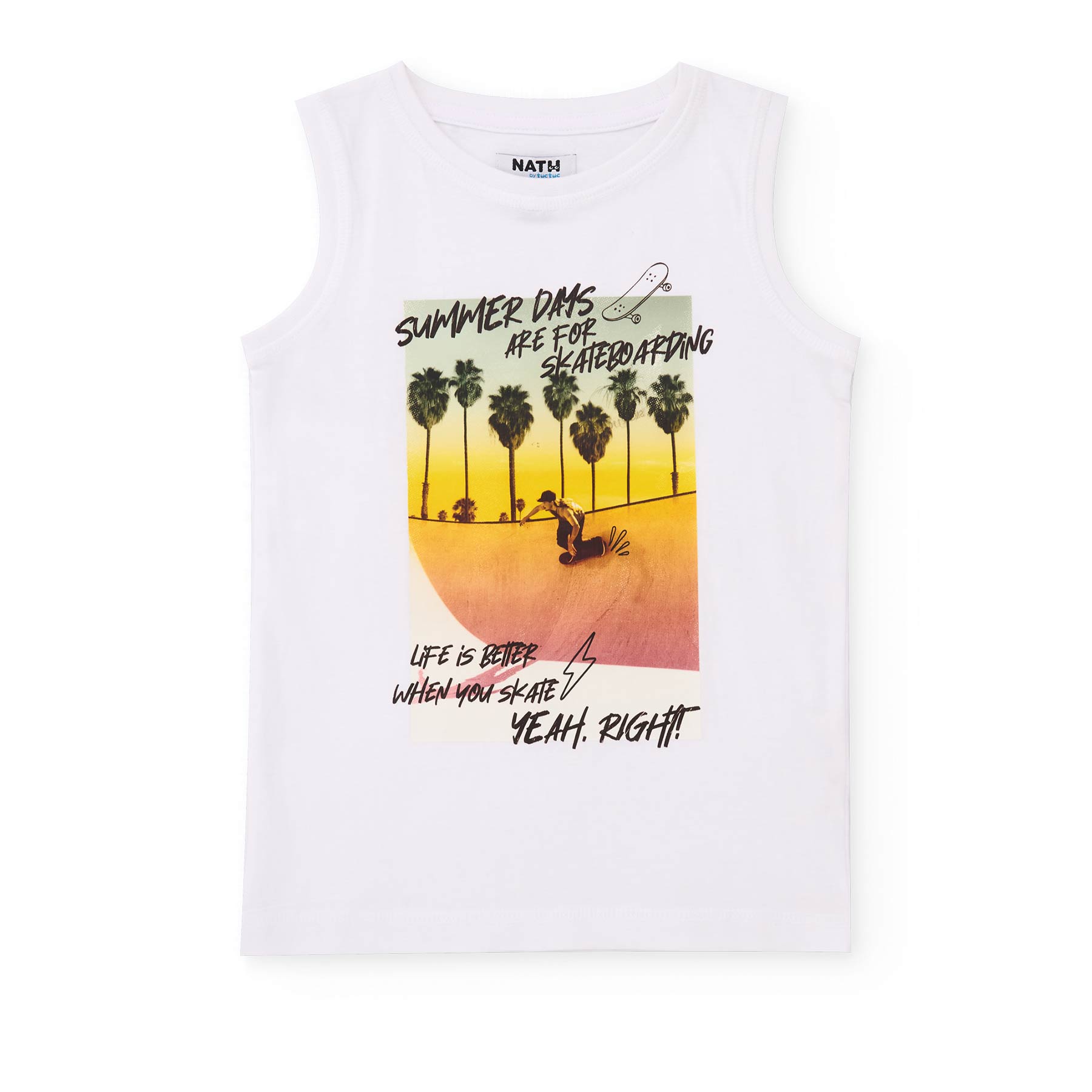 Η λευκή αμάνικη μπλούζα Nathkids είναι ιδανική για υψηλές θερμοκρασίες, προσφέροντας δροσερή αίσθηση και άνεση όλη μέρα. Το εντυπωσιακό print με skate θέμα και καλοκαιρινό φόντο δημιουργεί ένα δυναμικό και trendy look.