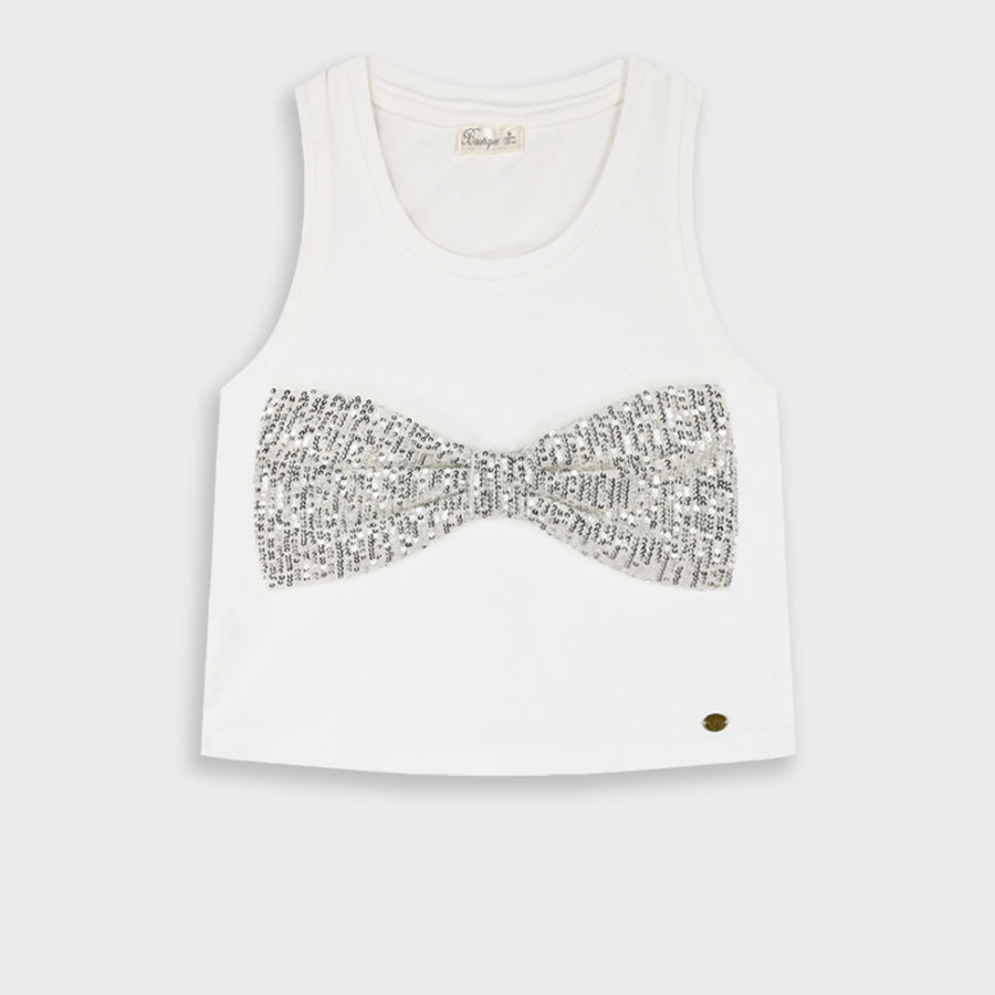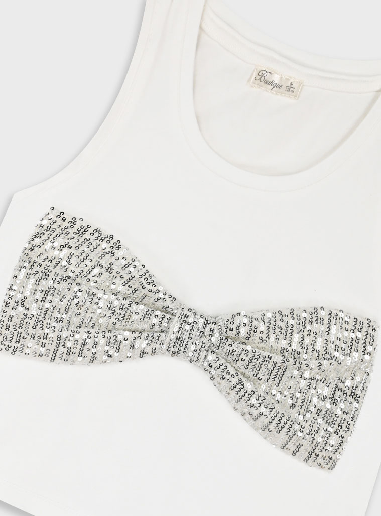 Η minimal γραμμή της μπλούζας απογειώνεται από τη διακοσμητική λεπτομέρεια με παγιέτες σε σχήμα φιόγκου στο μπροστινό μέρος, προσθέτοντας λάμψη και girly χαρακτήρα. Ιδανική επιλογή για εμφανίσεις που ξεχωρίζουν, από καθημερινές βόλτες έως πιο ιδιαίτερες περιστάσεις.