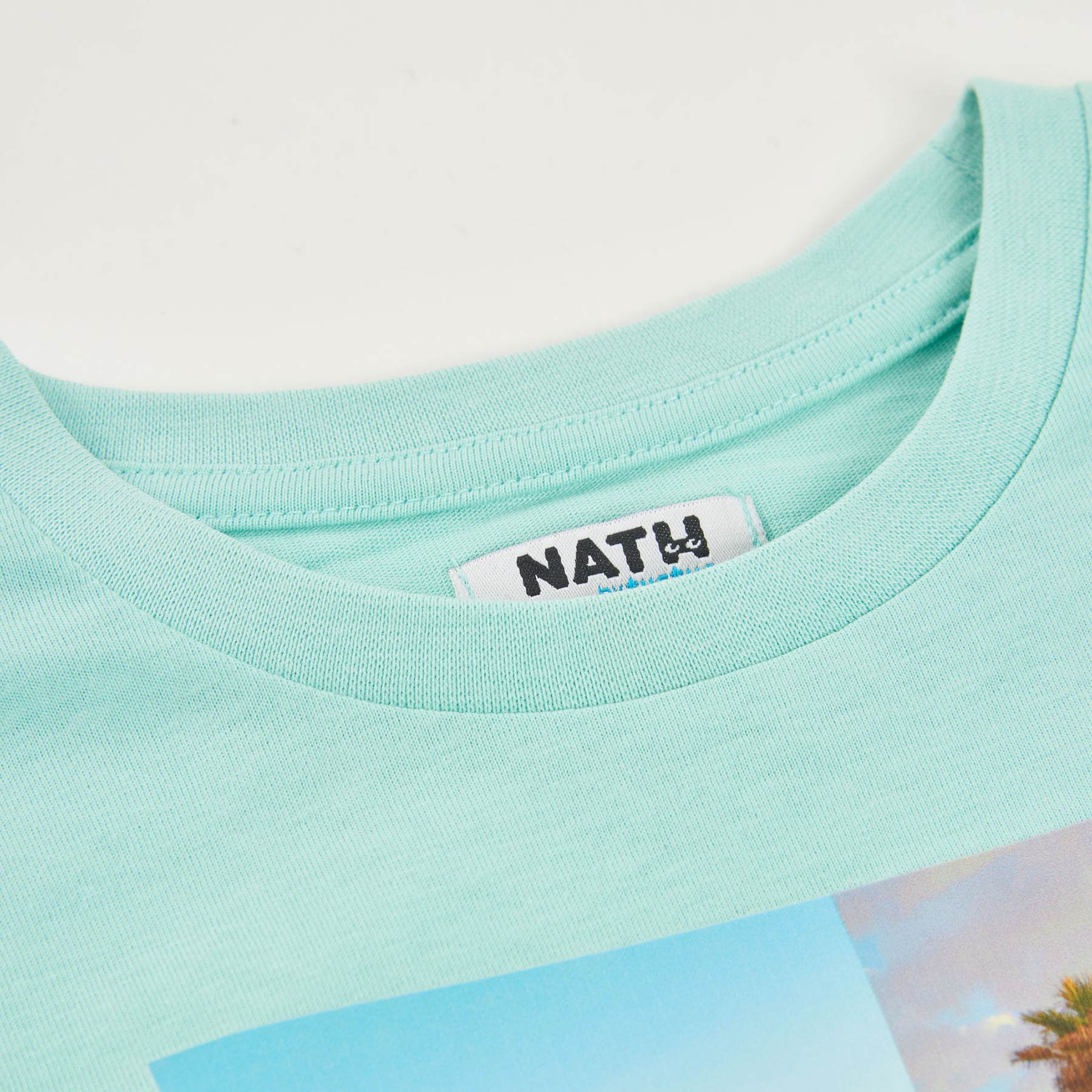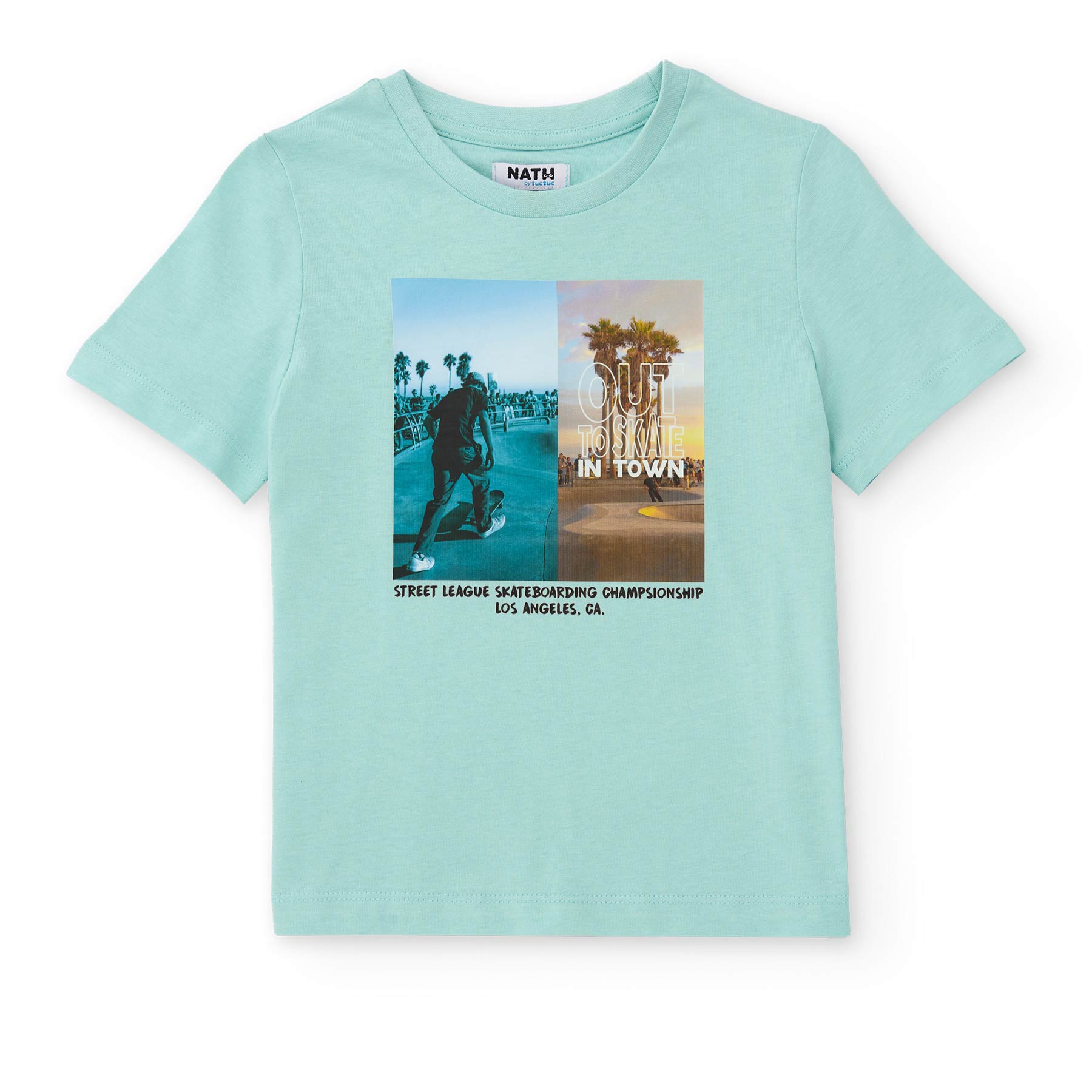 Η γαλάζια παιδική μπλούζα Nathkids συνδυάζει άνεση και σύγχρονο design. Το καλοκαιρινό skate θέμα με φοίνικες και urban αισθητική δημιουργεί ένα trendy look που αγαπούν τα αγόρια.
