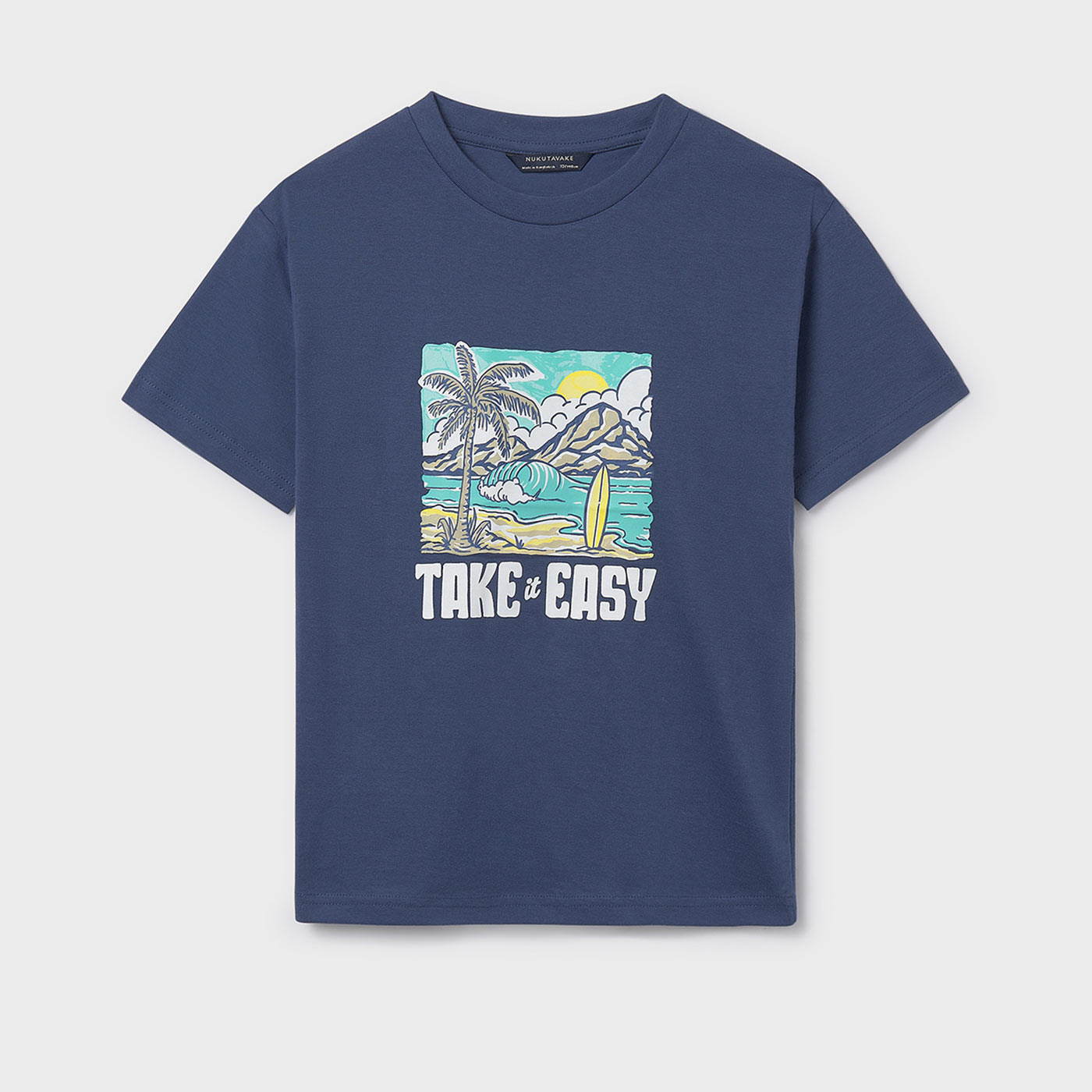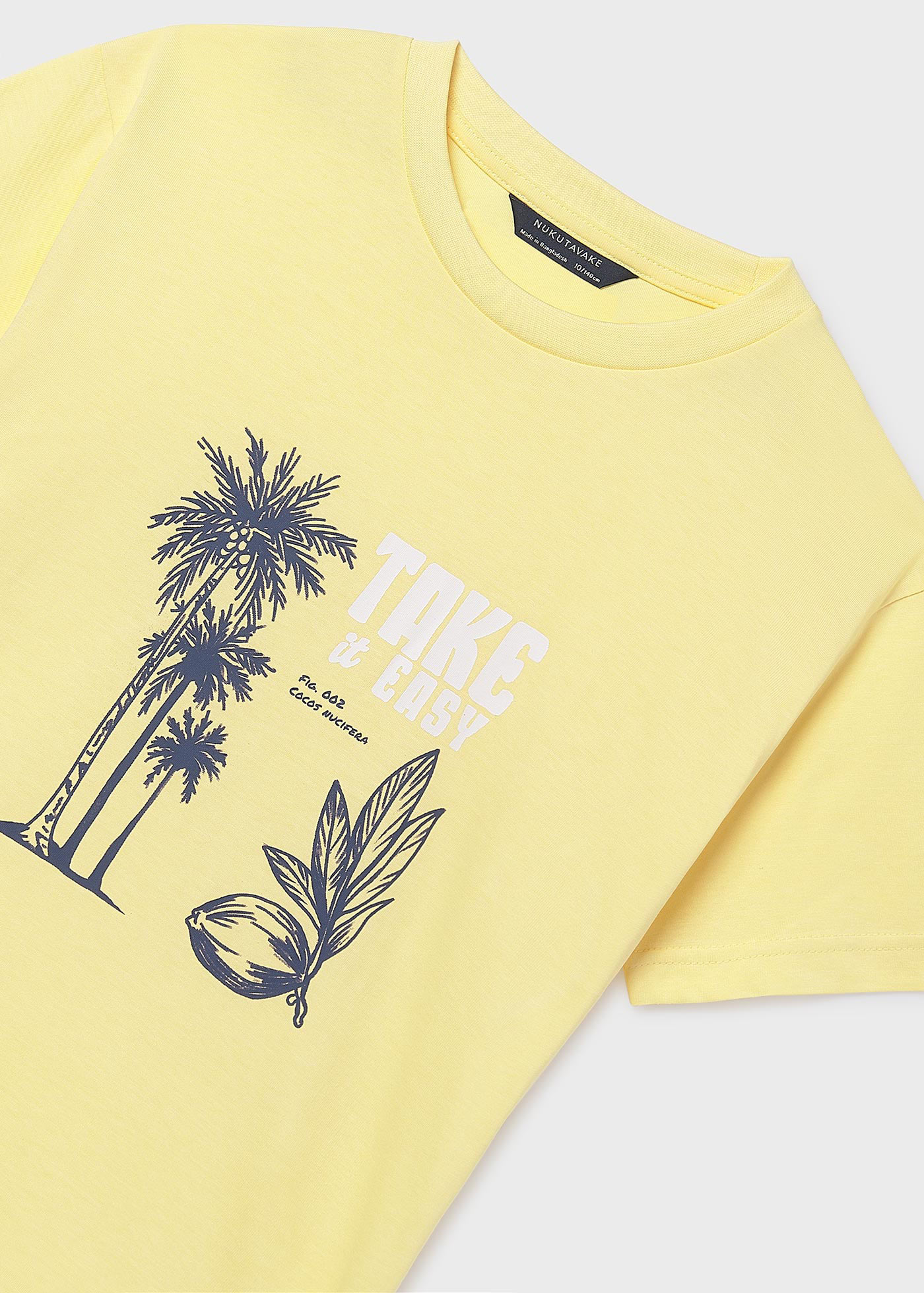 Το σετ παιδικές μπλούζες για αγόρια Mayoral (Nukutavake) 2 τεμαχίων αποτελεί ιδανική επιλογή για άνετες και στιλάτες καλοκαιρινές εμφανίσεις. Περιλαμβάνει δύο κοντομάνικες μπλούζες σε μοντέρνους χρωματικούς συνδυασμούς κίτρινο και μαρέν, που φοριούνται εύκολα κάθε μέρα.Η μία μπλούζα διαθέτει τροπικό print με μήνυμα Take it Easy, εμπνευσμένο από καλοκαιρινά τοπία, ενώ η δεύτερη έχει εντυπωσιακό graphic σχέδιο surf & παραλίας, προσδίδοντας μοντέρνο και νεανικό χαρακτήρα. Είναι κατασκευασμένες από μαλακό βαμβακερό ύφασμα, φιλικό προς το παιδικό δέρμα, που εξασφαλίζει άνεση και δροσερή αίσθηση όλη μέρα.Η άνετη γραμμή και η ποιοτική κατασκευή τις καθιστούν ιδανικές για σχολείο, βόλτες, διακοπές και καθημερινή χρήση.