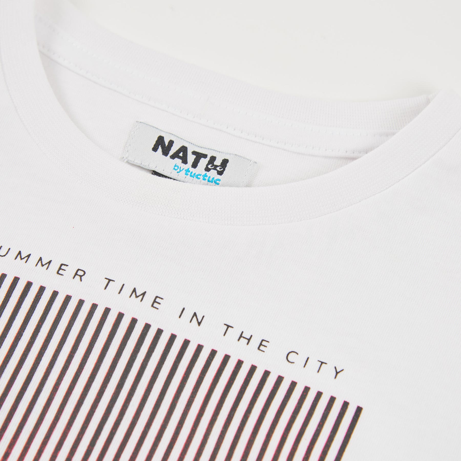 Η παιδική μπλούζα για αγόρια Nathkids σε λευκό χρώμα είναι μια μοντέρνα και ευκολοσυνδύαστη επιλογή για καθημερινές casual εμφανίσεις με urban αισθητική. Ξεχωρίζει για το εντυπωσιακό μπροστινό τύπωμα με skyline πόλης, φοίνικα και γραμμικό σχέδιο σε μαύρο και κόκκινο, που παραπέμπει σε Miami vibes και καλοκαιρινό city style. Η κλασική στρογγυλή λαιμόκοψη και η άνετη γραμμή προσφέρουν σωστή εφαρμογή και ελευθερία κινήσεων, ενώ το απαλό ύφασμα εξασφαλίζει άνεση καθ όλη τη διάρκεια της ημέρας, στο σχολείο, στη βόλτα ή στις δραστηριότητες. Το λευκό χρώμα συνδυάζεται εύκολα με τζιν, βερμούδες ή φόρμες, δημιουργώντας ολοκληρωμένα sporty και casual σύνολα. Μια στιλάτη παιδική μπλούζα Nathkids για αγόρια που συνδυάζει άνεση, ποιότητα και σύγχρονο design, ιδανική για αγόρια που αγαπούν το δυναμικό, νεανικό look.