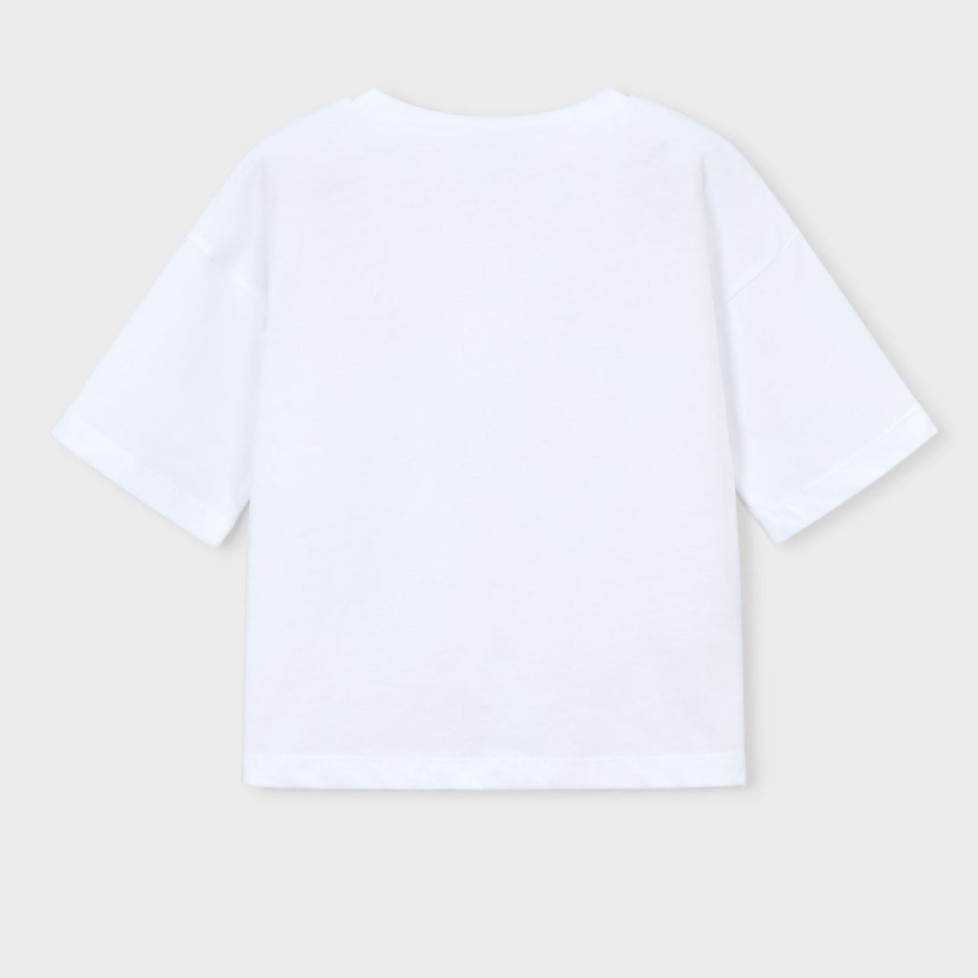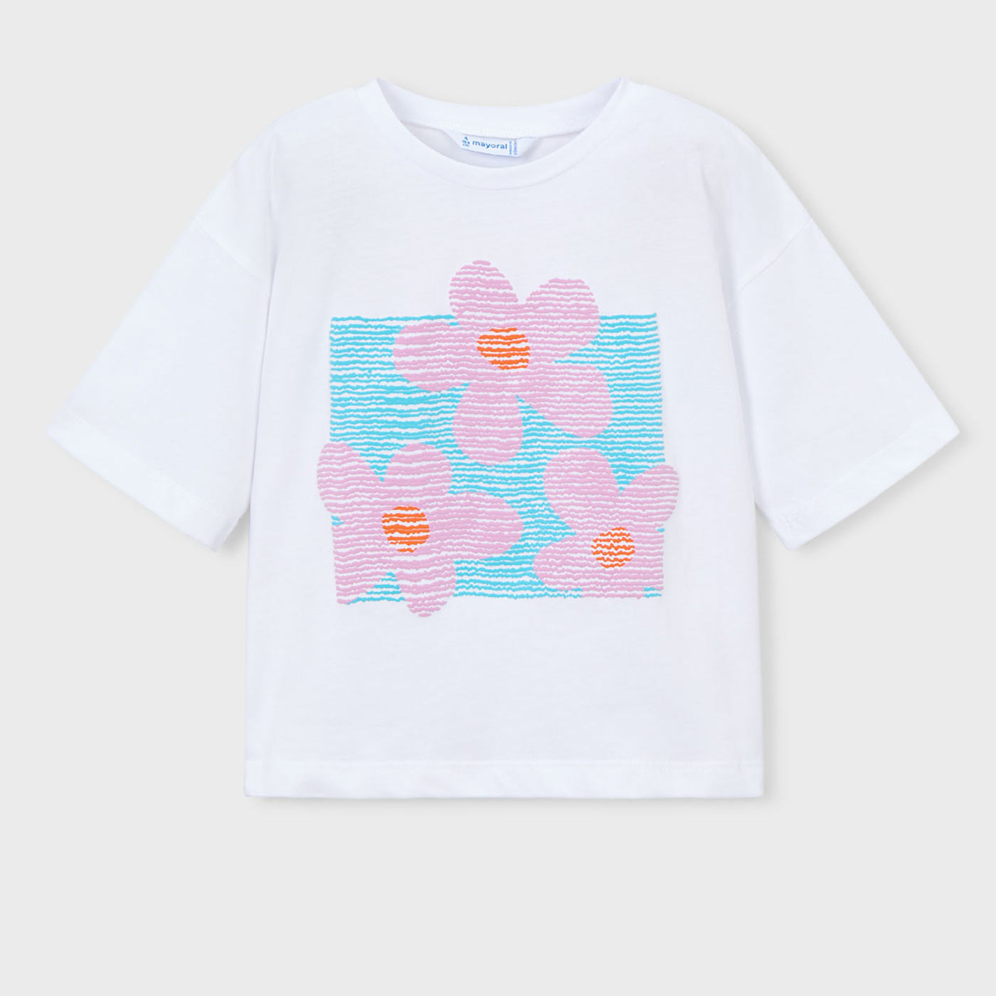 Απαλή, χαρούμενη και απόλυτα καλοκαιρινή, αυτή η παιδική μπλούζα Mayoral για κορίτσια αποτελεί ιδανική επιλογή για άνετες και στιλάτες εμφανίσεις. Είναι κατασκευασμένη από μαλακό βαμβακερό μακό ύφασμα σε φωτεινή λευκή απόχρωση, προσφέροντας δροσερή αίσθηση και άνεση όλη μέρα.Ξεχωρίζει για το μοντέρνο print με μεγάλα λουλούδια σε λιλά και ροζ τόνους, πάνω σε γαλάζιο φόντο με διακριτικό ριγέ εφέ, που χαρίζει παιχνιδιάρικο και girly χαρακτήρα. Η άνετη, χαλαρή γραμμή την καθιστά ιδανική για καθημερινή χρήση και ελευθερία κινήσεων.