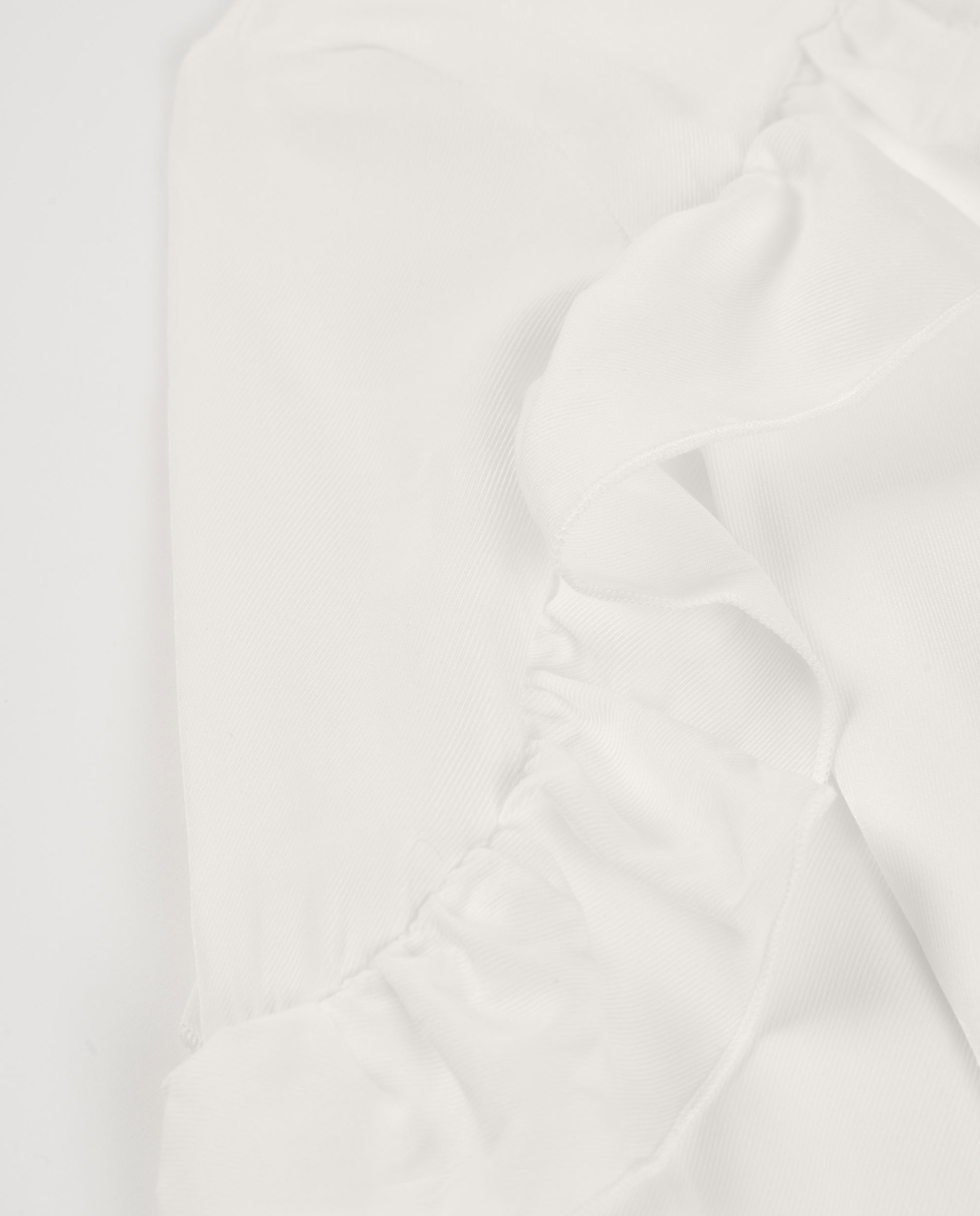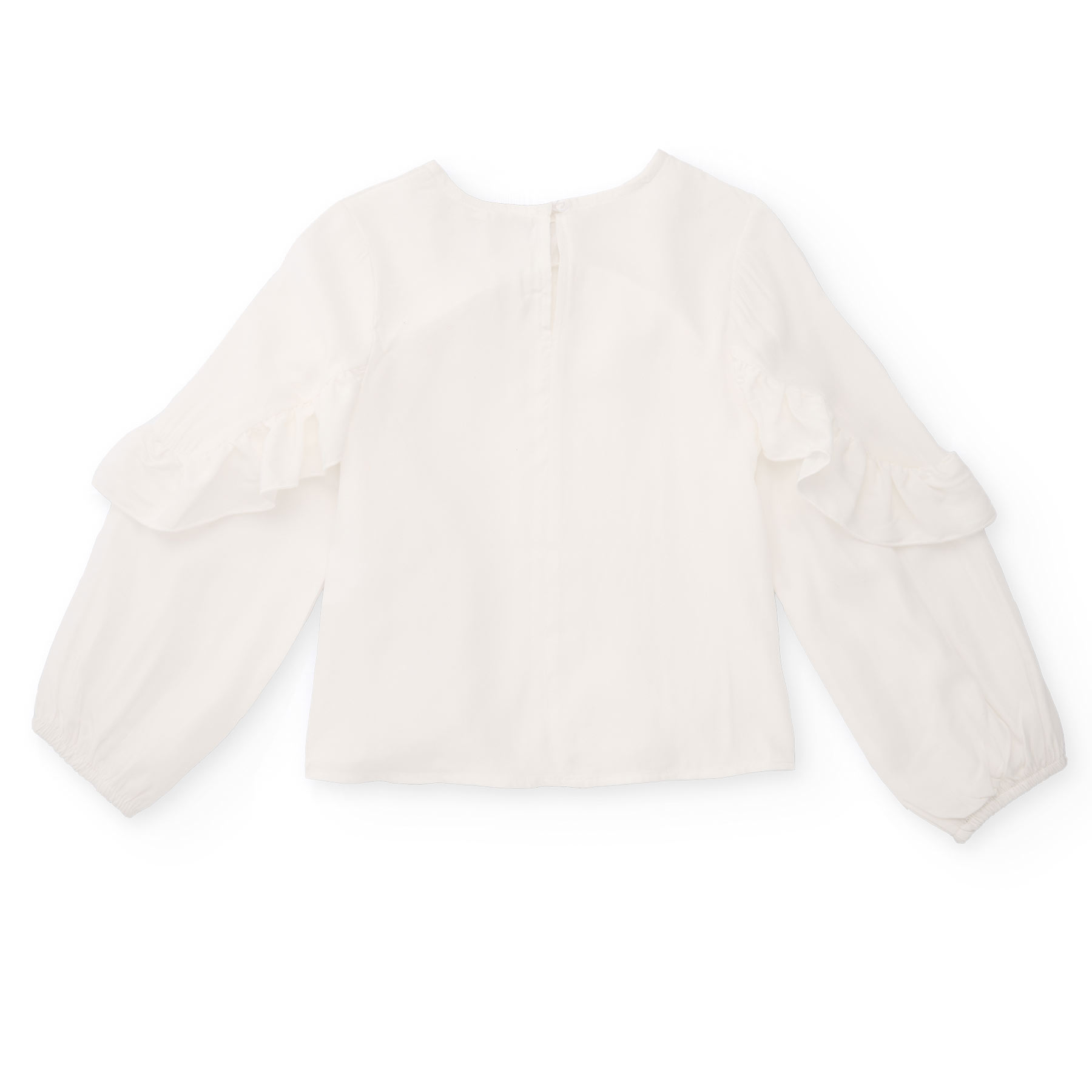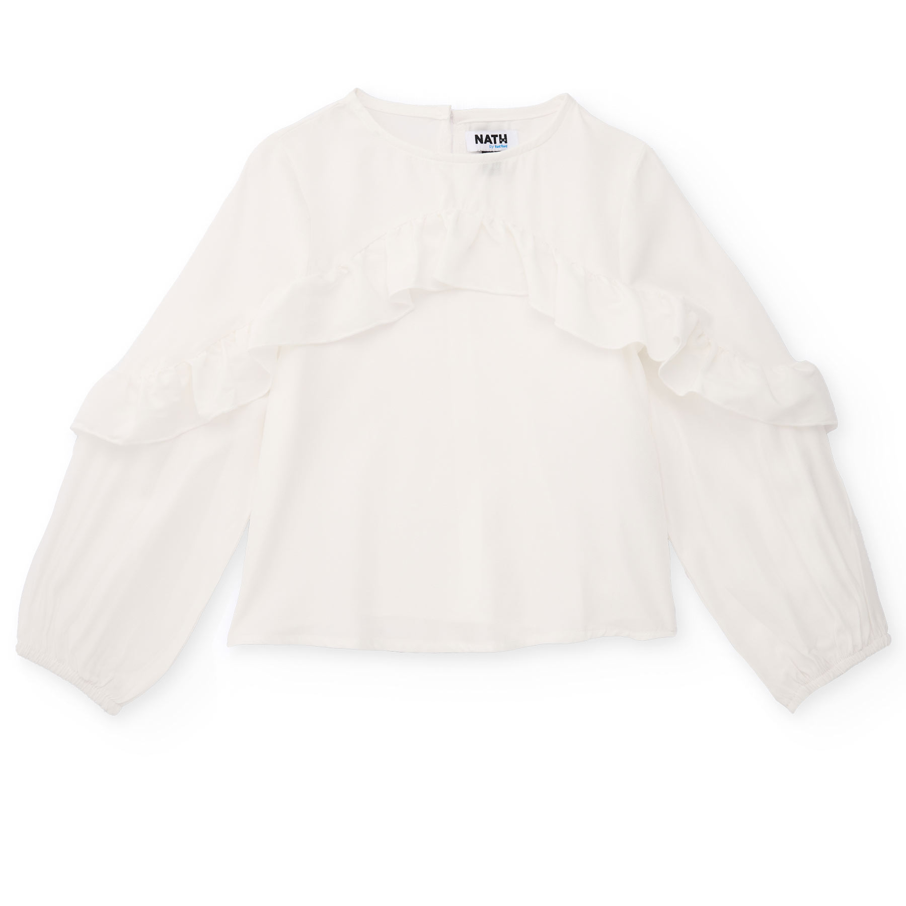 Χαρίστε στην μικρή σας κομψότητα και άνεση με αυτή τη λευκή παιδική μπλούζα Nathkids για κορίτσια. Φτιαγμένη από απαλό και ανάλαφρο ύφασμα, διαθέτει εντυπωσιακό βολάν στο μπροστινό μέρος και στα μανίκια, που χαρίζει ρομαντική και girly διάθεση σε κάθε εμφάνιση. Τα μακριά μανίκια με ελαστικό τελείωμα εξασφαλίζουν άνετη εφαρμογή και ευκολία στην κίνηση, ενώ το κουμπάκι στο πίσω μέρος διευκολύνει το ντύσιμο.