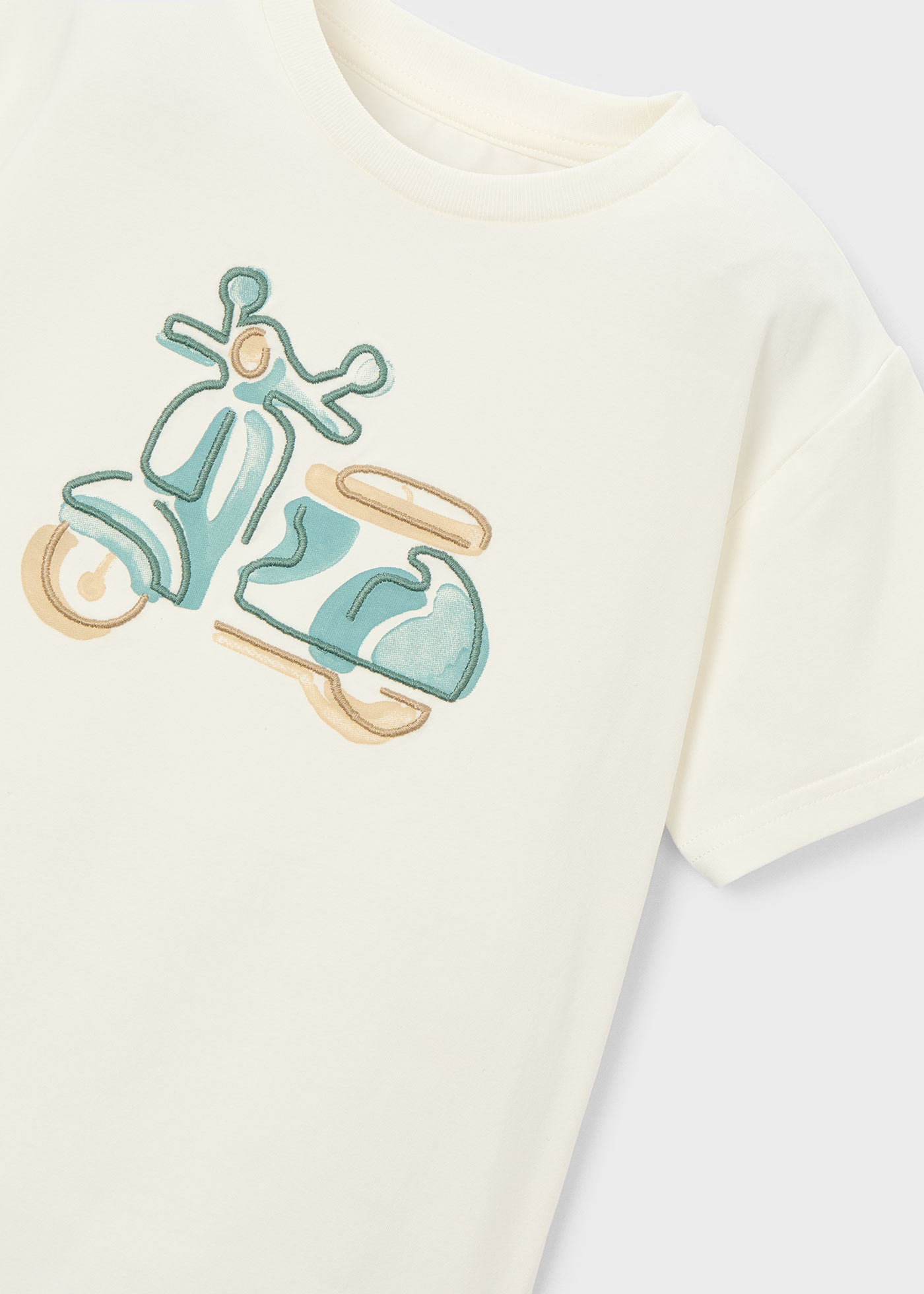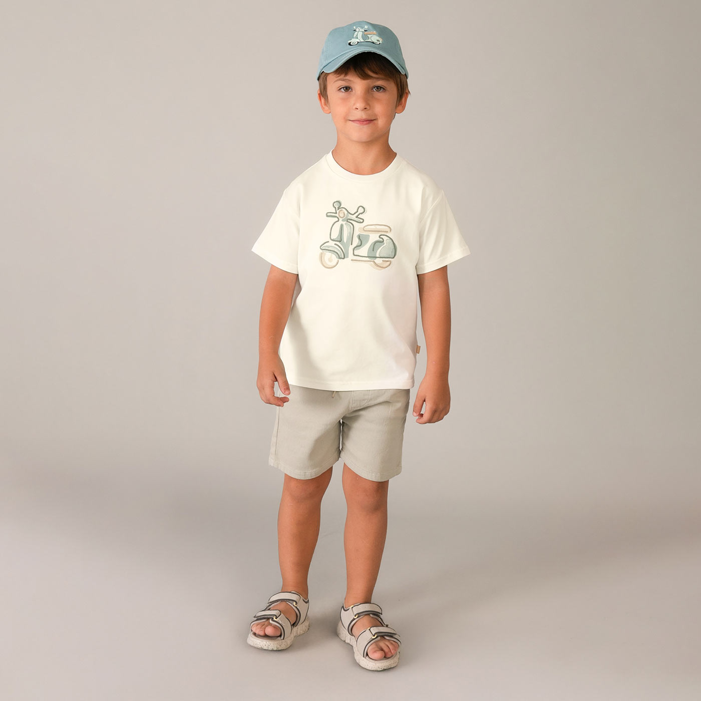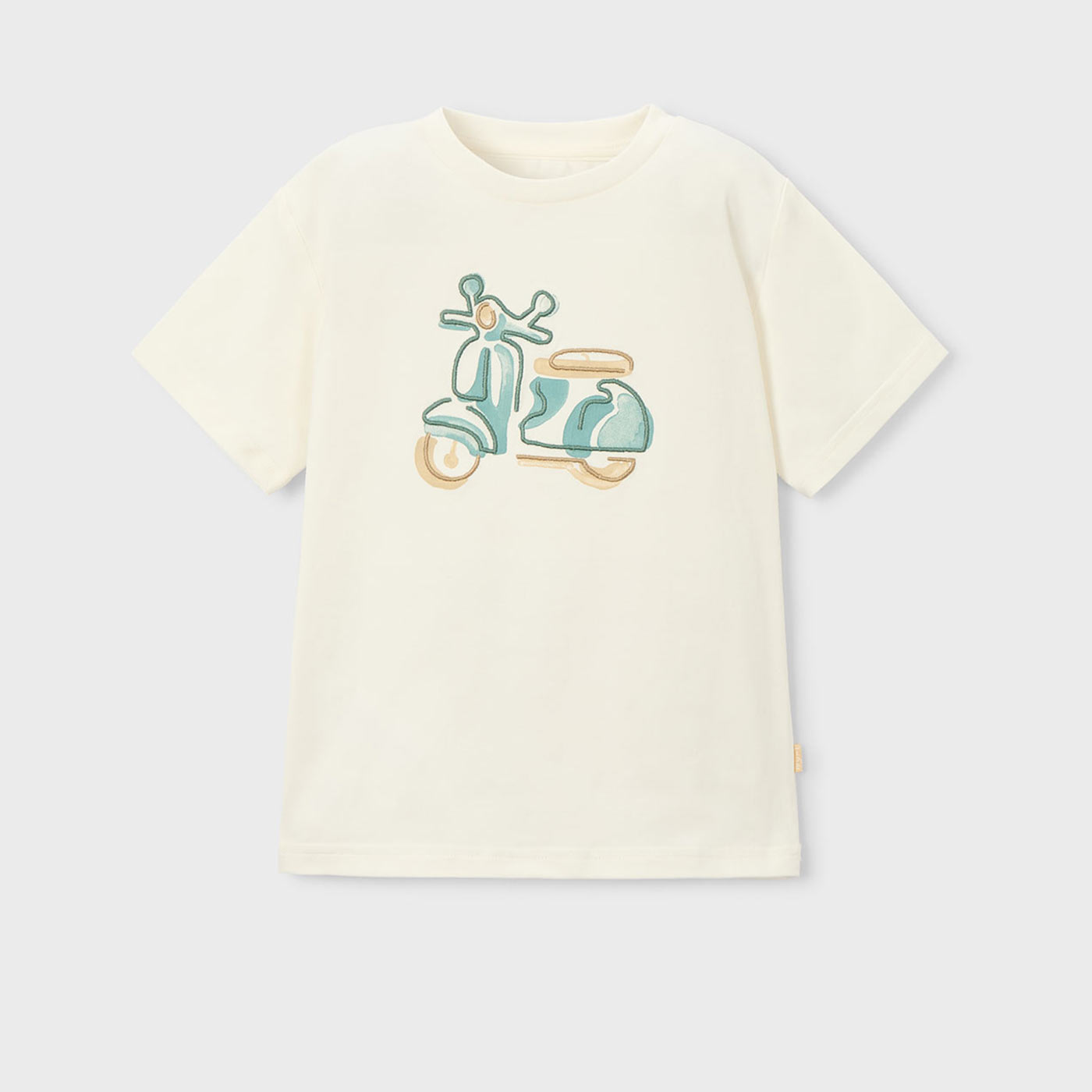 Η παιδική μπλούζα Mayoral για αγόρια σε κομψό κρεμ χρώμα αποτελεί ιδανική επιλογή για άνετα και στιλάτα καλοκαιρινά σύνολα. Κατασκευασμένη από απαλό, ποιοτικό βαμβάκι, προσφέρει δροσερή αίσθηση και άνεση όλη μέρα, ακόμα και στις πιο ζεστές ημέρες.Το ιδιαίτερο κεντητό σχέδιο με βέσπα στο μπροστινό μέρος χαρίζει παιχνιδιάρικο αλλά κομψό χαρακτήρα, κάνοντάς τη μπλούζα να ξεχωρίζει. Η κλασική γραμμή με στρογγυλή λαιμόκοψη και κοντό μανίκι την καθιστά εύκολη στο συνδυασμό με βερμούδες, σορτς ή παντελόνια, για καθημερινές αλλά και πιο προσεγμένες εμφανίσεις.