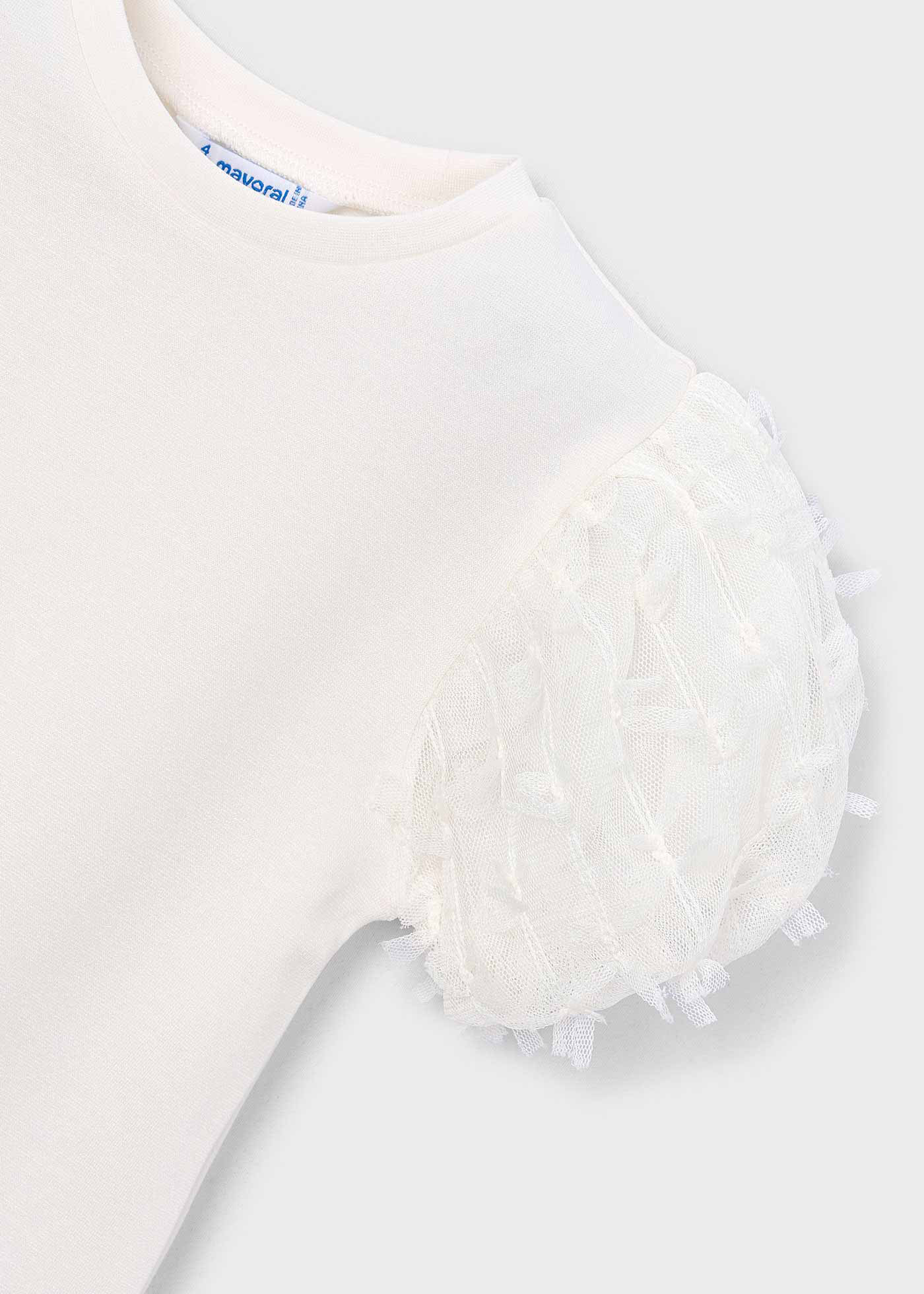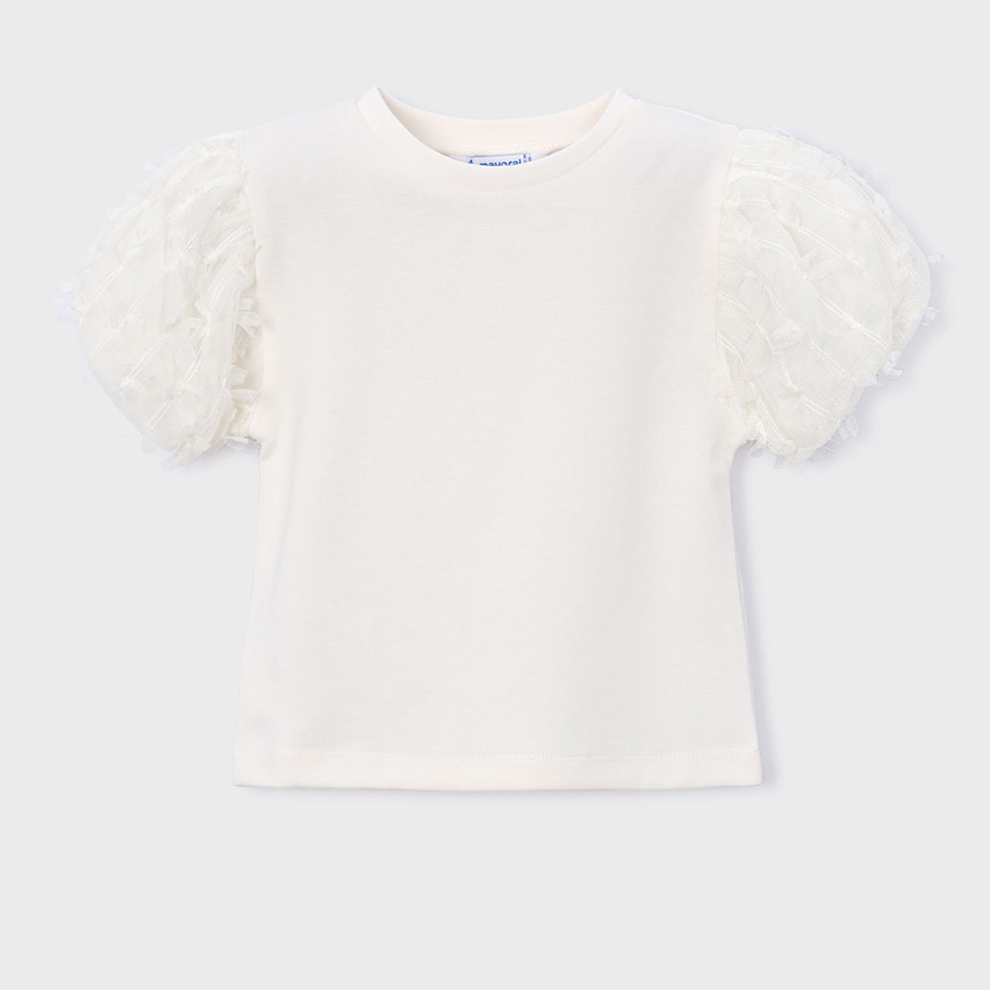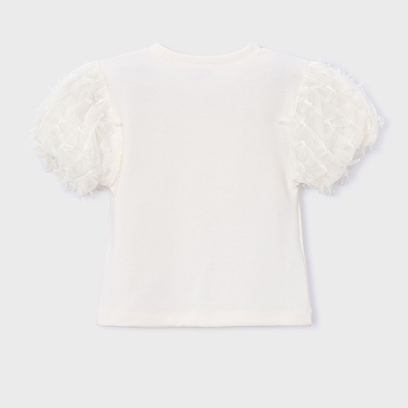 Η παιδική κοντομάνικη μπλούζα Mayoral σε εκρού απόχρωση είναι μια κομψή και άνετη επιλογή για κορίτσια που αγαπούν το ρομαντικό στυλ. Ξεχωρίζει για τα εντυπωσιακά μανίκια με τούλι και διακριτικές λεπτομέρειες, που χαρίζουν αέρινη υφή και φίνο αποτέλεσμα. Ιδανική για καθημερινές αλλά και πιο ιδιαίτερες εμφανίσεις, συνδυάζεται εύκολα με φούστες, σορτς ή παντελόνια.Κατασκευασμένη από απαλό, ποιοτικό ύφασμα, προσφέρει άνεση όλη μέρα, ενώ η ουδέτερη εκρού απόχρωση την καθιστά ευκολοφόρετη σε κάθε περίσταση.