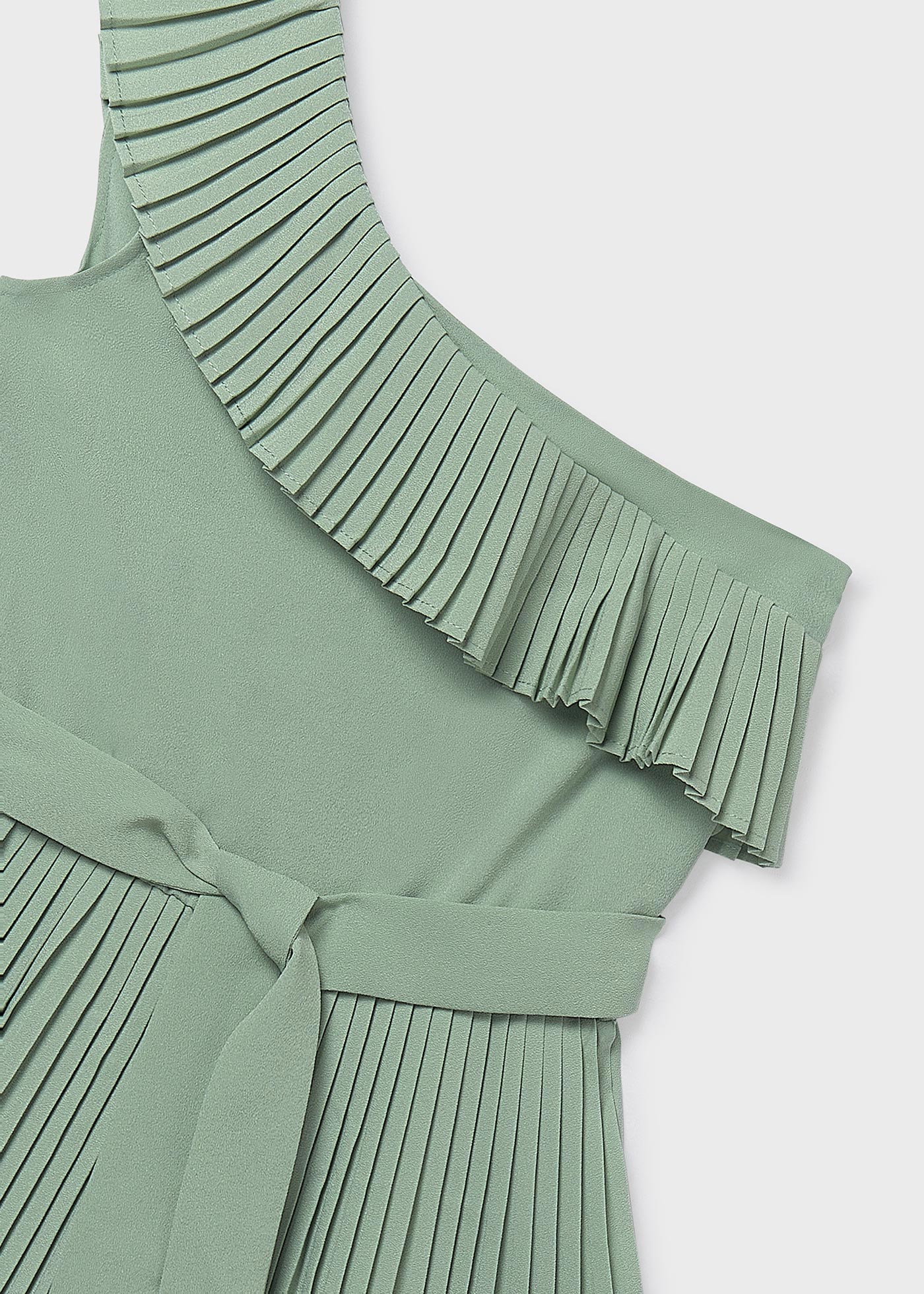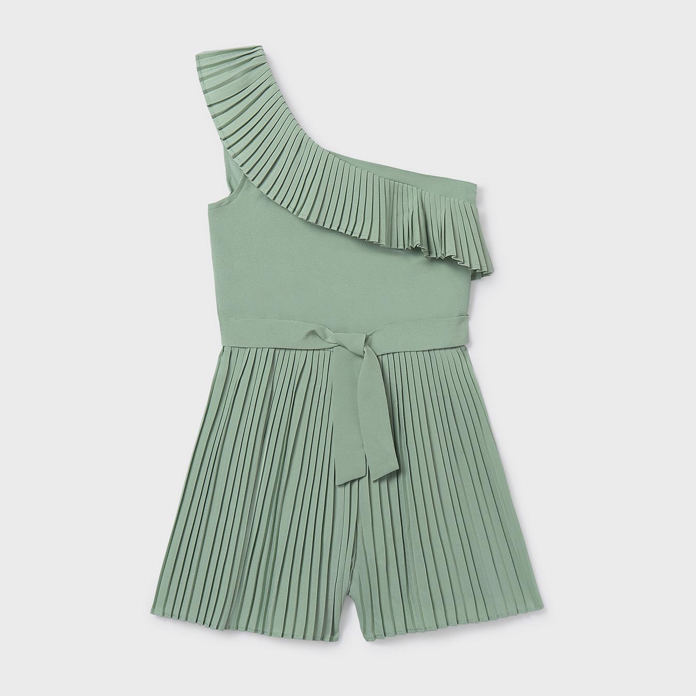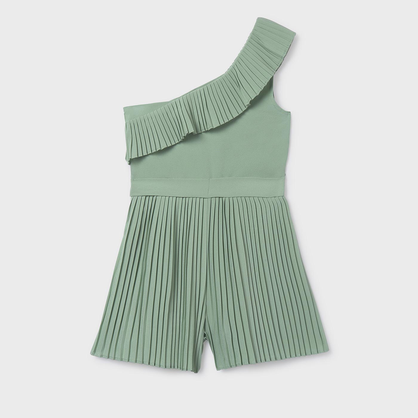 Ανανεώστε την καλοκαιρινή γκαρνταρόμπα με την κομψή παιδική ολόσωμη φόρμα Mayoral σε υπέροχη μέντα απόχρωση, ιδανική για κορίτσια που αγαπούν τη μόδα και την άνεση. Πρόκειται για κοντή φόρμα (playsuit) με μοντέρνο one shoulder σχέδιο και εντυπωσιακό πλισέ τελείωμα, που χαρίζει κίνηση και αέρινη αίσθηση.Η διακριτική βολάν λεπτομέρεια στον ώμο και η ζώνη που δένει στη μέση αναδεικνύουν τη σιλουέτα, ενώ το ανάλαφρο ύφασμα εξασφαλίζει άνεση ακόμα και τις πιο ζεστές ημέρες. Είναι η τέλεια επιλογή για καλοκαιρινές εκδηλώσεις, διακοπές, γιορτές ή ιδιαίτερες εμφανίσεις.