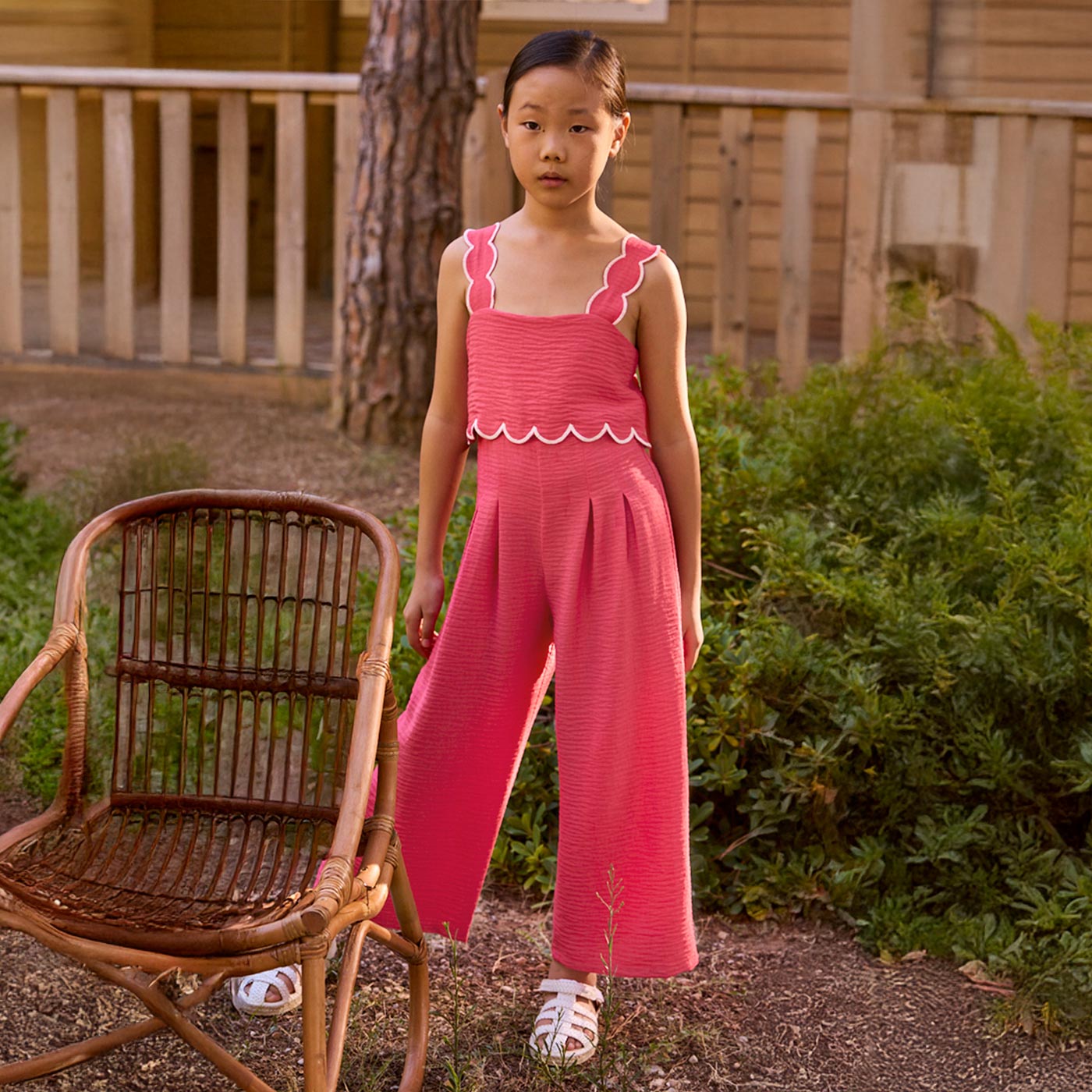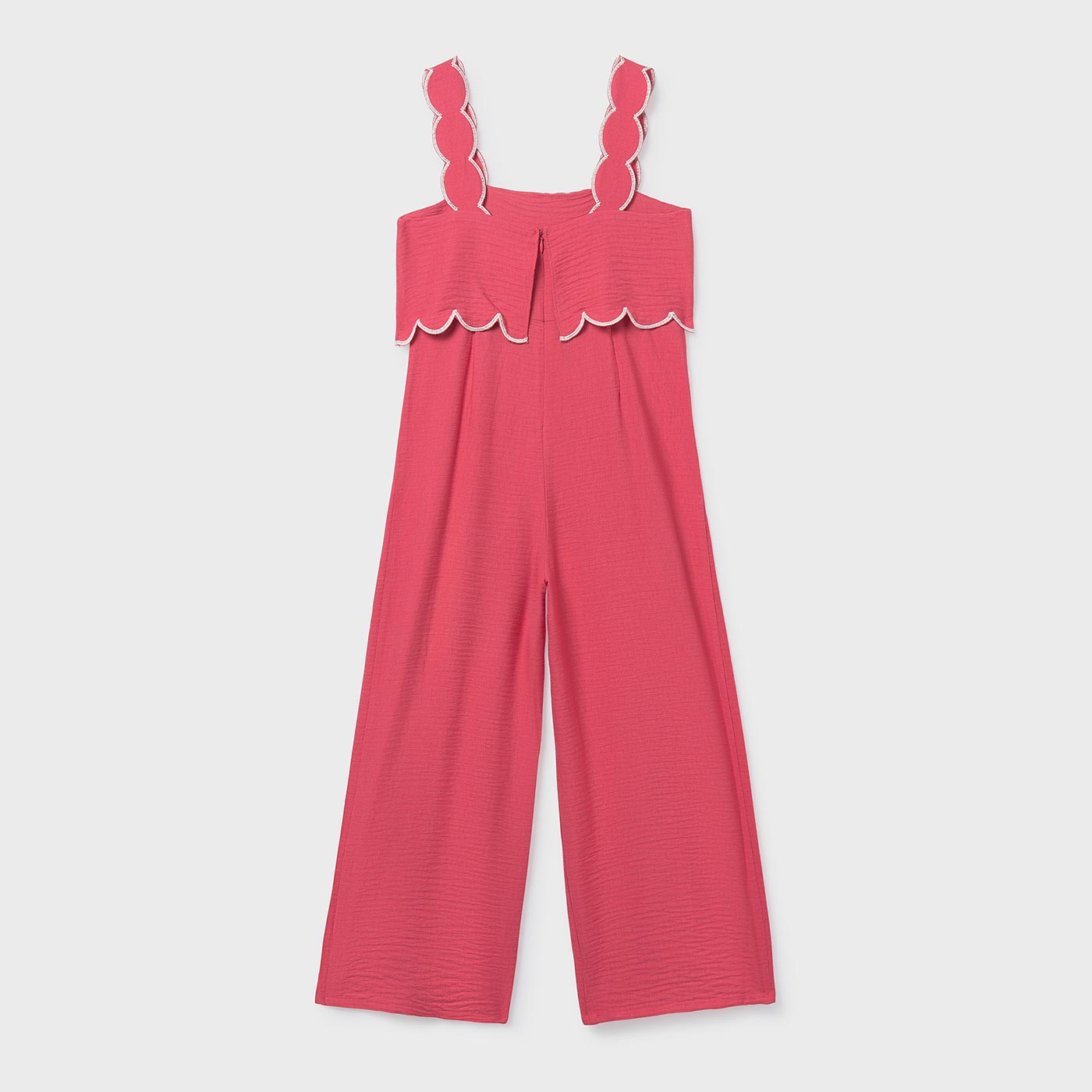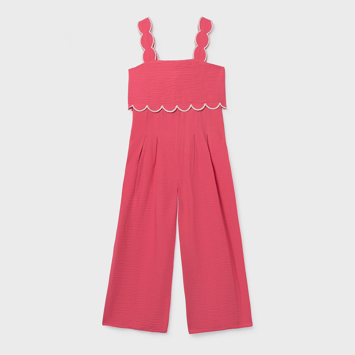 Ανανεώστε την καλοκαιρινή γκαρνταρόμπα με αυτή την κομψή παιδική ολόσωμη φόρμα Mayoral σε κοραλί απόχρωση, ιδανική για κορίτσια που αγαπούν το στυλ και την άνεση. Με μοντέρνο σχεδιασμό και προσεγμένες λεπτομέρειες, αποτελεί μια εξαιρετική επιλογή για καθημερινές εμφανίσεις αλλά και πιο ιδιαίτερες περιστάσεις.Η φόρμα διαθέτει φαρδιές τιράντες με κυματιστό τελείωμα (scalloped) και διακριτική αντίθεση στο ρέλι, που χαρίζουν θηλυκότητα και καλοκαιρινό χαρακτήρα. Το πάνω μέρος εφαρμόζει άνετα, ενώ το φαρδύ παντελόνι προσφέρει ελευθερία κινήσεων και αέρινη αίσθηση, ιδανική για τις ζεστές ημέρες. Το ελαφρύ ύφασμα με απαλή υφή εξασφαλίζει δροσιά και άνεση καθ όλη τη διάρκεια της ημέρας.
