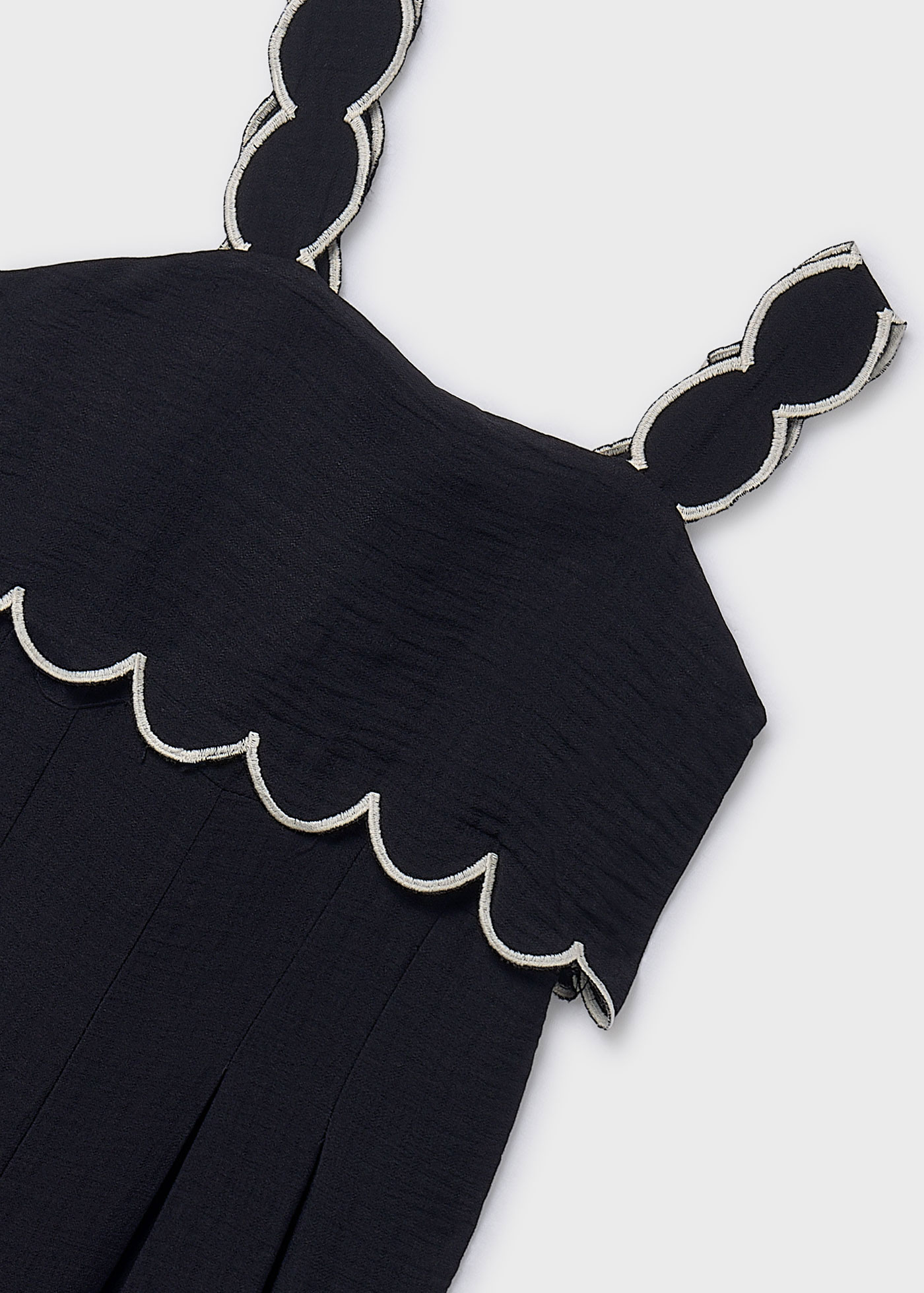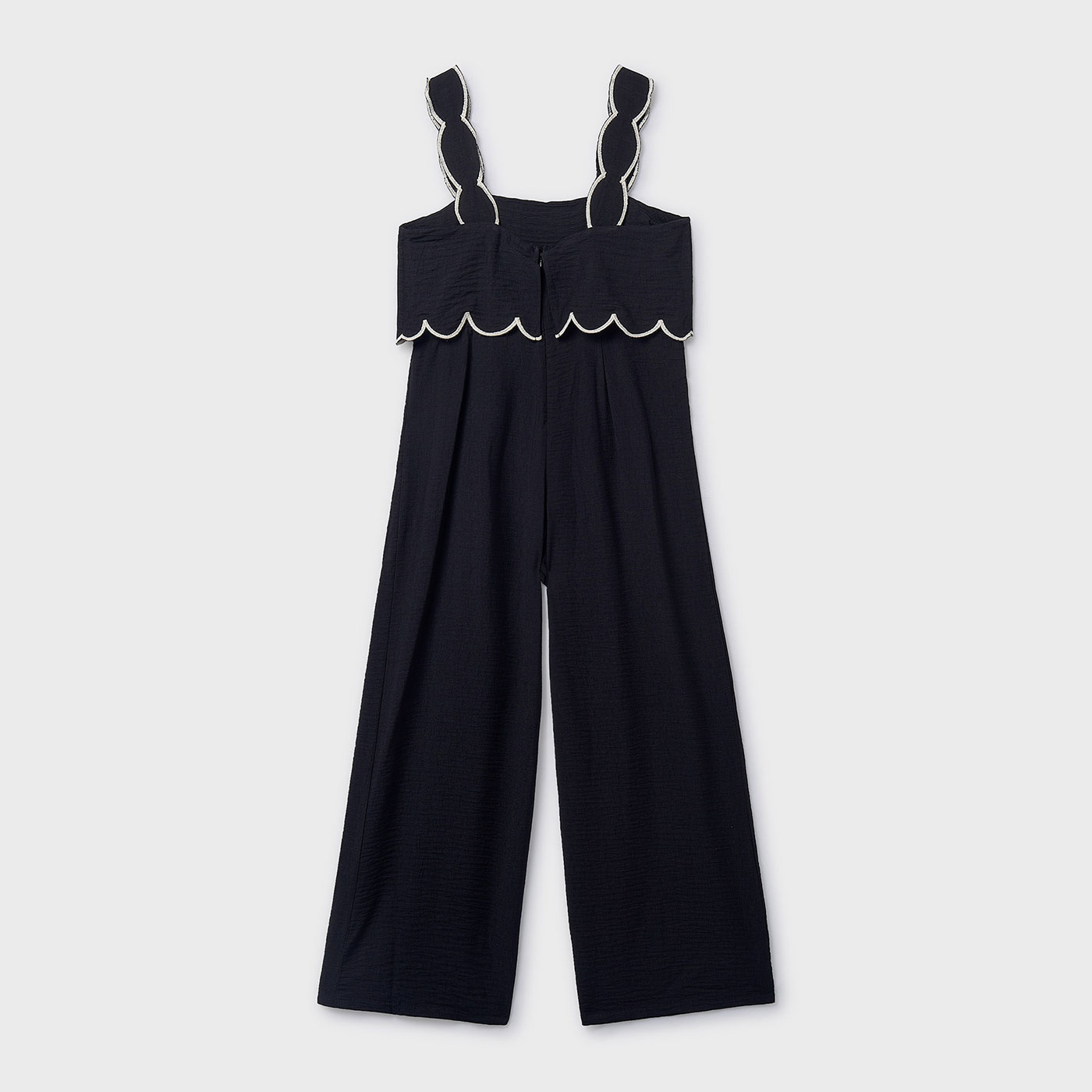Ανανεώστε την καλοκαιρινή γκαρνταρόμπα με αυτή την κομψή παιδική ολόσωμη φόρμα Mayoral σε μαύρη απόχρωση, ιδανική για κορίτσια που αγαπούν το στυλ και την άνεση. Με μοντέρνο σχεδιασμό και προσεγμένες λεπτομέρειες, αποτελεί μια εξαιρετική επιλογή για καθημερινές εμφανίσεις αλλά και πιο ιδιαίτερες περιστάσεις.Η φόρμα διαθέτει φαρδιές τιράντες με κυματιστό τελείωμα (scalloped) και διακριτική αντίθεση στο ρέλι, που χαρίζουν θηλυκότητα και καλοκαιρινό χαρακτήρα. Το πάνω μέρος εφαρμόζει άνετα, ενώ το φαρδύ παντελόνι προσφέρει ελευθερία κινήσεων και αέρινη αίσθηση, ιδανική για τις ζεστές ημέρες. Το ελαφρύ ύφασμα με απαλή υφή εξασφαλίζει δροσιά και άνεση καθ όλη τη διάρκεια της ημέρας.
