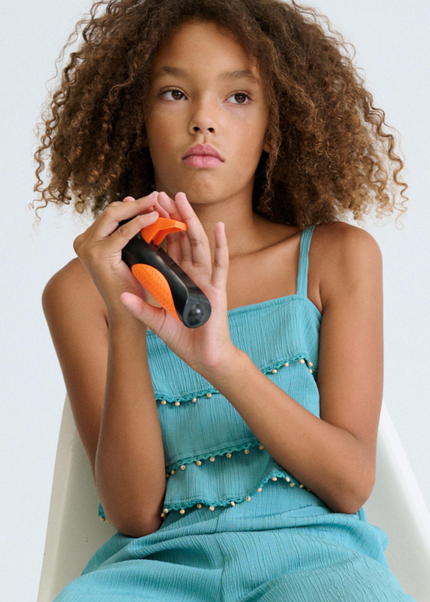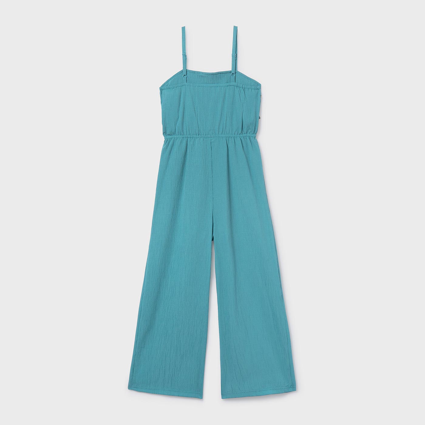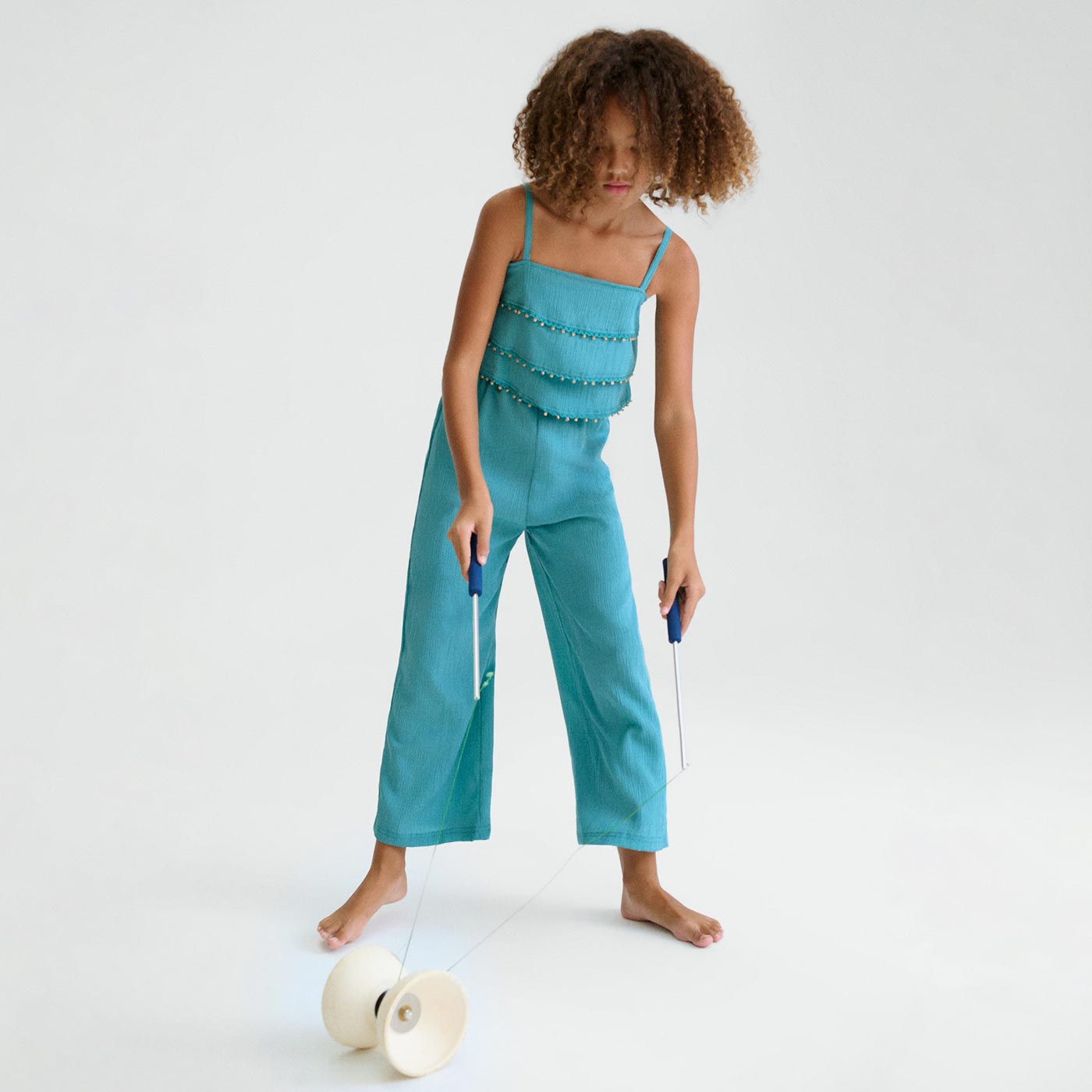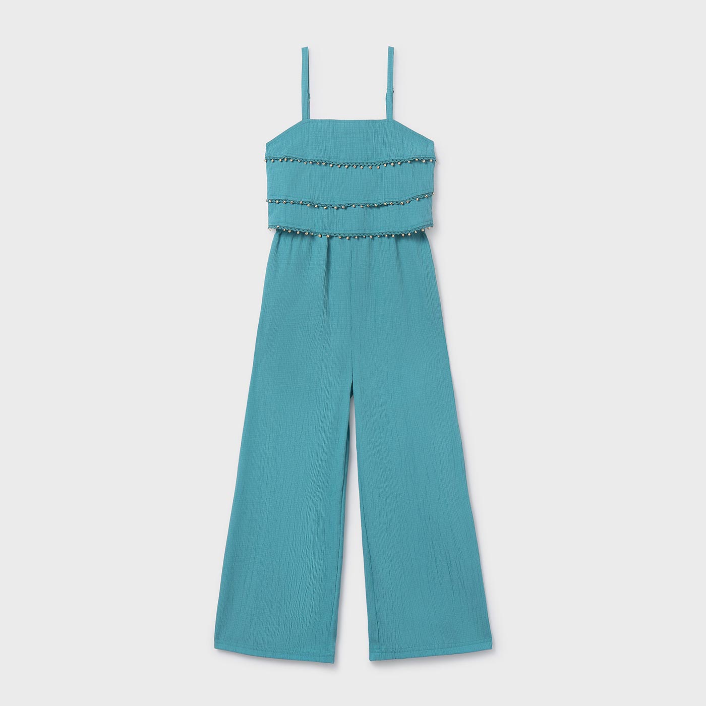 Η παιδική ολόσωμη φόρμα Mayoral σε πετρόλ απόχρωση είναι η ιδανική επιλογή για κορίτσια που αγαπούν το κομψό, ανάλαφρο και καλοκαιρινό στυλ. Κατασκευασμένη από δροσερό, ανάγλυφο ύφασμα, προσφέρει άνεση και ελευθερία κινήσεων, ενώ τα διακριτικά βολάν στο μπούστο με λεπτομέρειες τύπου crochet χαρίζουν μια ρομαντική και φίνα αισθητική.Διαθέτει λεπτές, ρυθμιζόμενες τιράντες για τέλεια εφαρμογή και ελαστική μέση που αγκαλιάζει απαλά το σώμα, εξασφαλίζοντας άνετη εφαρμογή όλη μέρα. Η μακριά, ίσια γραμμή στα πόδια προσδίδει κομψότητα και καθιστά τη φόρμα κατάλληλη τόσο για καθημερινές εμφανίσεις όσο και για πιο ιδιαίτερες περιστάσεις, όπως καλοκαιρινές εκδηλώσεις, βαπτίσεις ή διακοπές.Συνδυάζεται εύκολα με σανδάλια, εσπαντρίγιες ή ένα ελαφρύ τζάκετ, δημιουργώντας ένα ολοκληρωμένο και στιλάτο outfit.